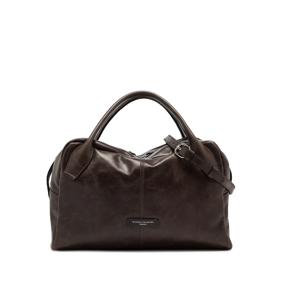 La borsa Emily by Gianni Chiarini Firenze presenta un'iconica forma a bauletto, realizzata in pelle effetto vintage e arricchita da dettagli in pelle coordinati. Dotata di una pratica tracolla in pelle regolabile, può essere portata al polso per un tocco di stile. La chiusura superiore con magnete offre un accesso facile e sicuro. Dimensioni: 33x20x15 cm.