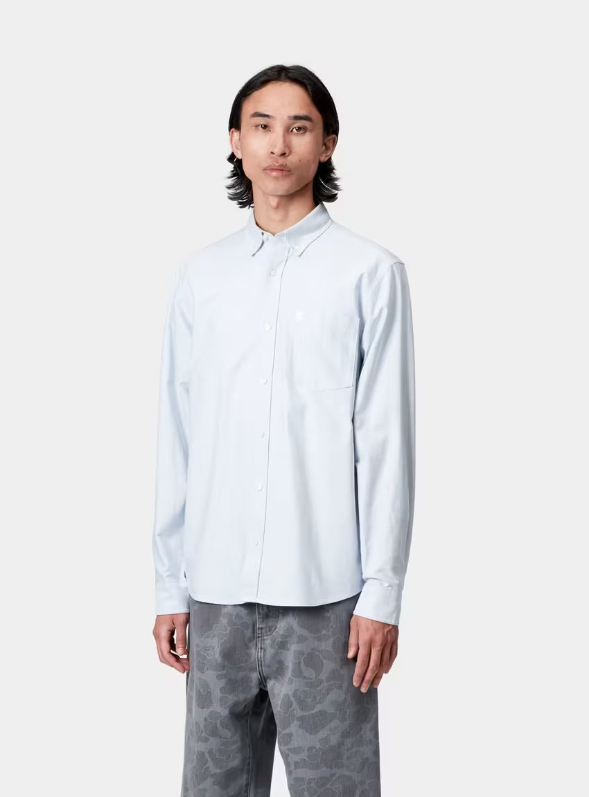 La L/S C-Logo Shirt è una camicia button-down realizzata in leggero cotone Oxford tinto in filo per un colore più intenso e duraturo. È inoltre stata sottoposta a lavaggio per maggior morbidezza. Il capo è caratterizzato da vestibilità normale ed è impreziosito da una tasca e dal discreto logo “C” di Carhartt WIP sul petto.