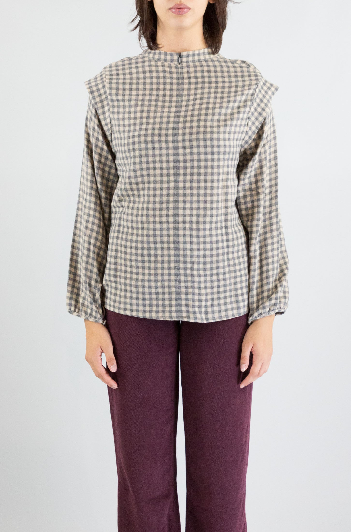 Femminile e delicata. La camicia a quadri fitti Des Petit Hauts, con colletto arricciato e taglio fluido, combina comfort e romanticismo. Ideale da indossare con denim o pantaloni a vita alta per un look casual-chic.