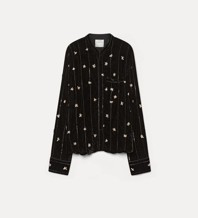 come un giardino che fiorisce in pieno inverno, questa camicia relaxed fit in velluto con ricamo “petites étoiles” si illumina di fiori lucenti in paillette e perline, con pistilli di perla. soffice e avvolgente sul busto, questa camicia ha il fascino discreto del collo alla coreana e il tocco tailoring della gessatura, con bordo in passamaneria.