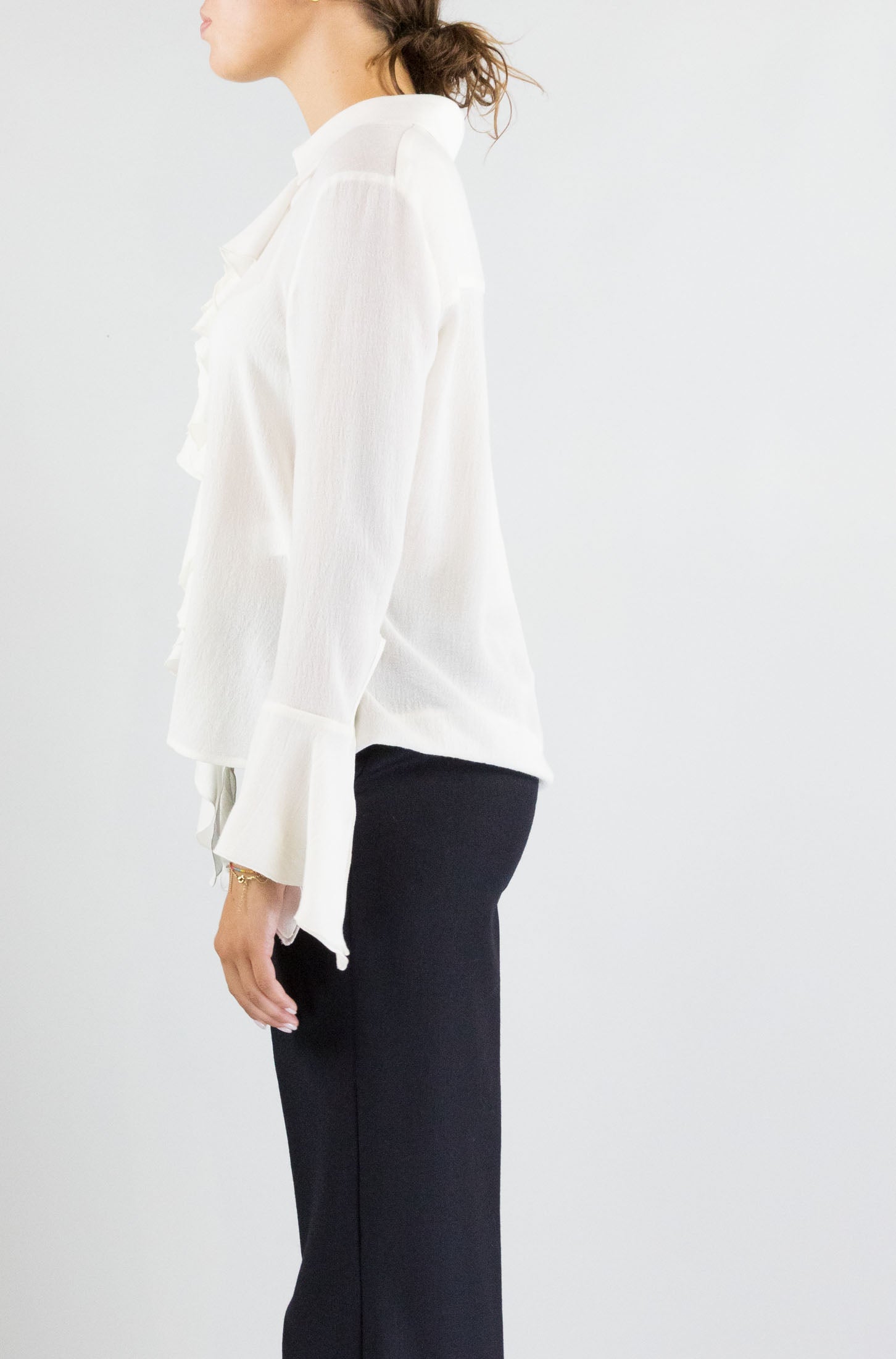 Romanticismo sartoriale. Questa camicia Hanami d’Or conquista con le sue delicate balze frontali e la texture morbida della viscosa e lana. Per look femminili, ma decisi.