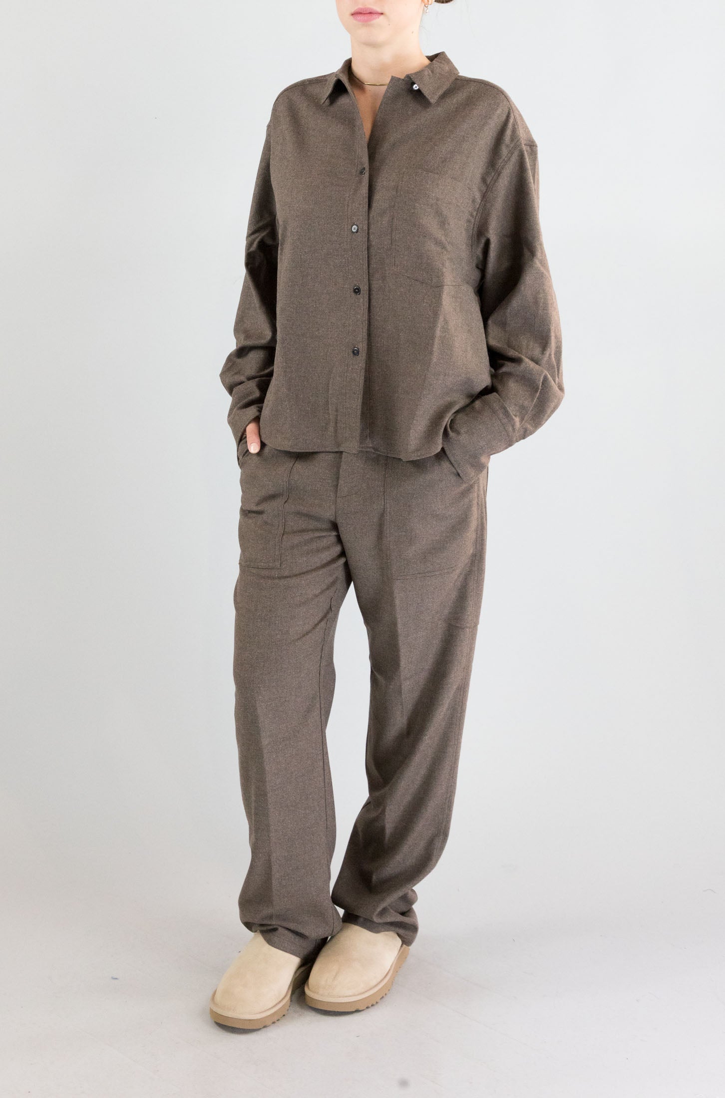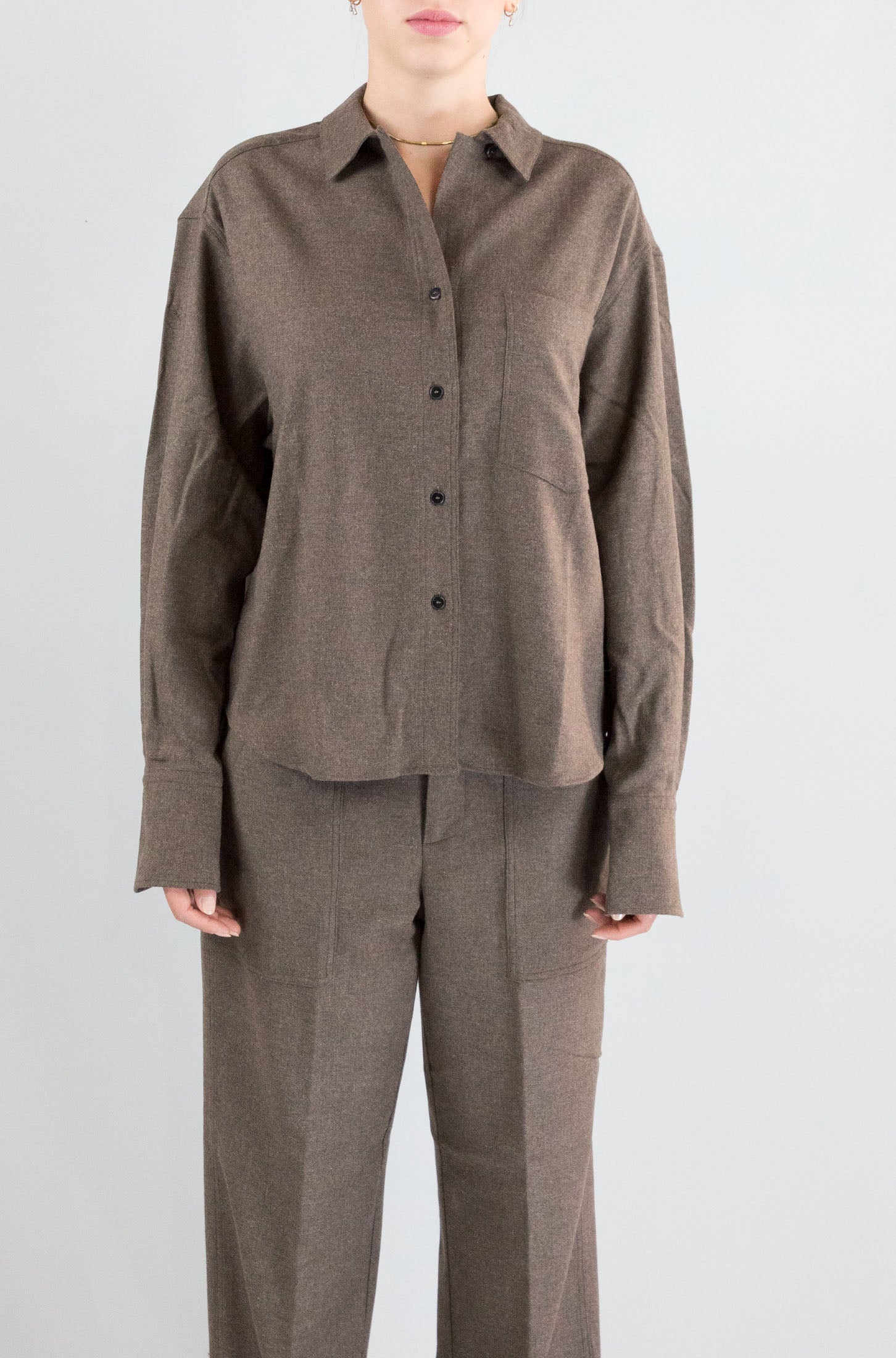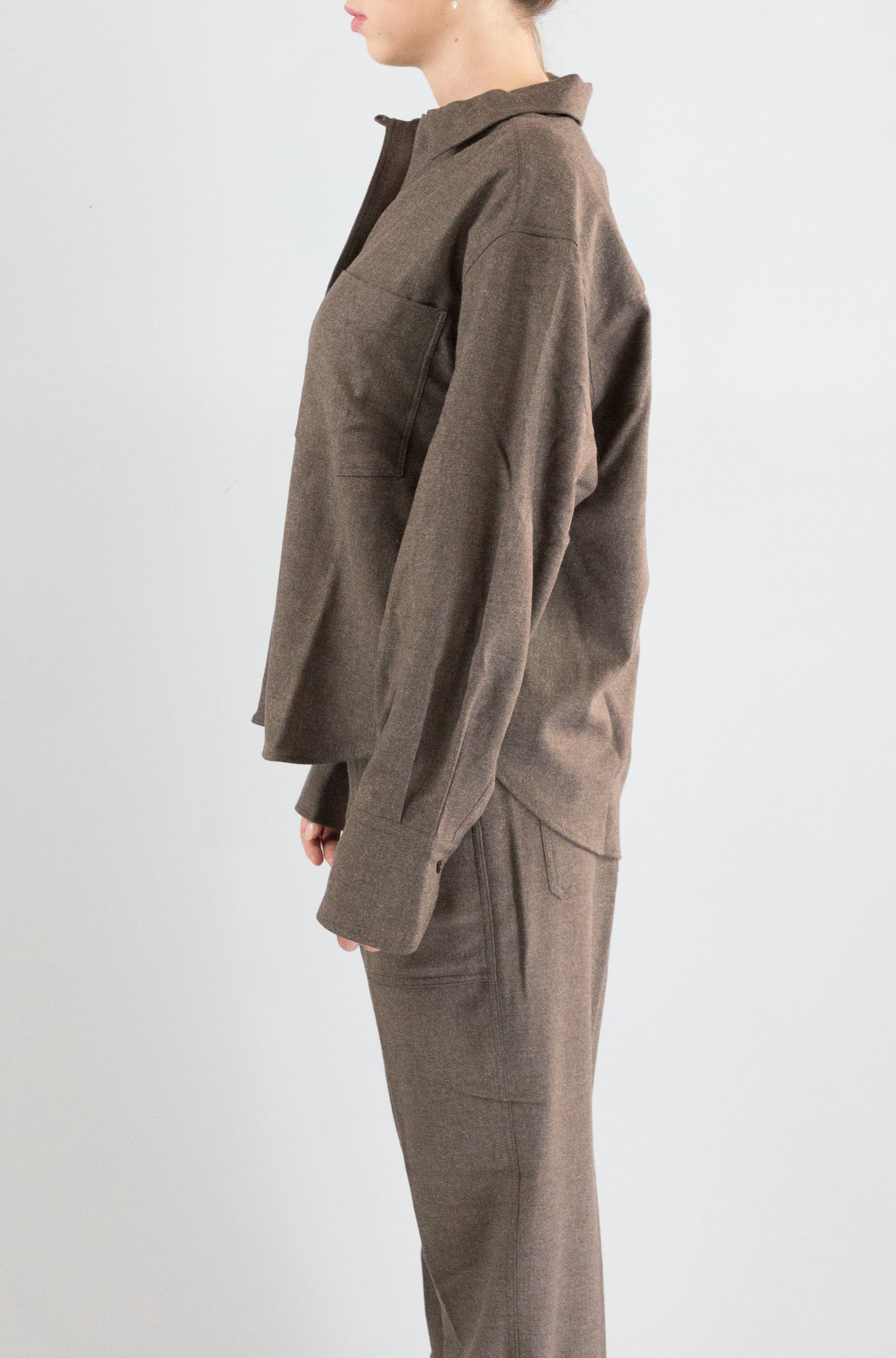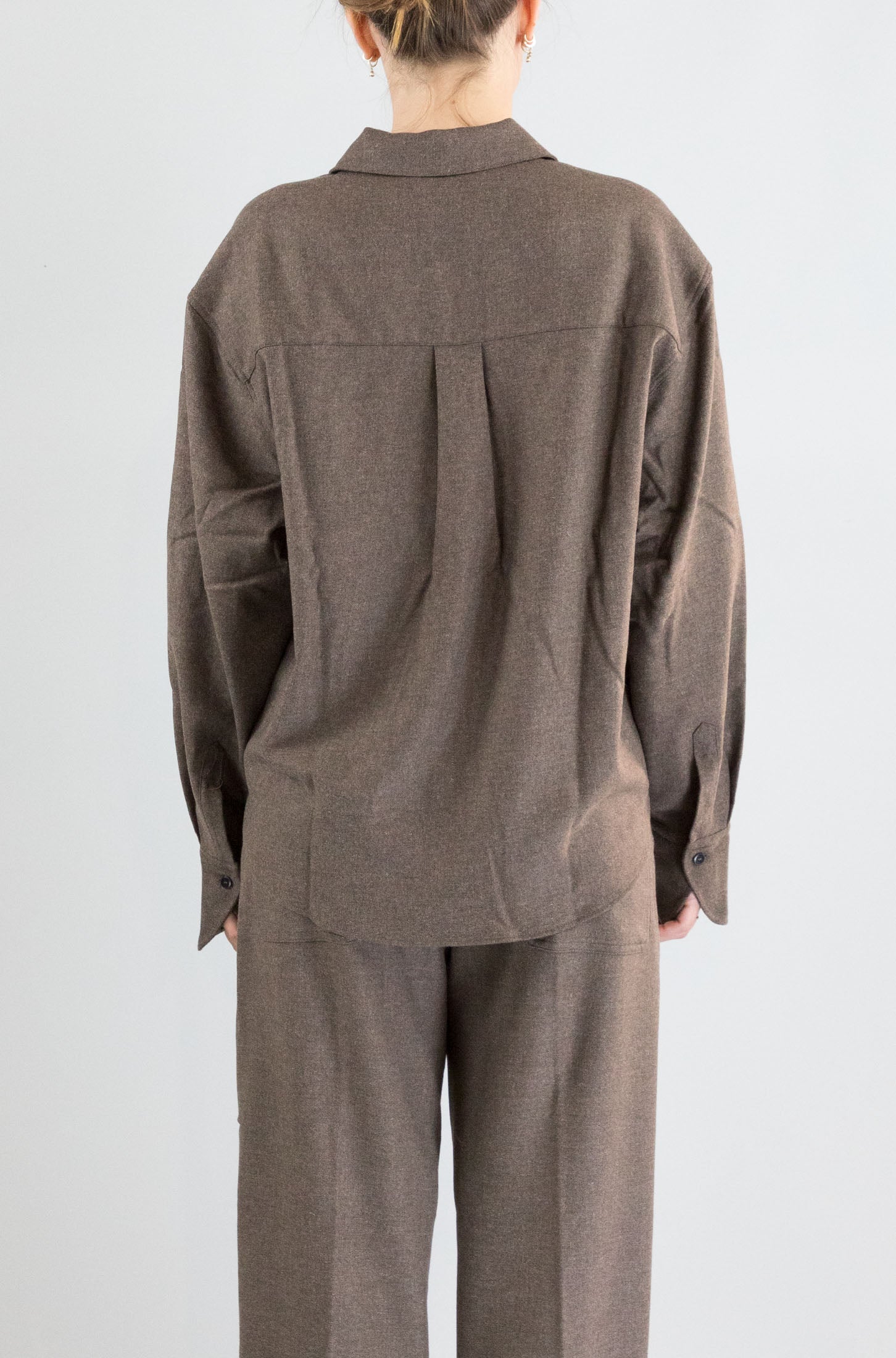 Tonalità calde e stile minimal. Camicia marrone firmata Pomandère con colletto classico, maniche lunghe, chiusura a bottoni e taschino sul petto. La texture ricca dona profondità al capo.