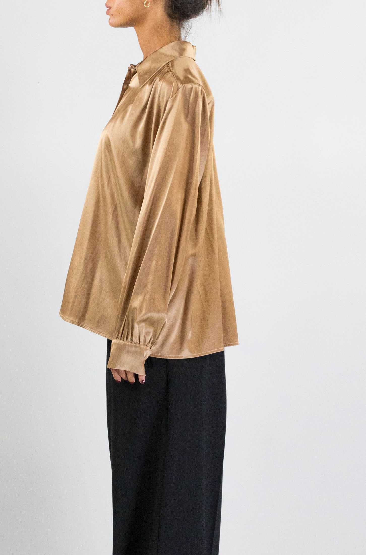 Un tocco di luce nel guardaroba. La camicia dorata Solotre esprime eleganza e femminilità, perfetta per chi ama distinguersi con discrezione. Da indossare con un denim per il giorno o una gonna elegante per la sera.