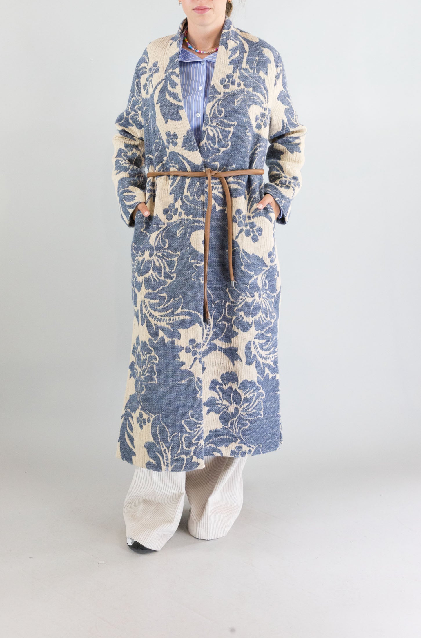 Un tocco orientale e romantico per questa giacca in stile kimono firmata Ottod’ame. Il pattern floreale, la fusciacca in vita e la ricca composizione tessile danno vita a un capo raffinato e fuori dagli schemi.