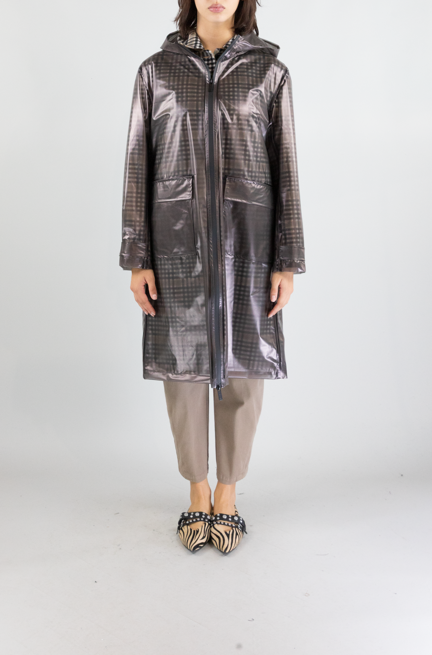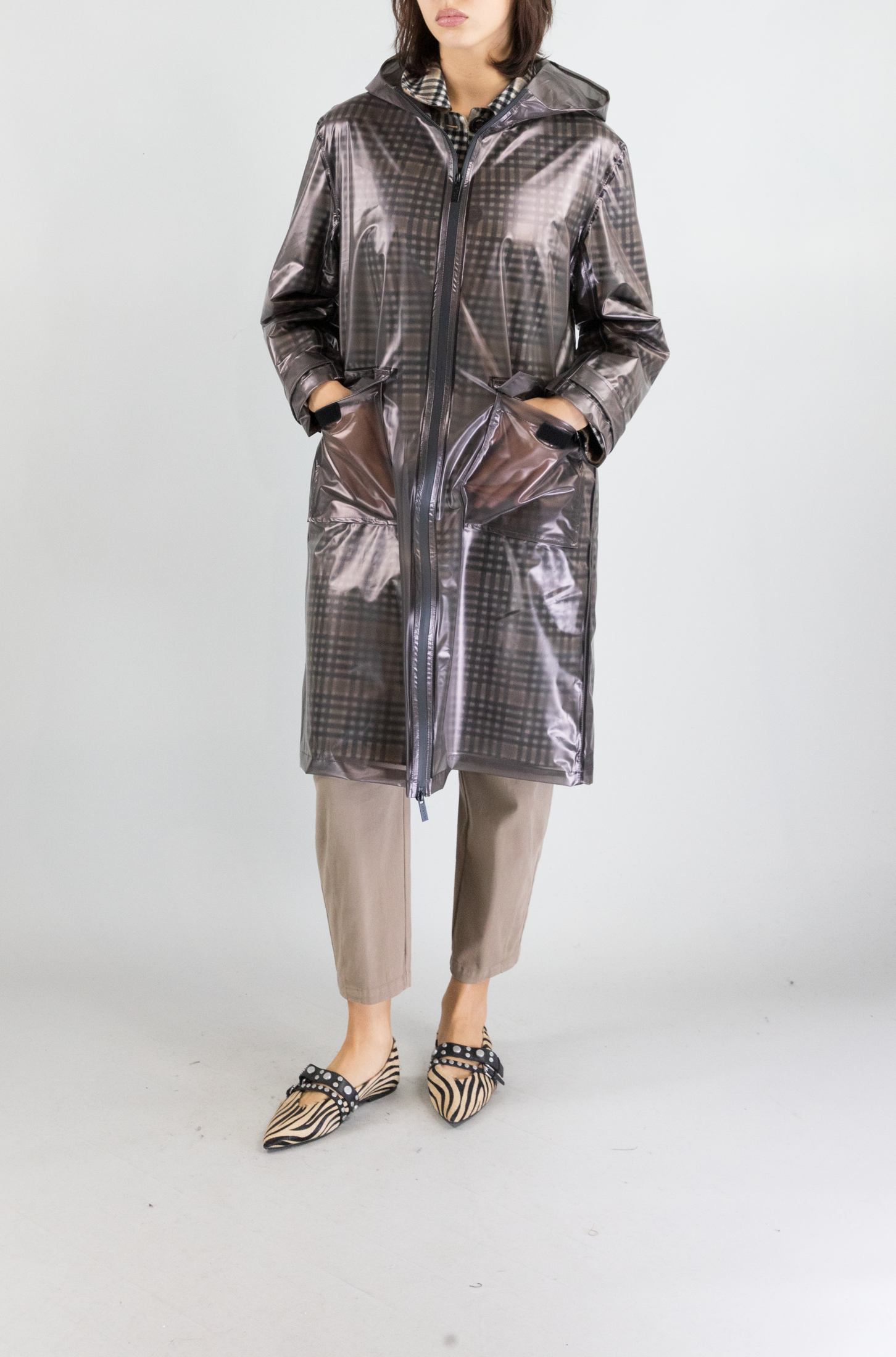 Cappotto in lana con sopra uno strato di nylon con cappuccio, la Modella indossa la taglia small