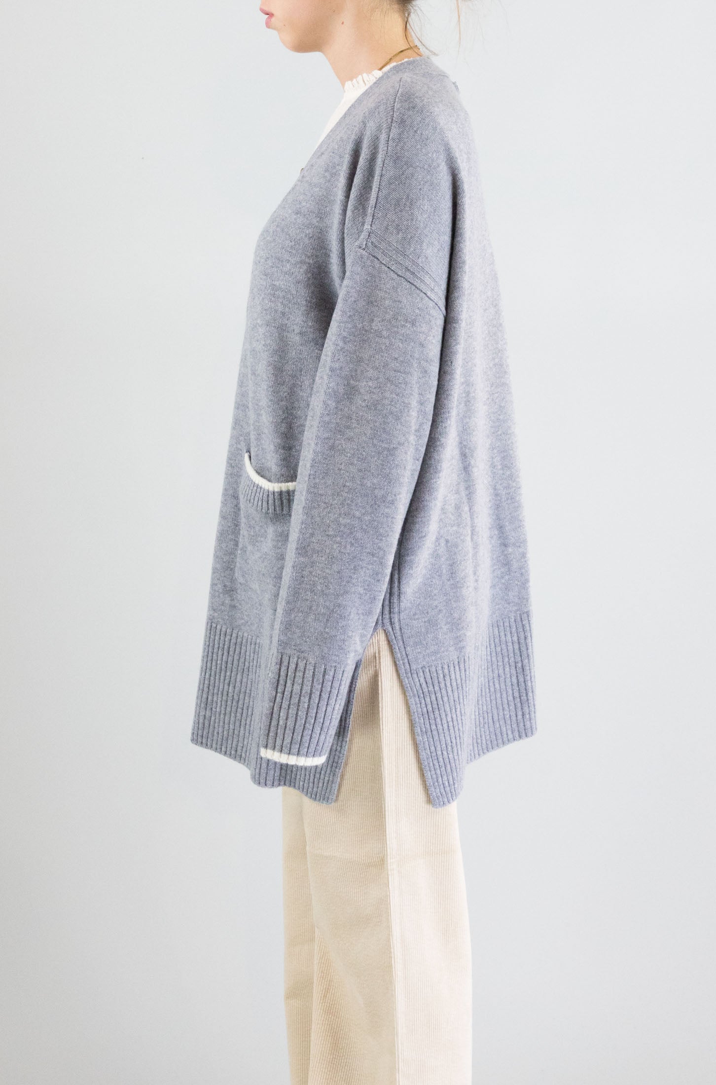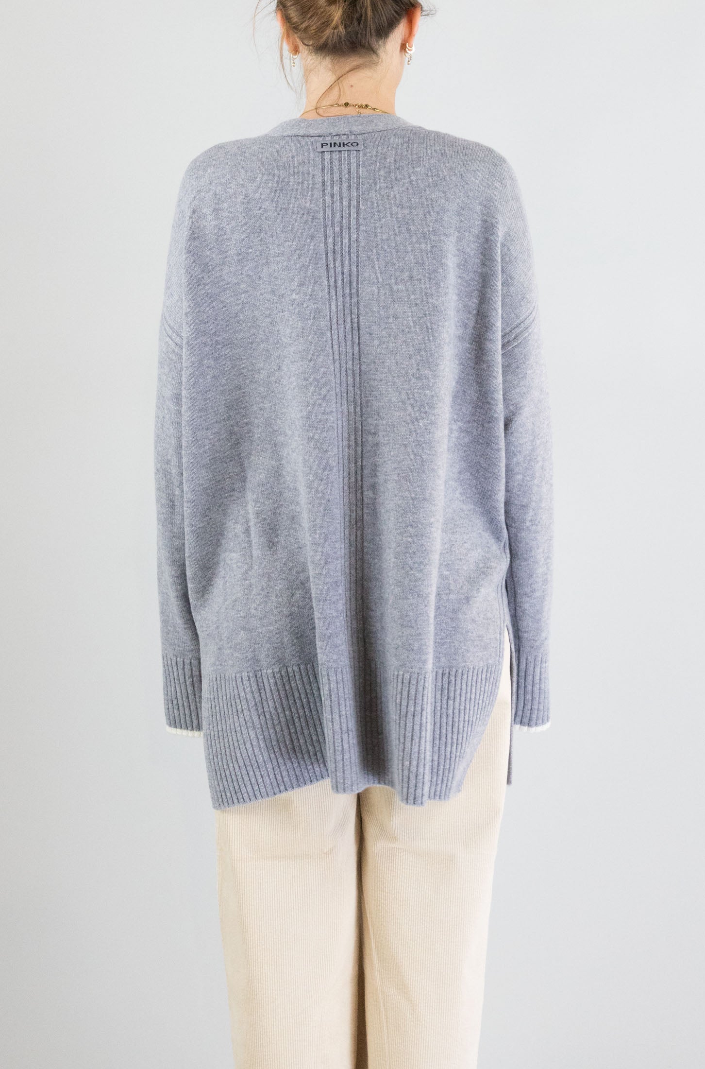 Un'eleganza morbida e funzionale. Maglia grigia Pinko con maniche lunghe, collo pari e pratica chiusura con bottoni. Le tasche laterali donano un tocco utility, il filato in lana e cashmere regala calore e leggerezza.