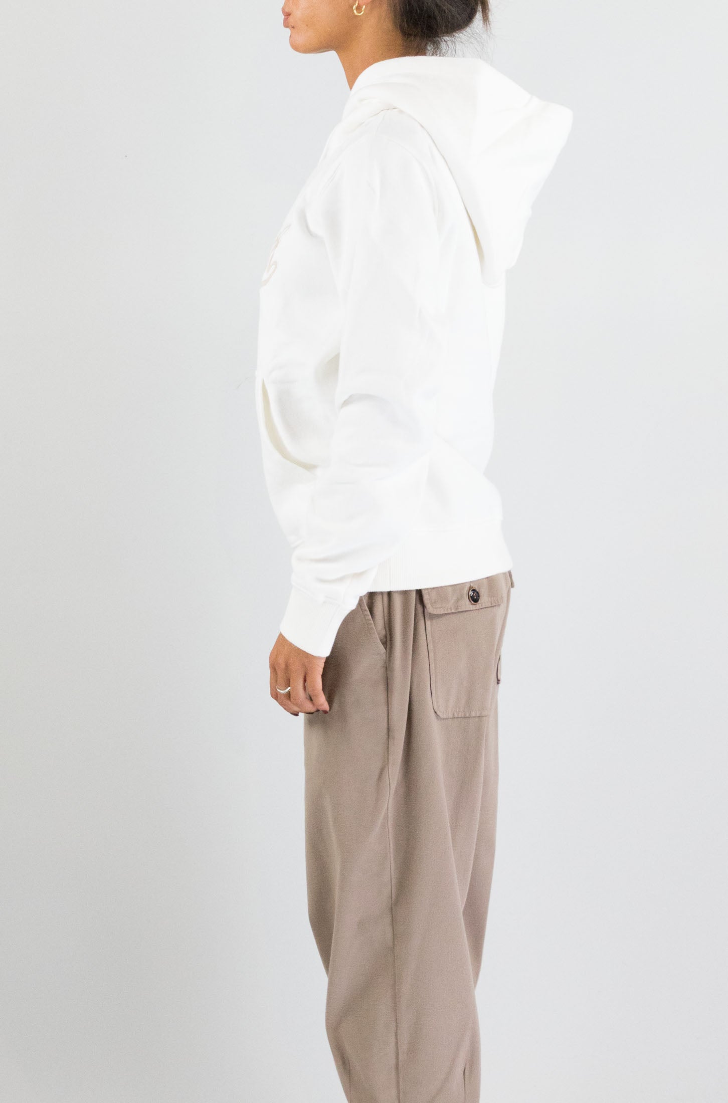 Casual, pulita, iconica. La felpa bianca con cappuccio, ampia tasca frontale e scritta logo sul petto unisce praticità e stile. Un capo ideale per le giornate rilassate o per un look sporty-chic.