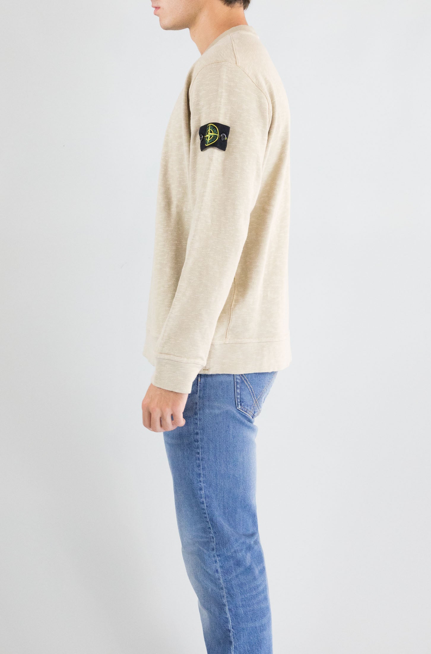 Pulizia estetica e qualità. Maglia beige con maniche lunghe e collo rotondo, firmata Stone Island. Bottoni frontali e iconico logo badge sul braccio sinistro per un look casual e curato.