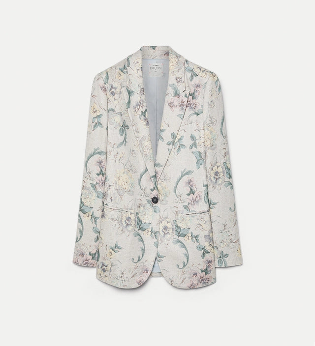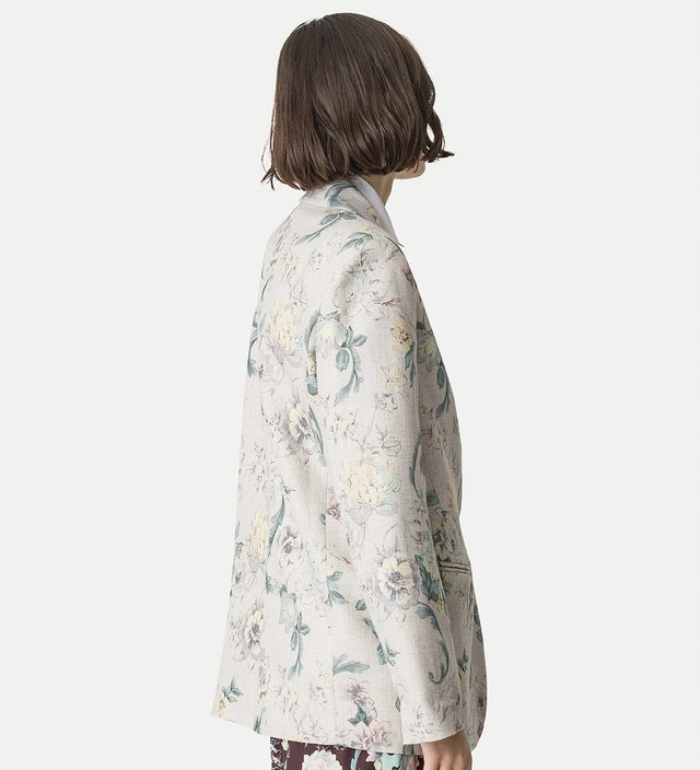 la matericità ricca del lino e viscosa trasforma questa giacca in misto lino in un pezzo perfettamente inserito nella visione estetica forte_forte. decorata con il motivo “peonia my love” emana leggerezza e femminilità, mentre le spalle leggermente imbottite e lo spacco posteriore aggiungono dettagli sartoriali ad una giacca in hopsack pensata per una primavera fiorita.