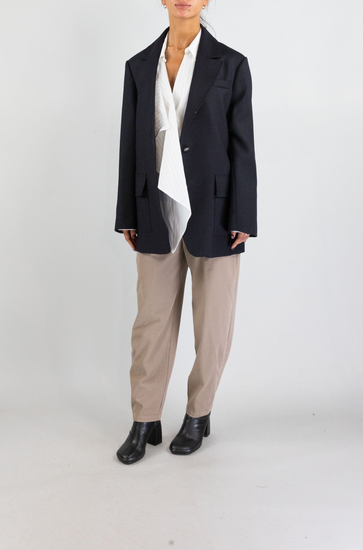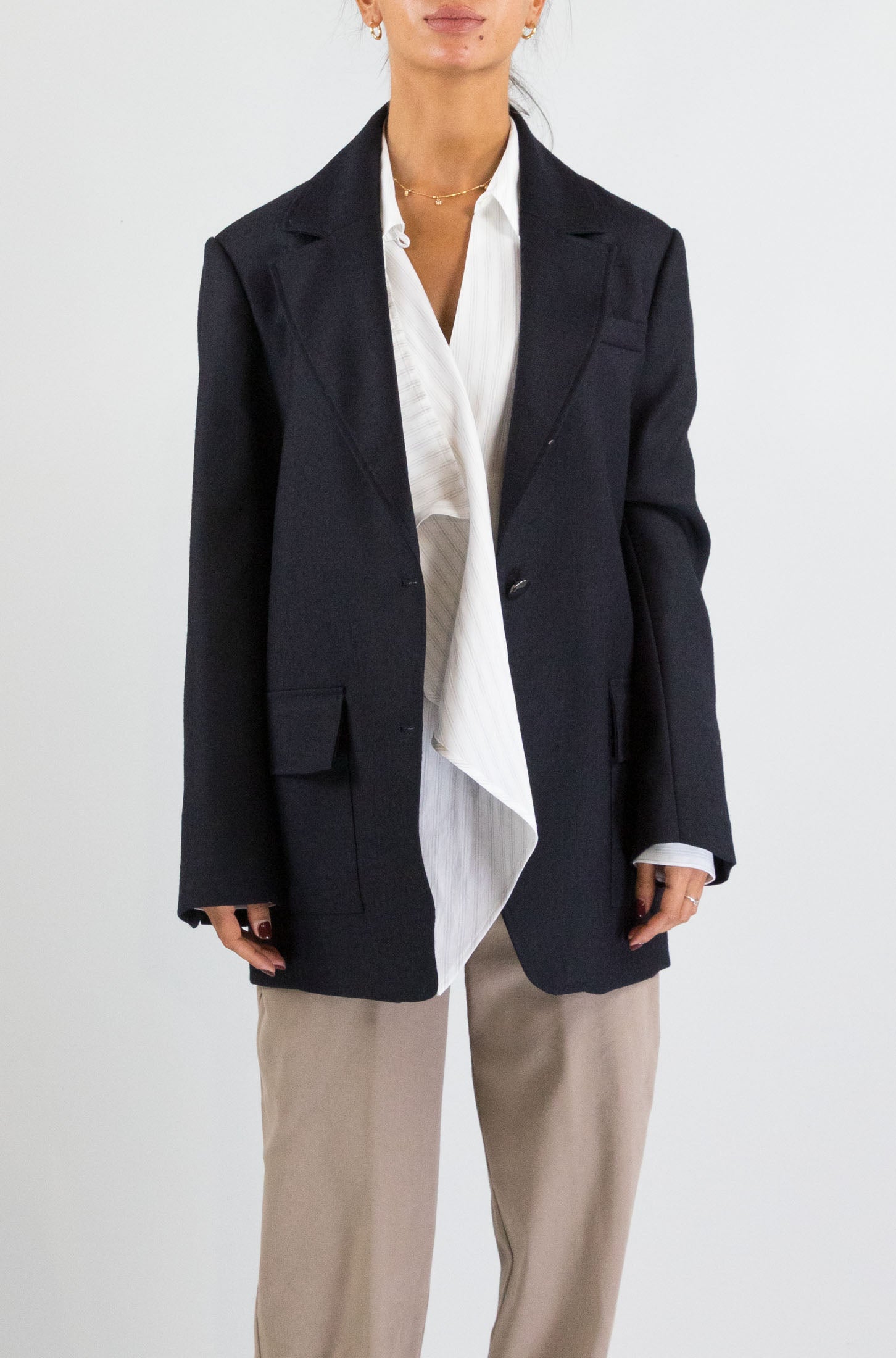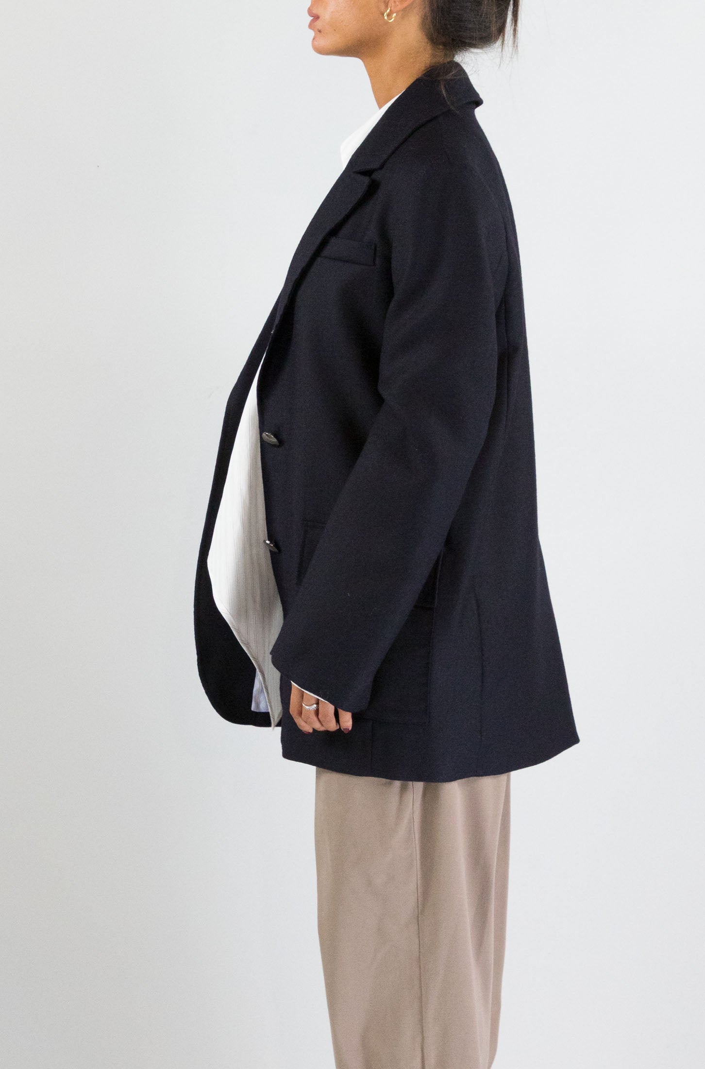 Un capo iconico per un guardaroba curato. La giacca tailleur nera Hanami D'Or si ispira alla sartorialità classica, con taglio preciso, colletto definito e chiusura a bottoni, perfetta anche per look più rilassati.