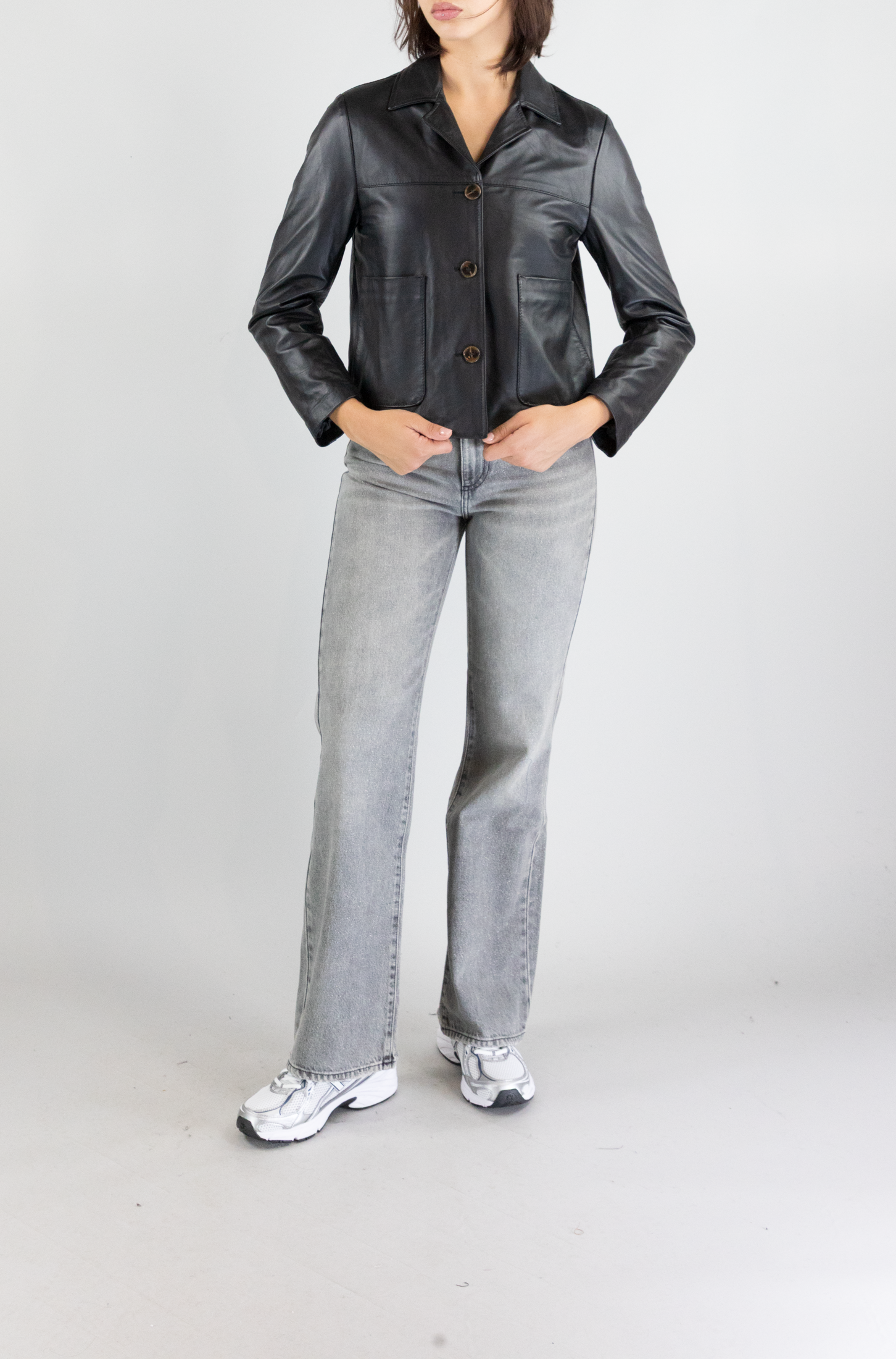 Giacca in pelle nera Vicolo la modella indossa la taglia small