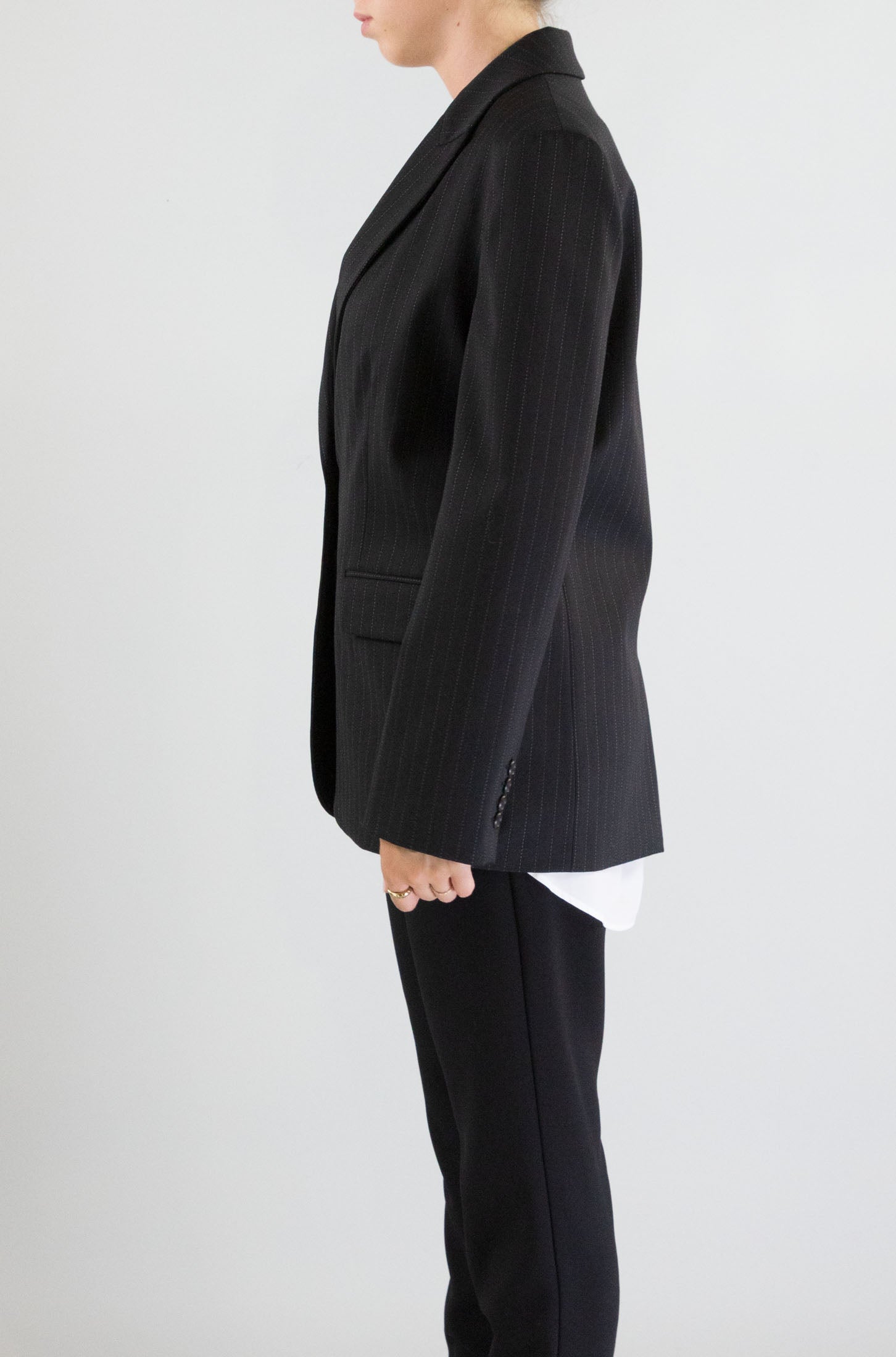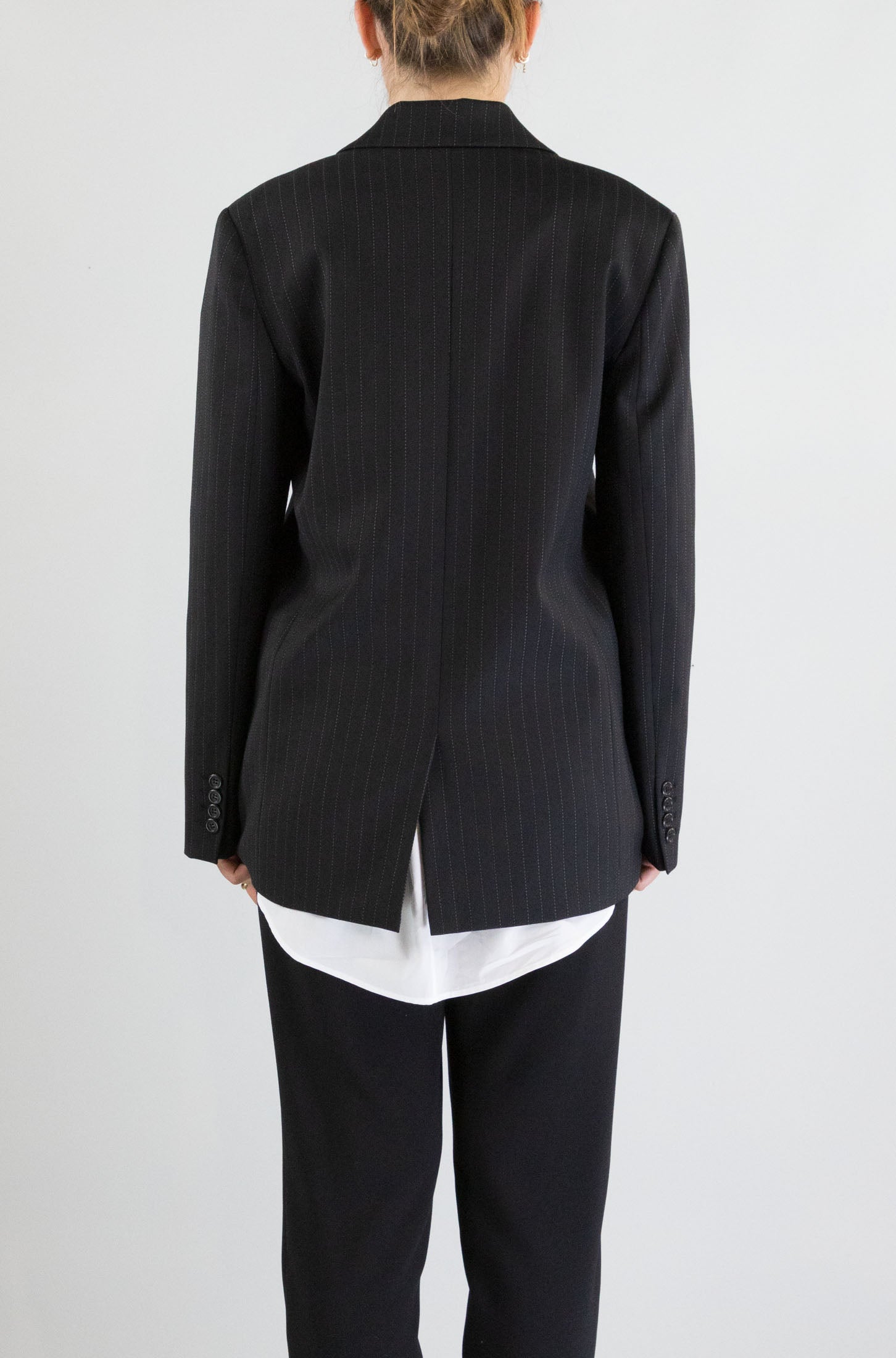 Un tocco di rigore contemporaneo: questa giacca a righe firmata Ottod’ame si distingue per la sua chiusura a bottone unico e un design strutturato e versatile.