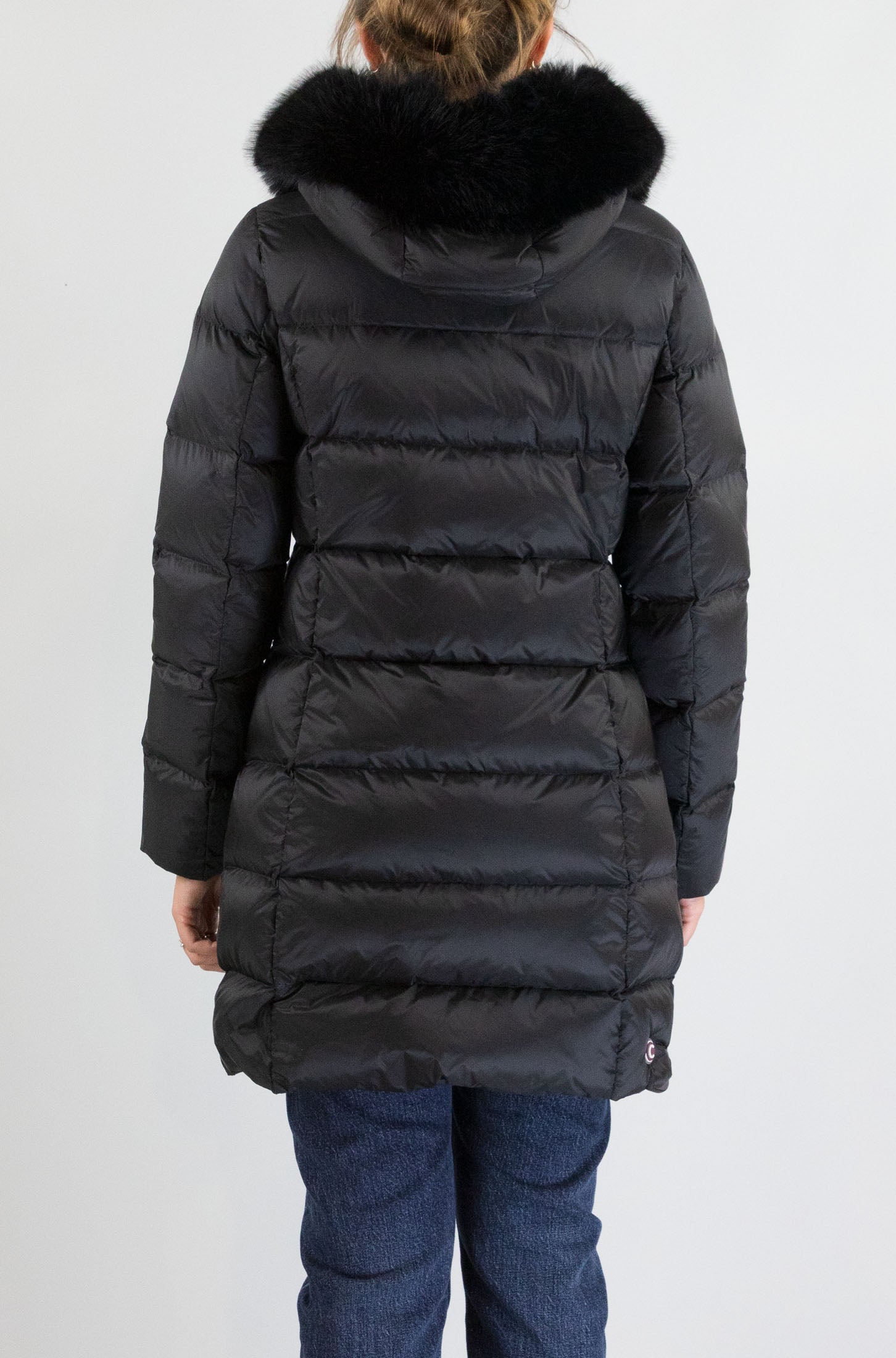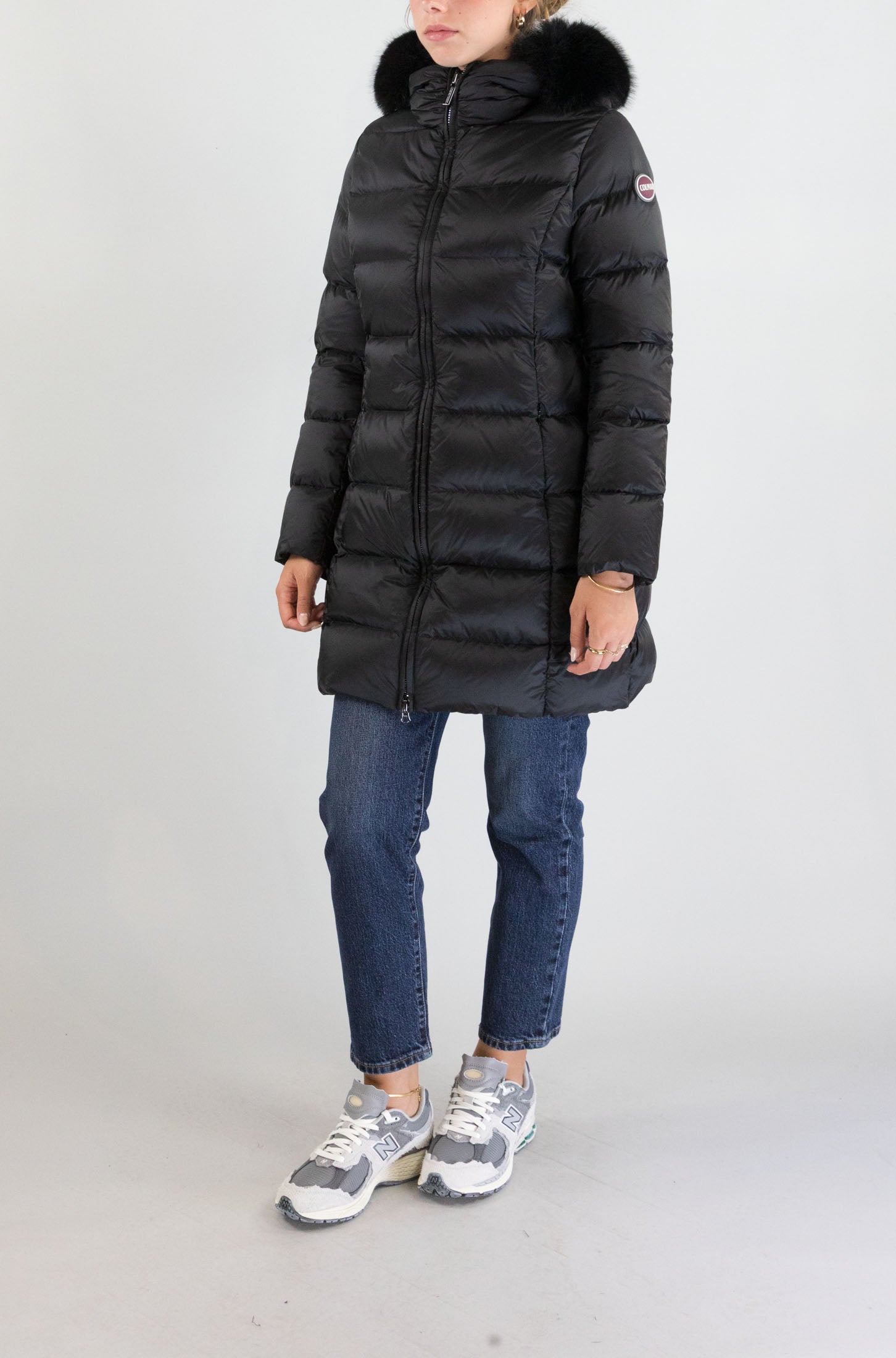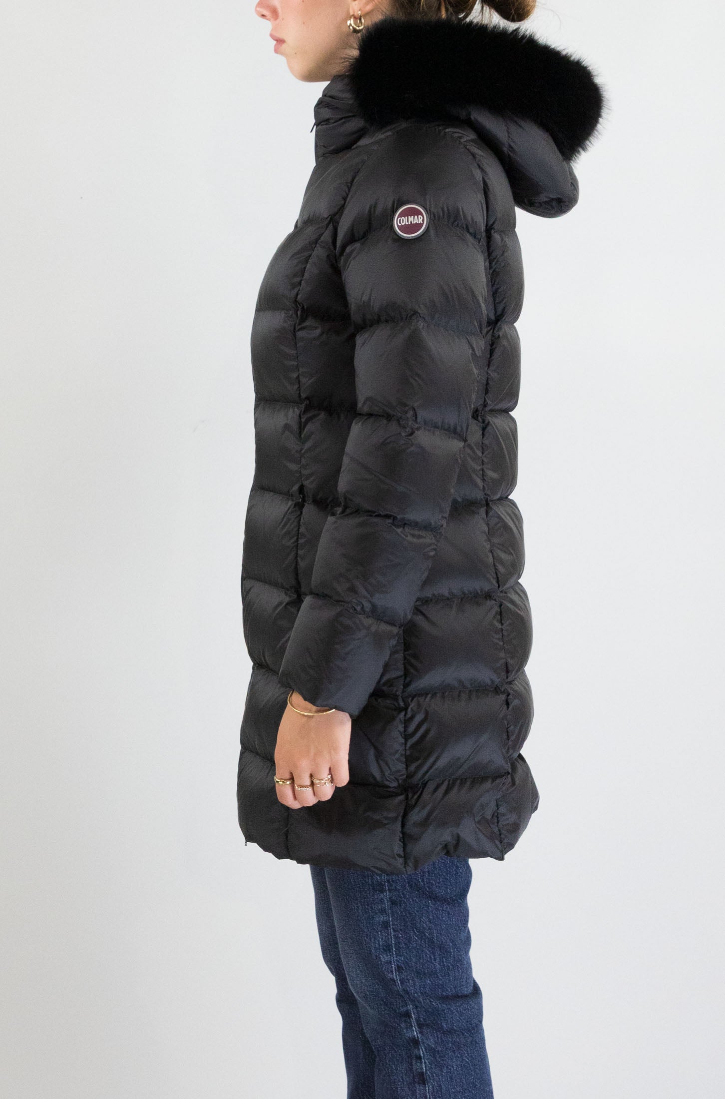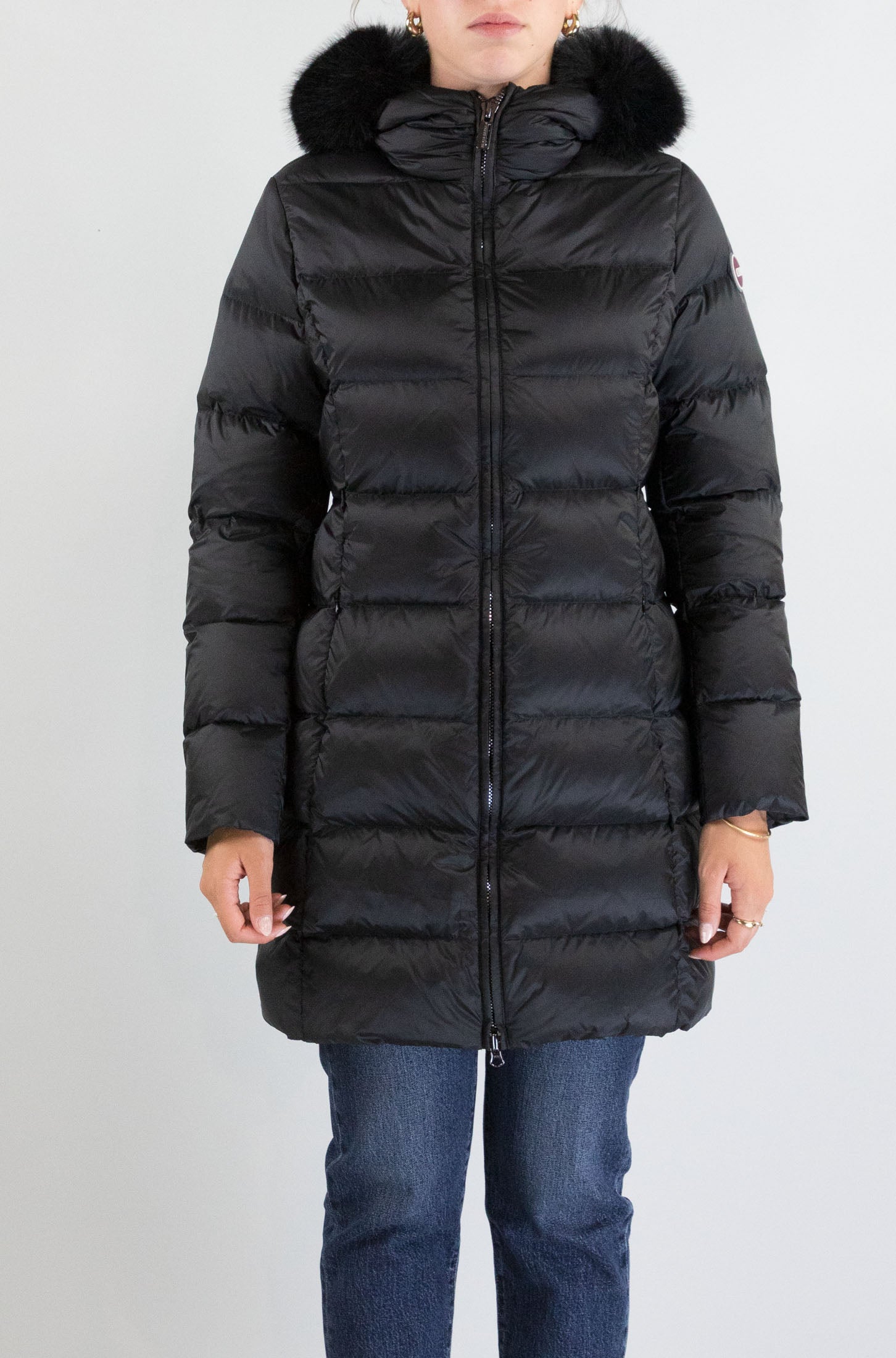 Il piumino nero Colmar, lungo sotto la vita, è un capo dal design sofisticato e funzionale. Con maniche lunghe, cappuccio con pelo e chiusura a zip, è pensato per offrire calore e comfort anche nelle giornate più fredde. Le tasche laterali sono perfette per riporre piccoli oggetti, mentre il mini logo badge sul braccio sinistro aggiunge un dettaglio distintivo. Il tessuto in 100% poliammidica garantisce protezione e durata. La modella indossa la taglia S.