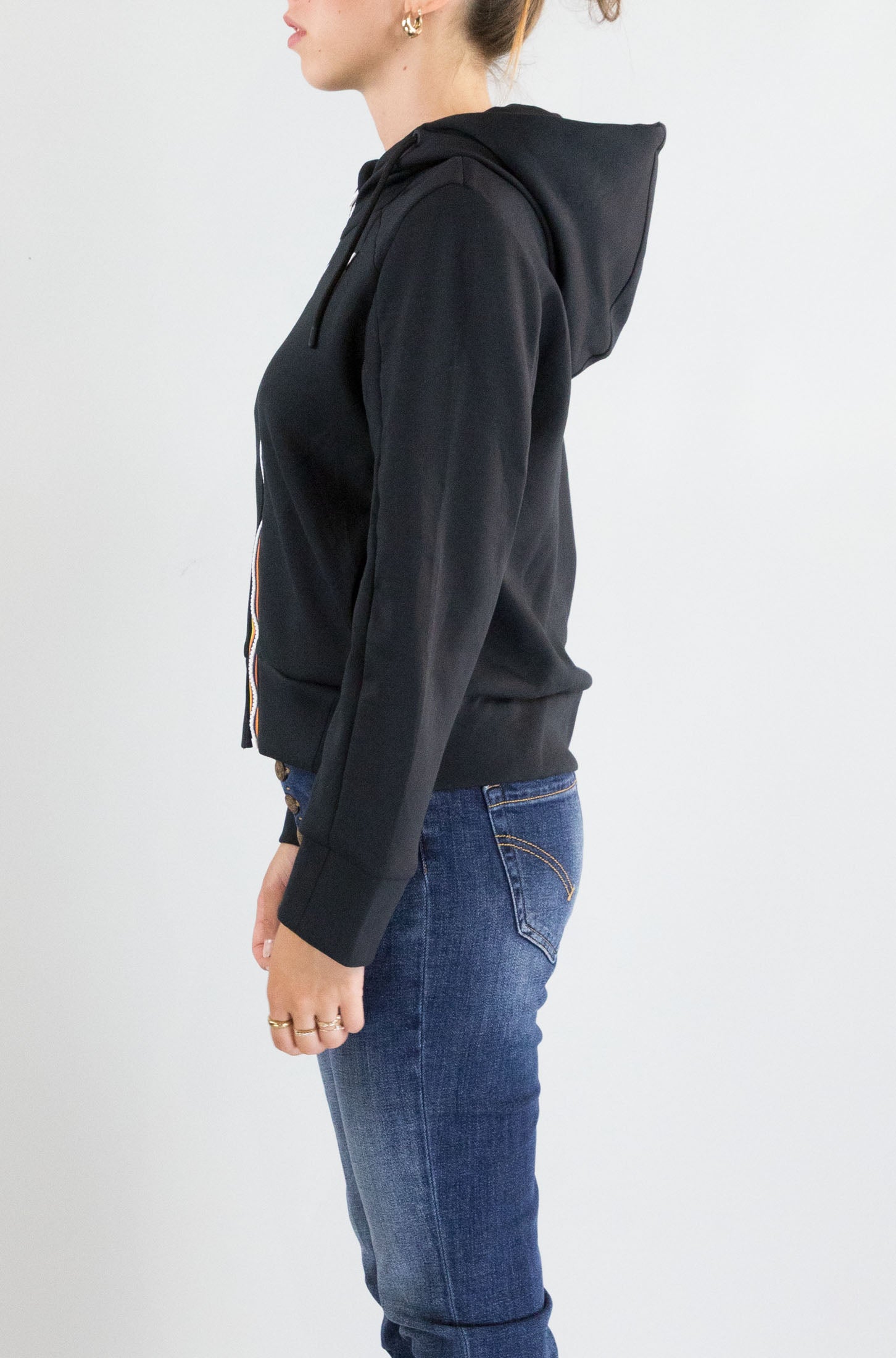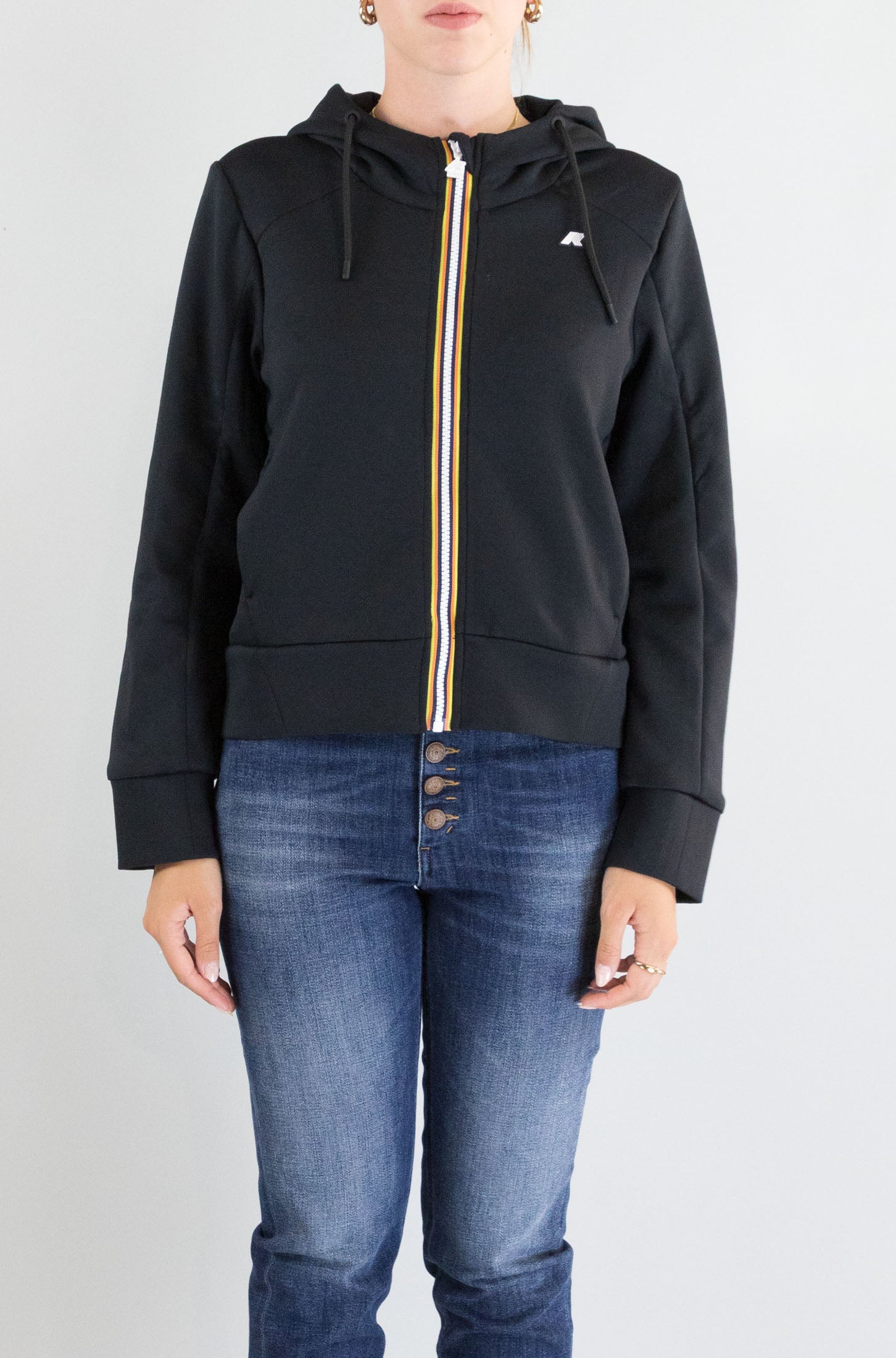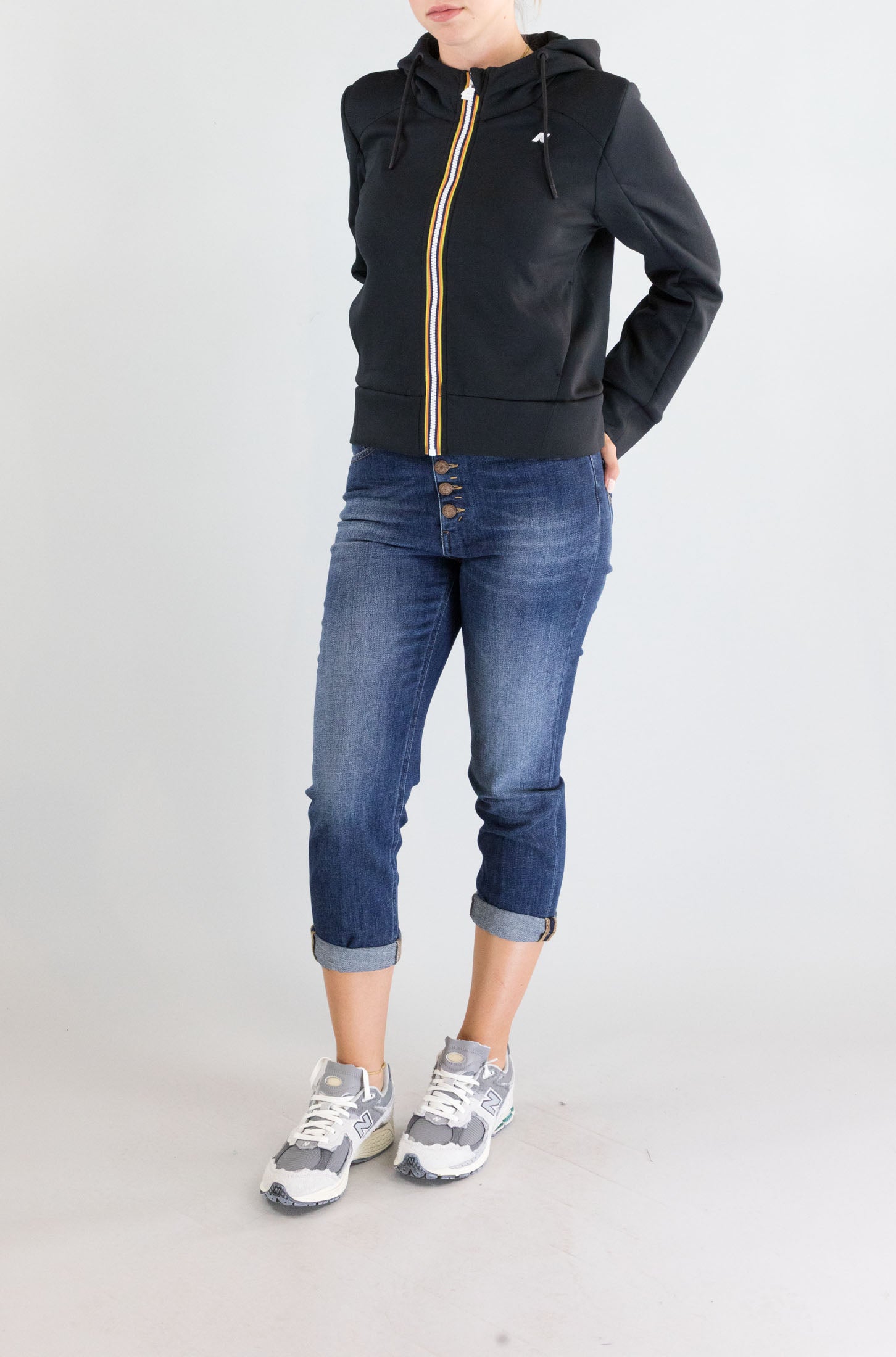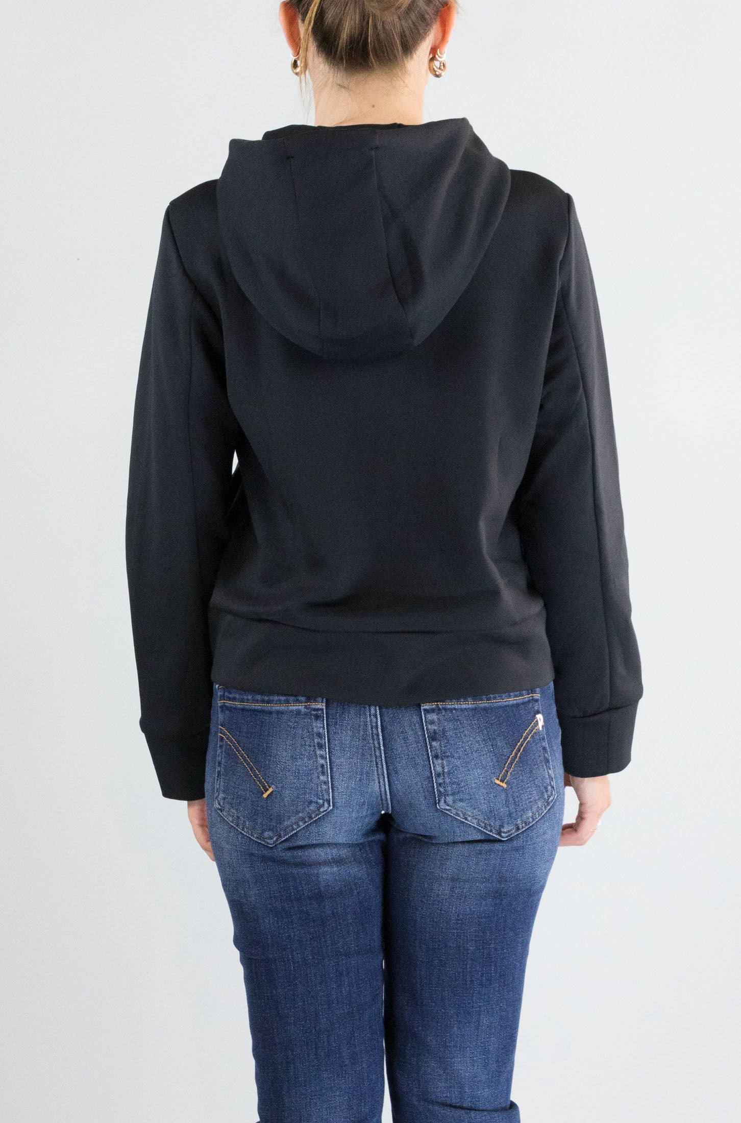 La felpa nera Kway è un capo casual ma chic, perfetto per ogni occasione. Con maniche lunghe, cappuccio e chiusura a zip, offre un comfort eccezionale. Le tasche laterali aggiungono praticità, mentre il tessuto in 81% poliestere, 15% viscosa e 4% elastan assicura una vestibilità perfetta e morbida sulla pelle. La modella indossa la taglia S.