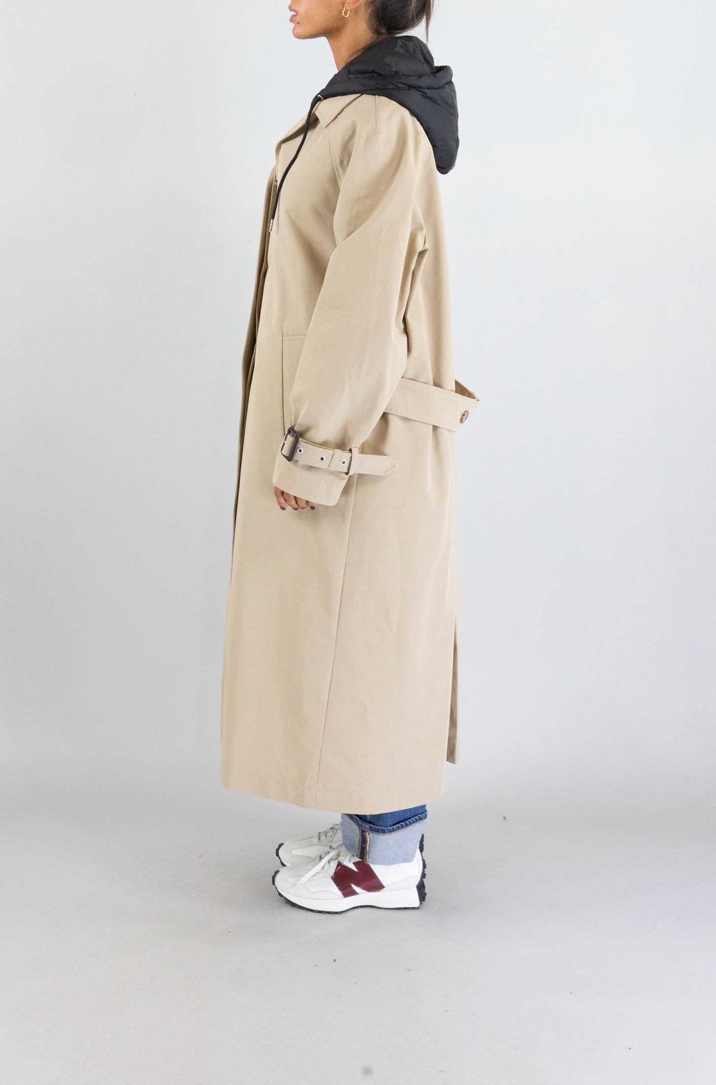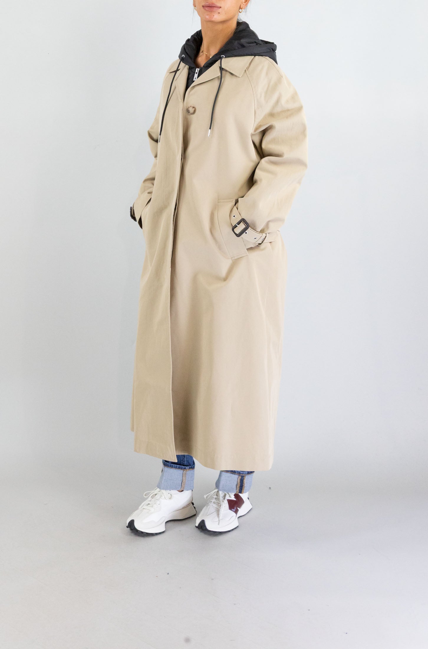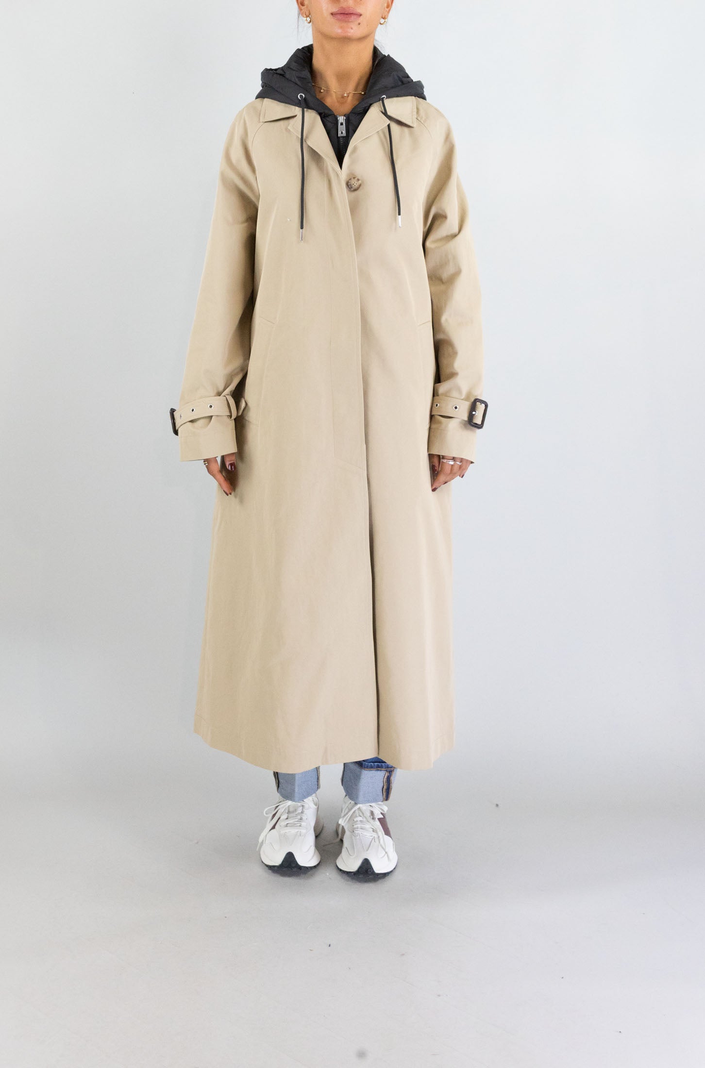 Ideale per affrontare con eleganza il freddo di stagione, questa giacca lunga beige di Ottod’ame con cappuccio combina funzionalità e stile urbano. I bottoni frontali e le tasche laterali ne esaltano la praticità.