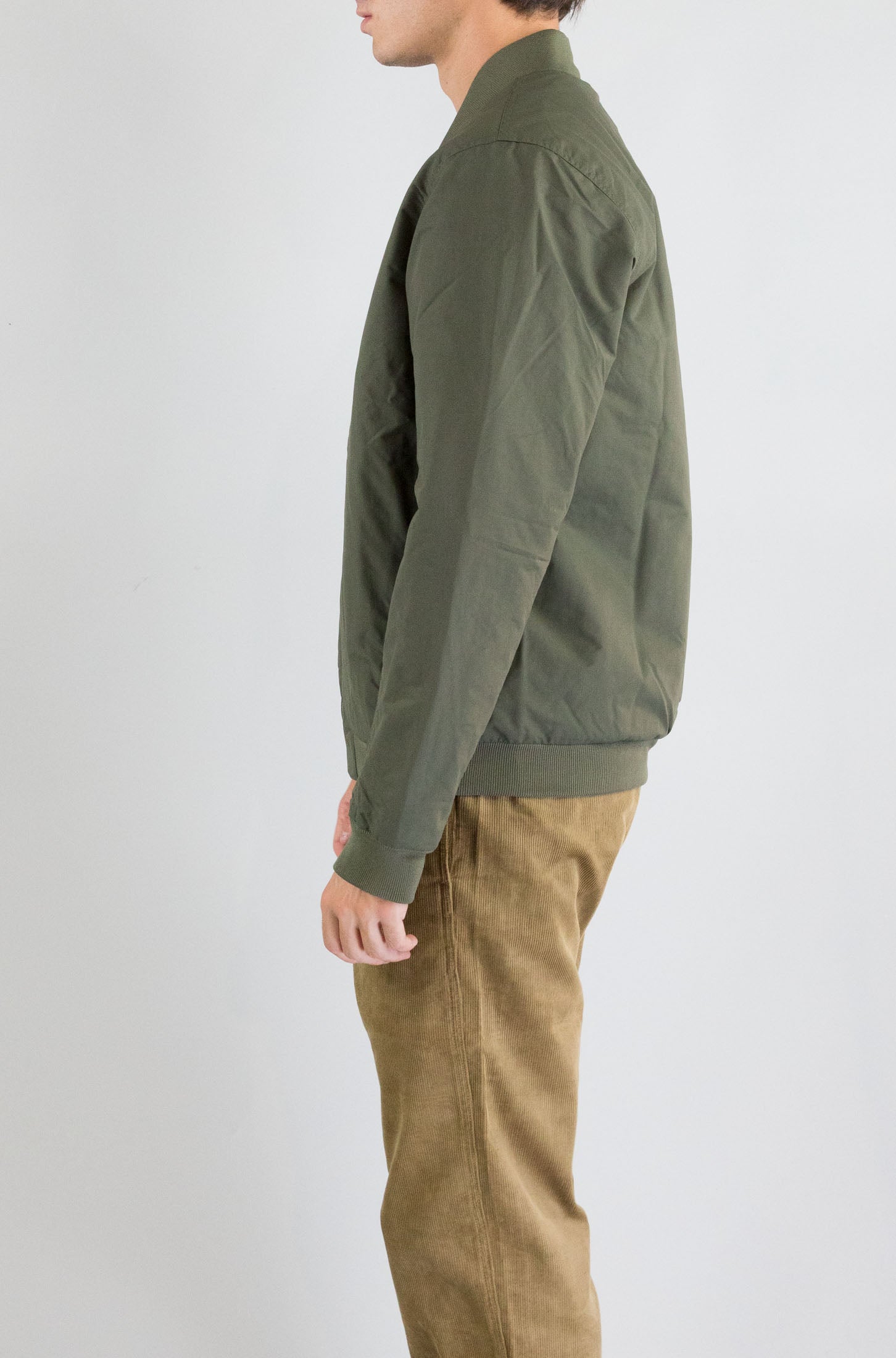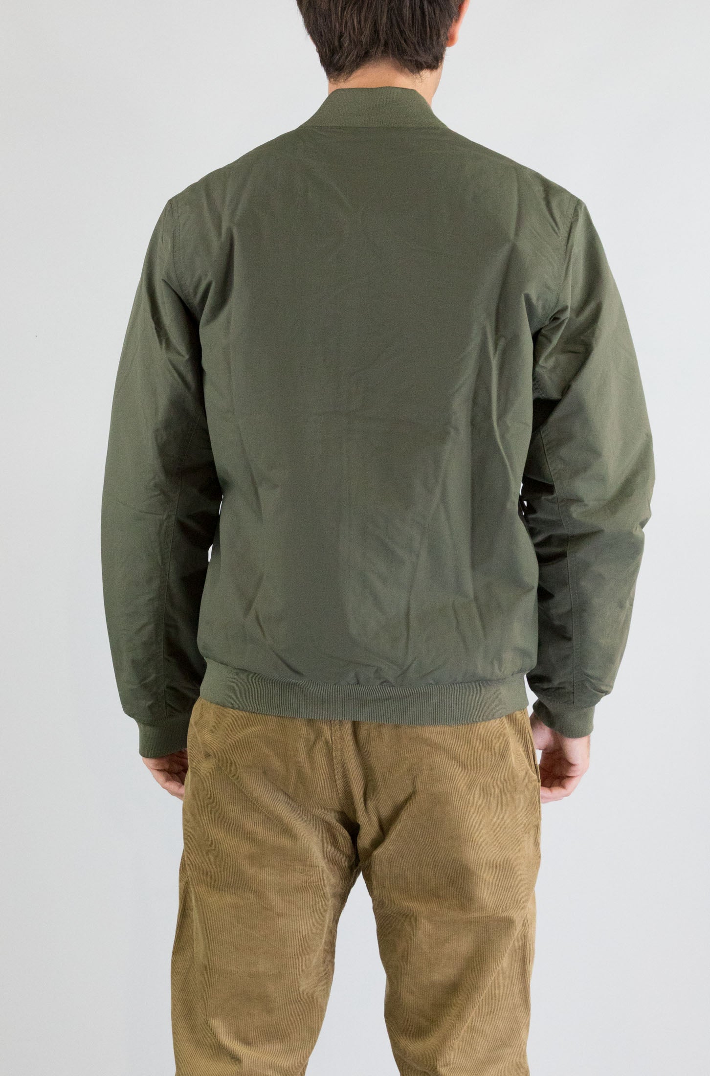 Spirito libero. Il giubbotto verde Patagonia unisce praticità e responsabilità, grazie al tessuto riciclato e al design pulito. Colletto alto, zip frontale e logo discreto sul petto.