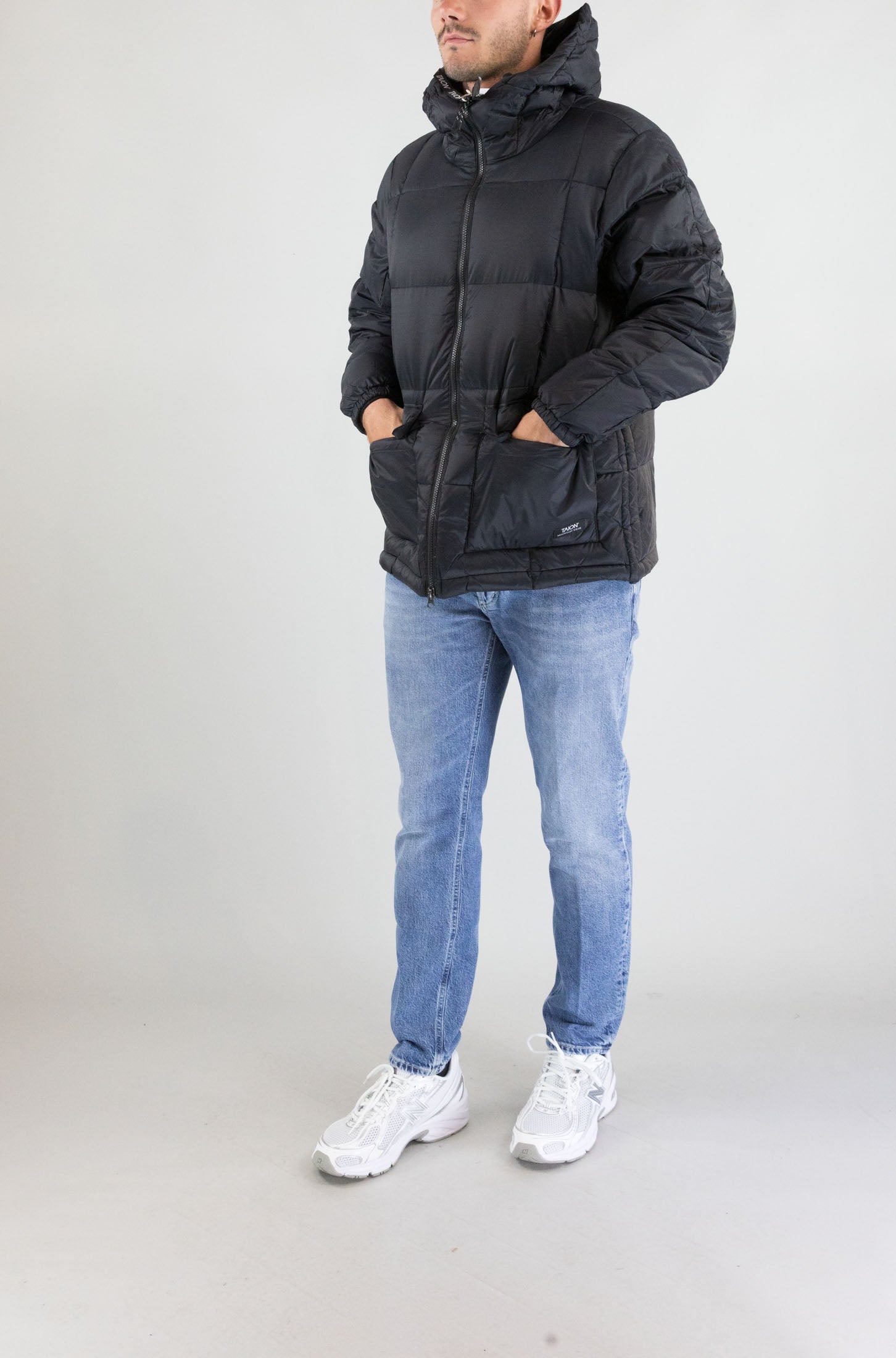 Linee pulite e design funzionale per questo giubbotto nero con cappuccio firmato Taion. Il tessuto in nylon leggero e resistente lo rende perfetto per ogni giornata all'aperto.