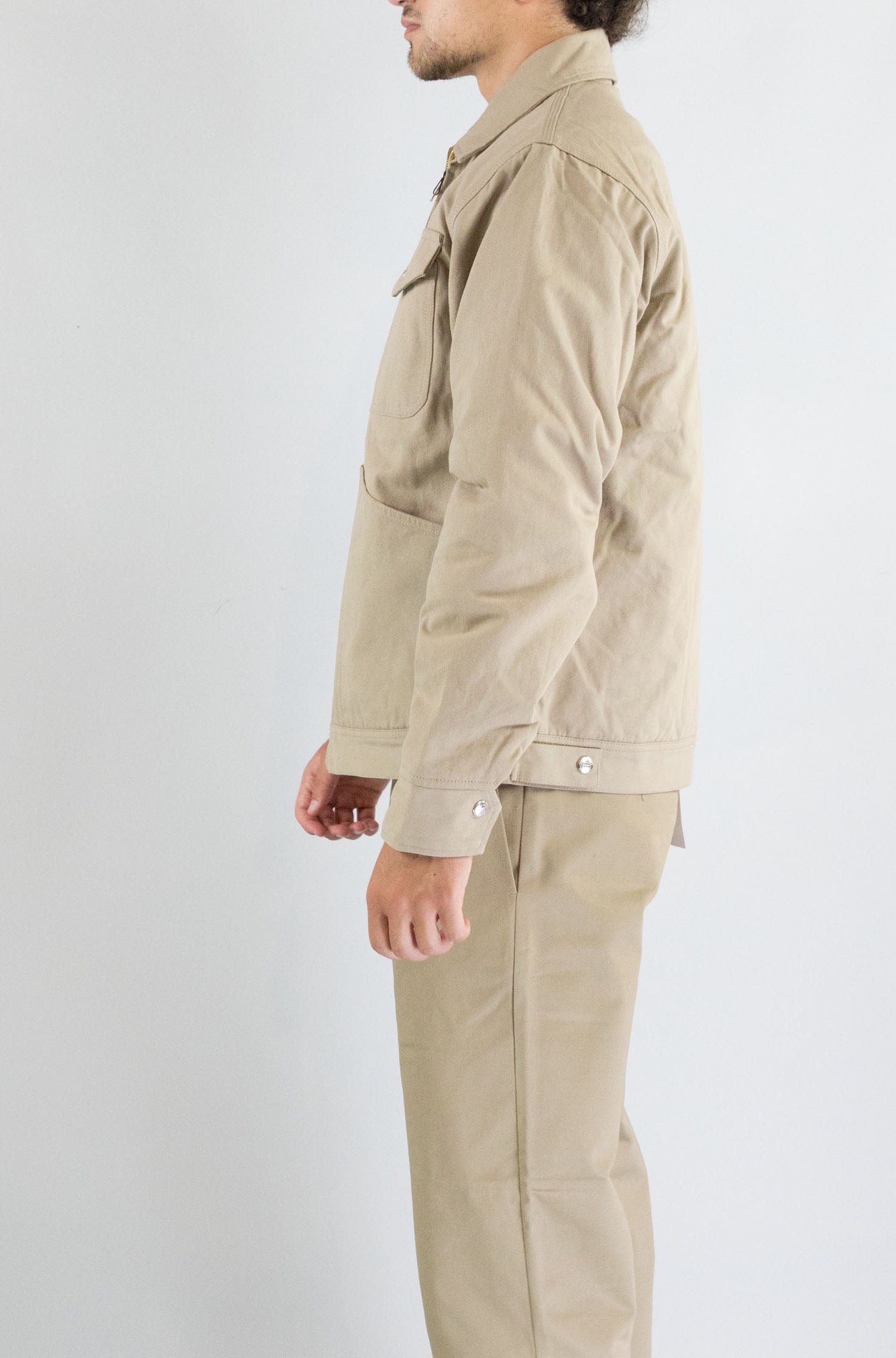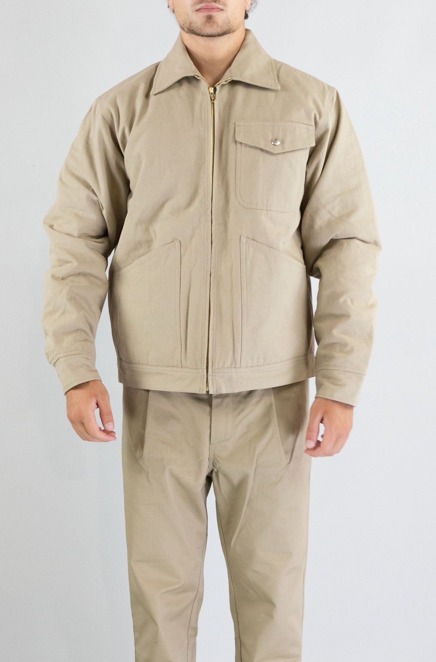 Estetica workwear e praticità urbana. Questa giacca beige Universal Overall, con zip e tasche funzionali, unisce il fascino del mondo industriale con lo stile metropolitano contemporaneo.
