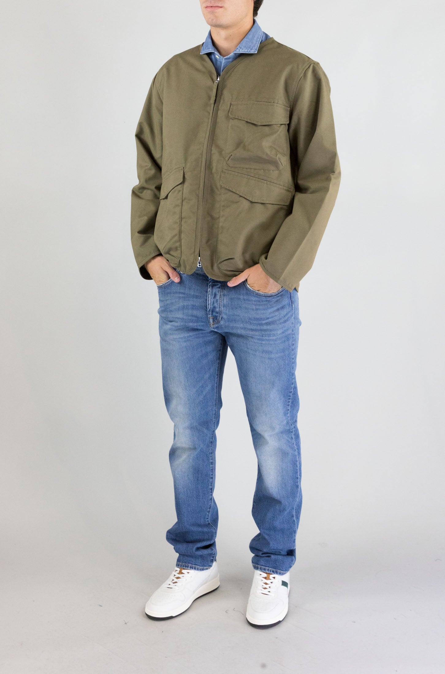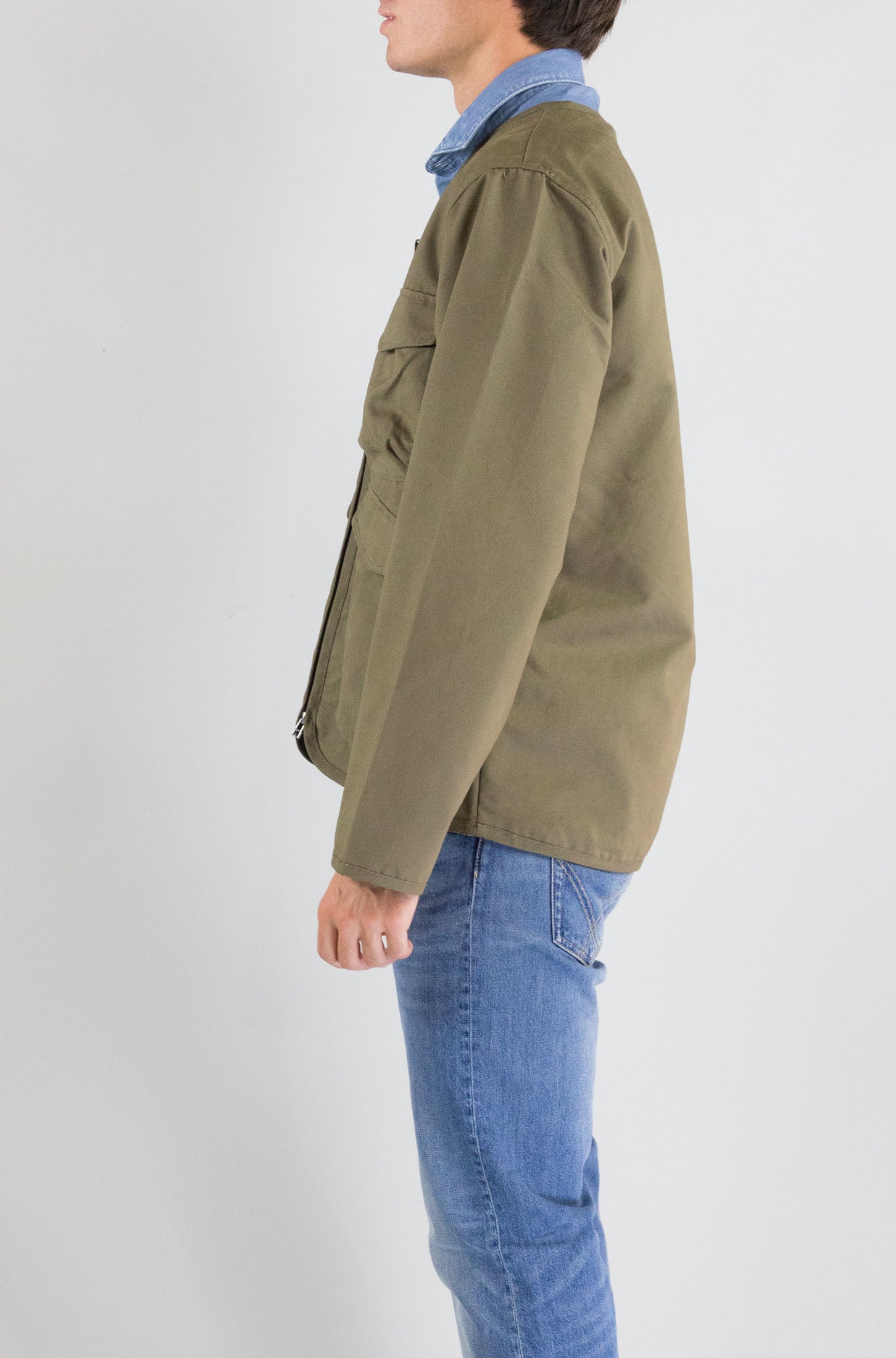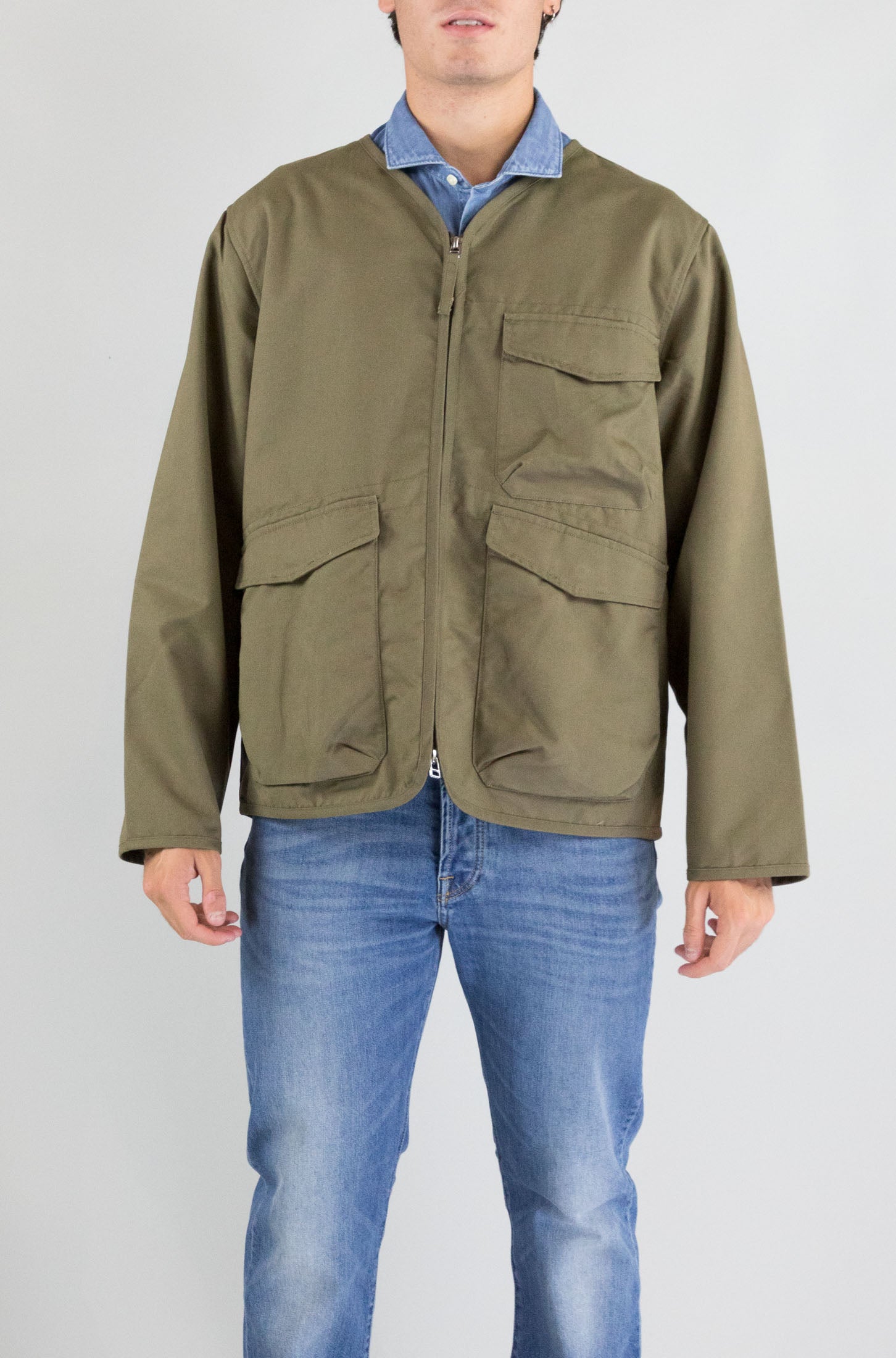 Moderno e sostenibile. Questo giubbotto verde Universal Works, con zip frontale e collo pari, è realizzato in tessuto parzialmente riciclato. Una scelta di stile e responsabilità.