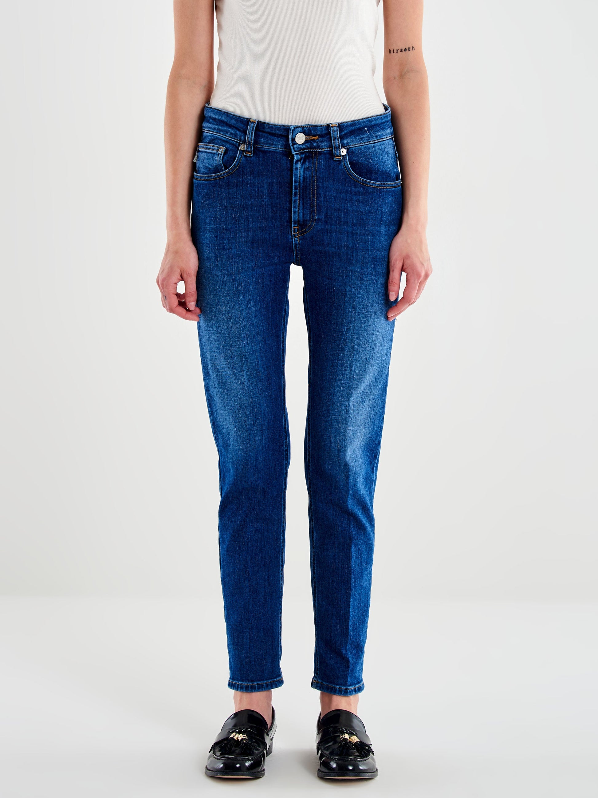 Jeans cropped a vita media. Modello cinque tasche. Chiusura con cerniera e bottone. Denim blu con leggere schiariture.
