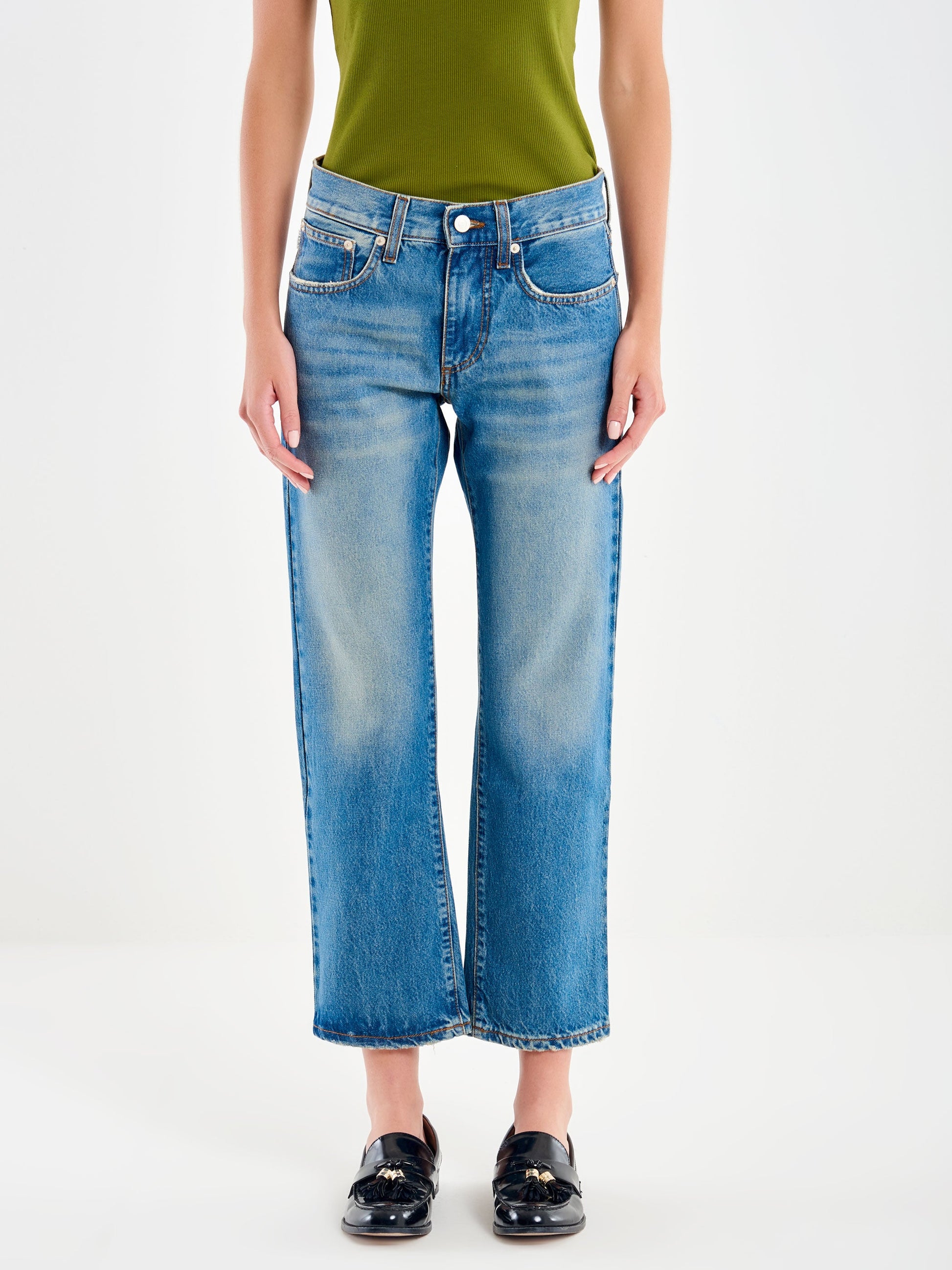 Jeans Zeke bootcut con gamba dritta e vita bassa. Modello cinque tasche. Lavaggio blu medio con schiariture. Relaxed Fit.