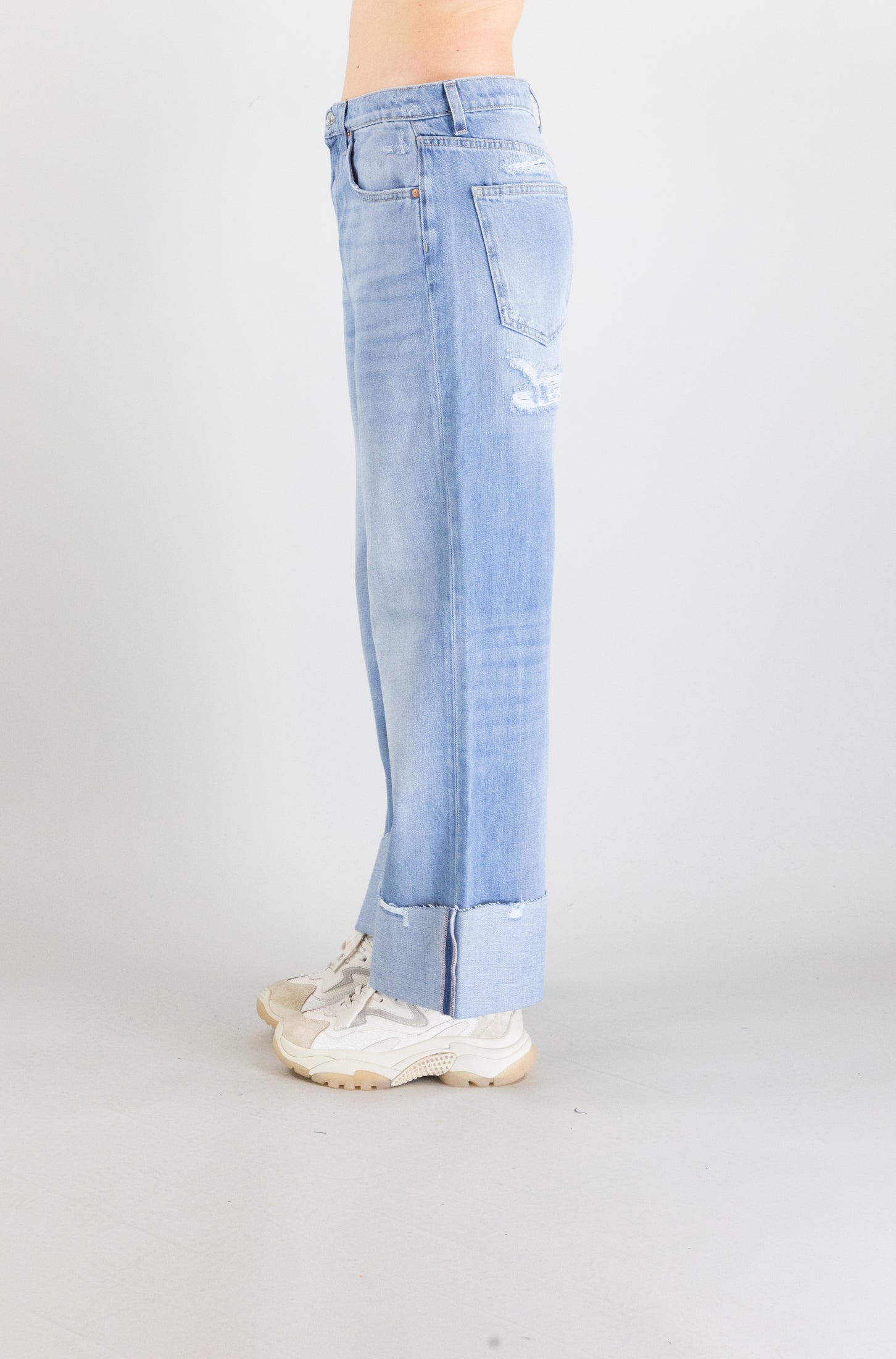 Pantalone lungo in denim Vicolo a vita media con chiusura a bottone e zip e tasche laterali. I grandi risvolti sulla caviglia conferiscono un tocco di originalità e stile. Realizzato in 100% cotone, è il capo perfetto per un look casual e confortevole. La modella indossa la taglia S.