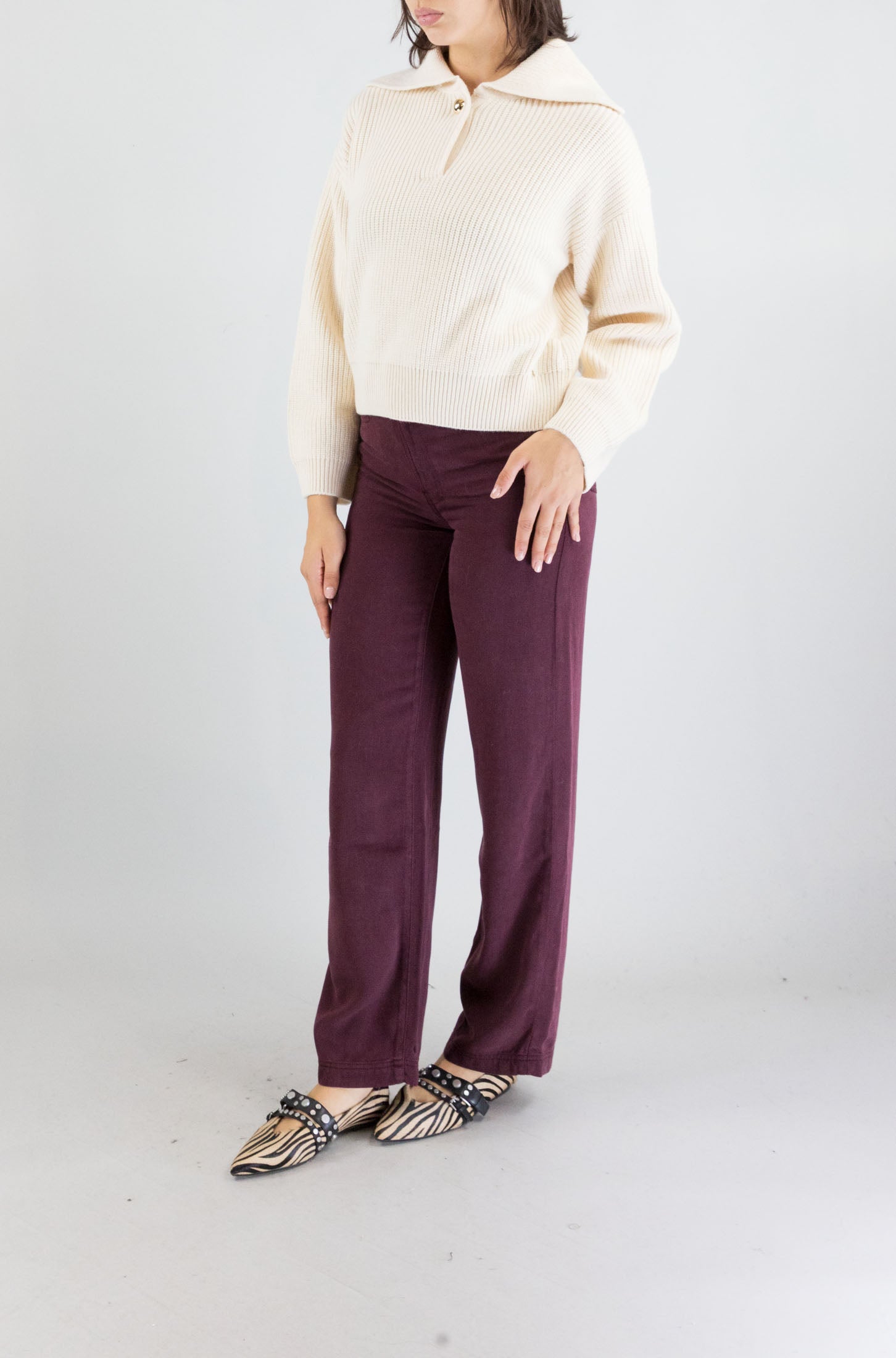 Semplice e raffinata. La maglia bianca Des Petit Hauts, con colletto ampio chiuso da due bottoni, richiama un’eleganza retrò dal fascino discreto. Morbida e calda, è perfetta per look femminili e rilassati.