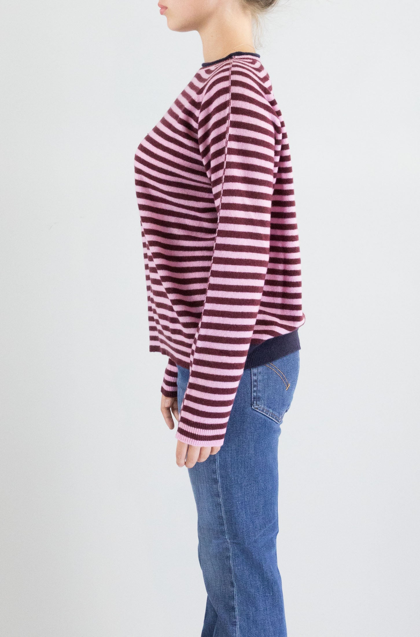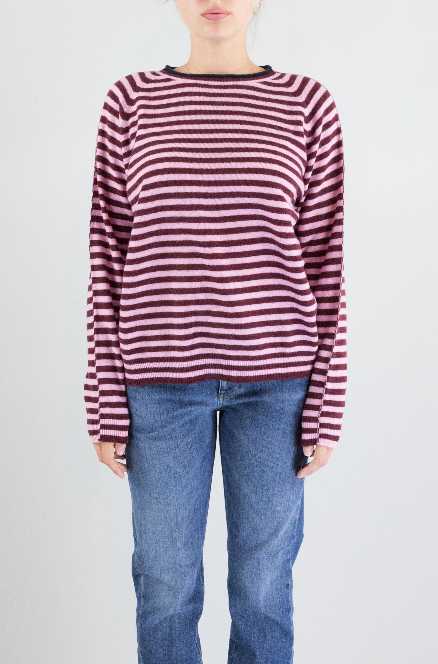 Un tocco artistico al guardaroba. Le righe in toni caldi di rosso incontrano una linea verde a contrasto sul collo rotondo, creando un mix vibrante ma armonioso. Una maglia Floor essenziale e creativa.