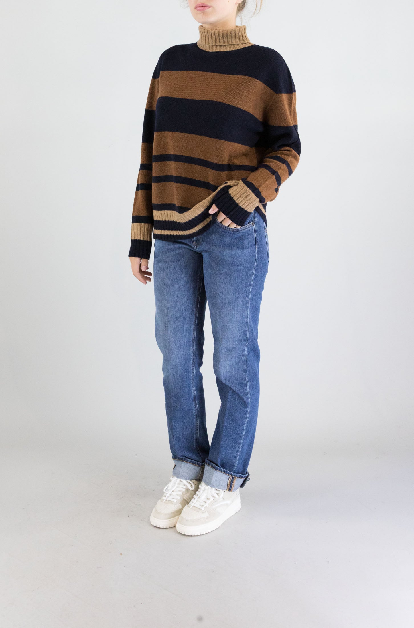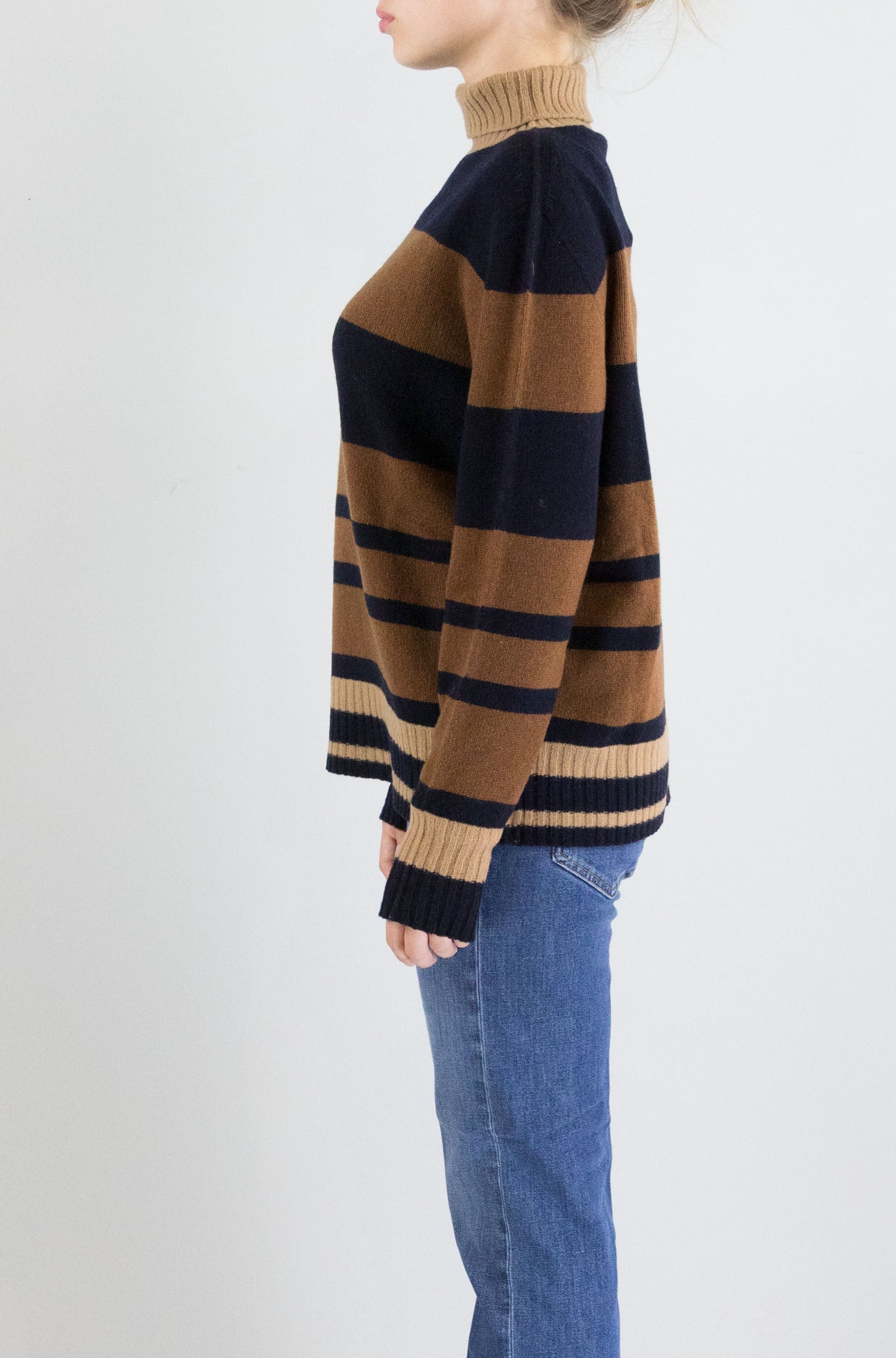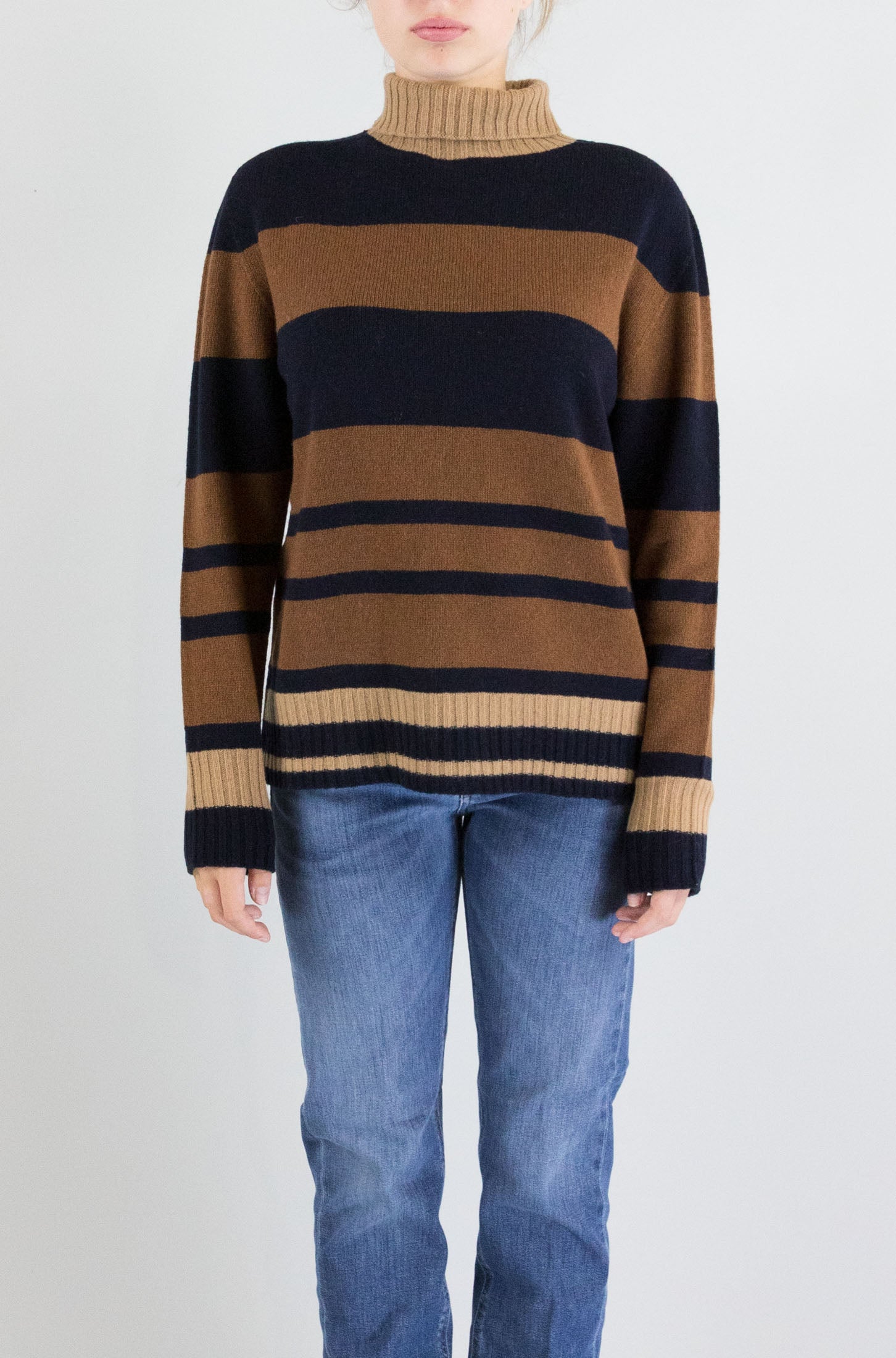 Un gioco di colori eleganti per una maglia che parla di qualità. Il collo alto e le righe nelle tonalità marrone e blu donano carattere, mentre la preziosa combinazione di cashmere e lana avvolge con delicatezza.
