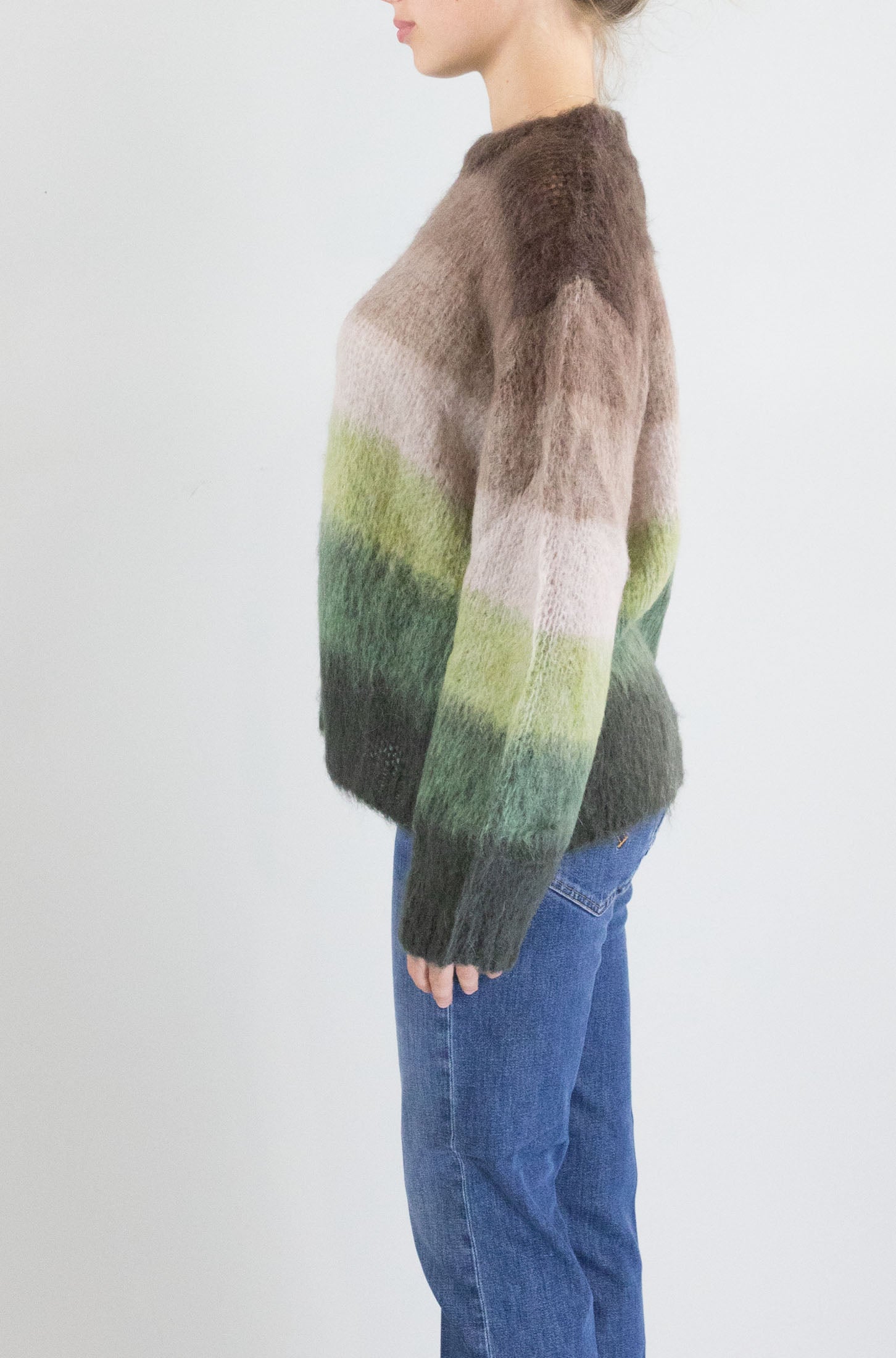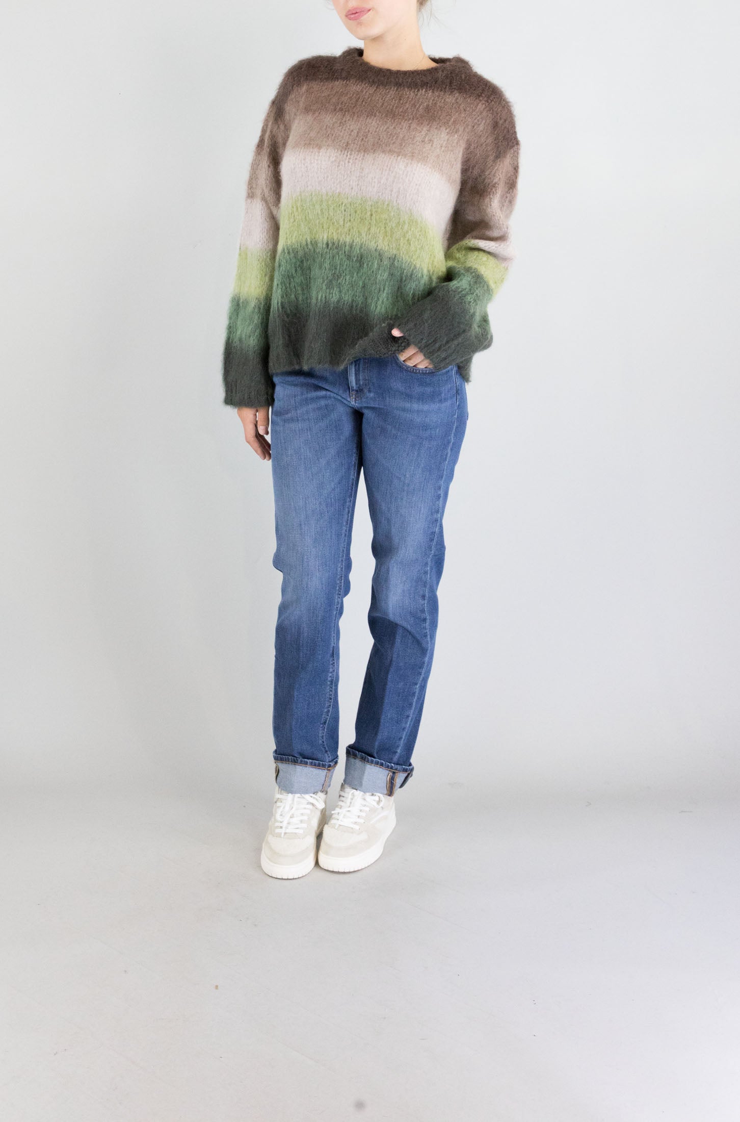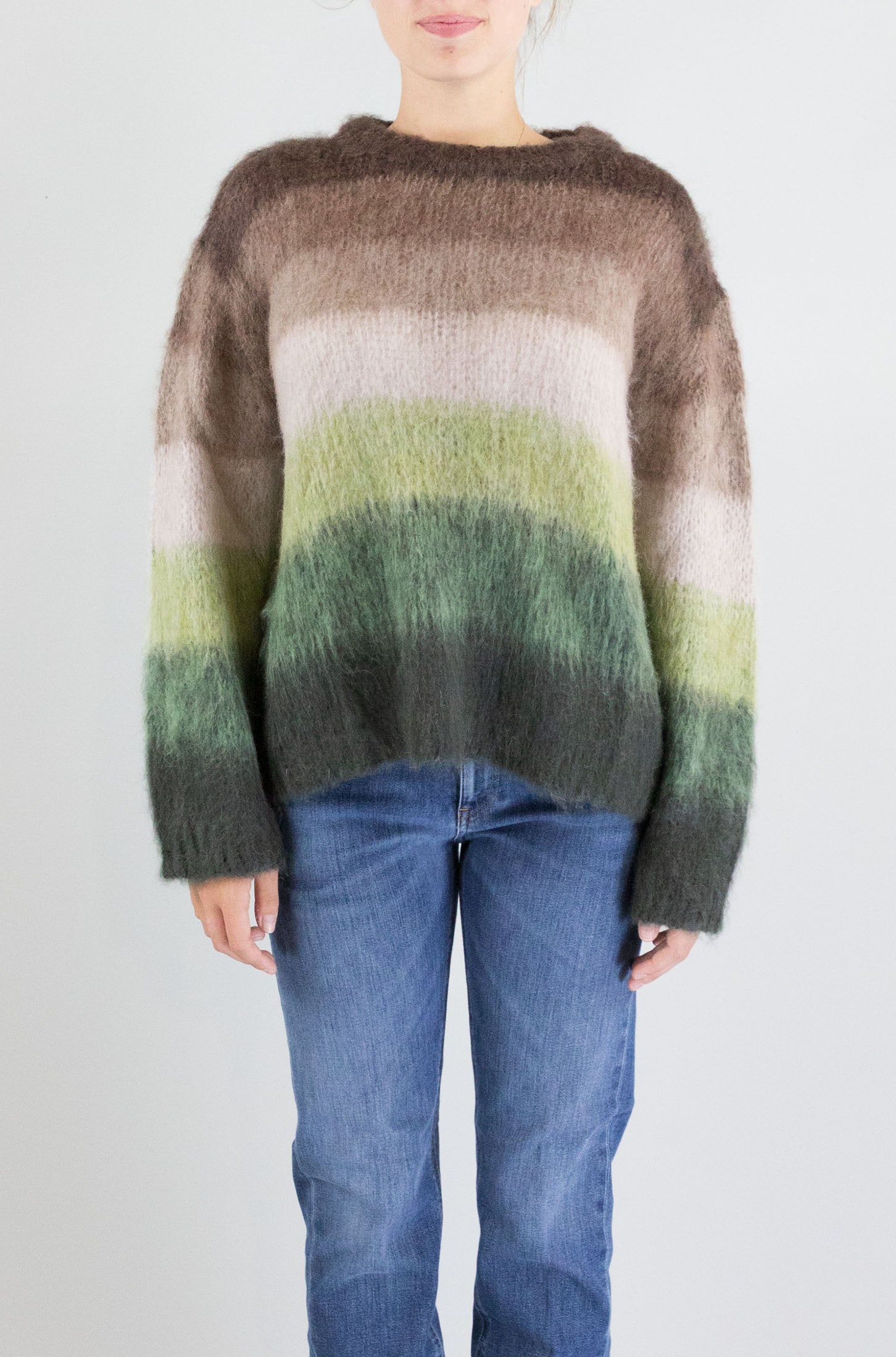 Toni caldi che sfumano con eleganza: la maglia Floor gioca con le righe nei toni del marrone e del verde per un effetto naturale e ricercato. Collo rotondo e manica lunga completano un capo perfetto per le giornate d’autunno.