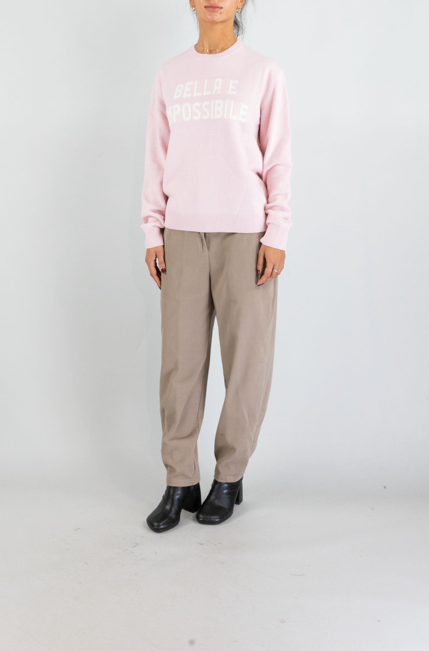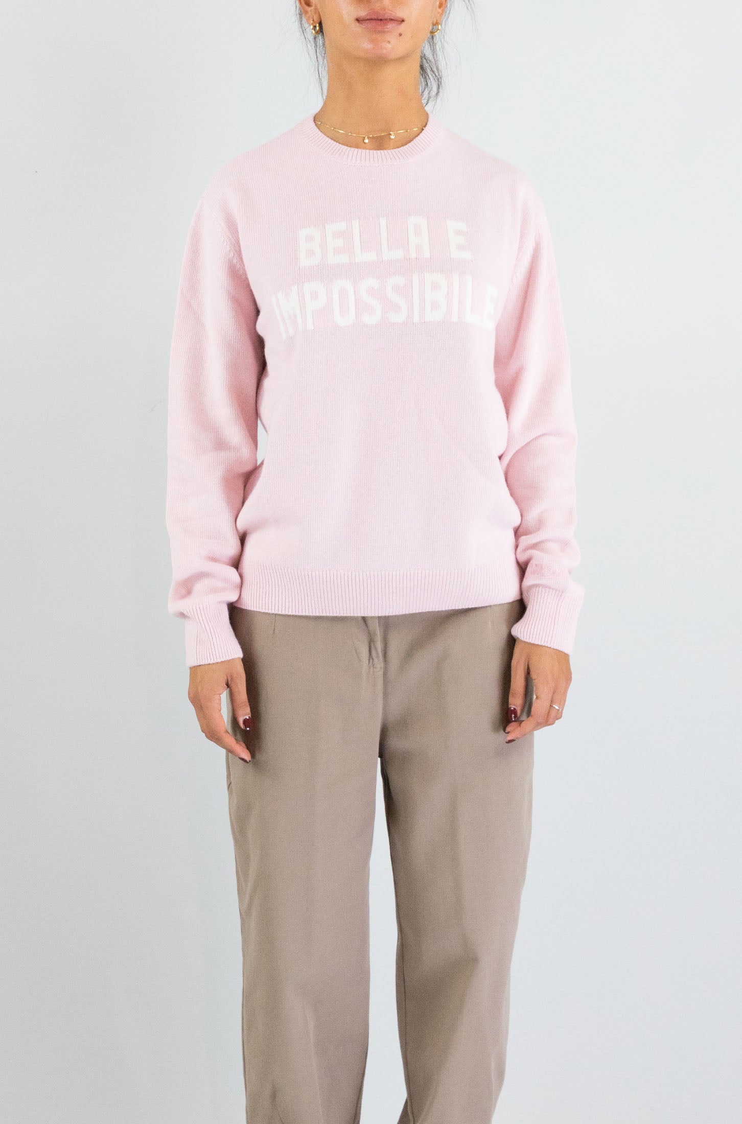 Ispirazione pop e spirito ribelle: la maglia rosa con la scritta “Bella e impossibile” è un inno alla femminilità libera e audace. Un capo caldo e confortevole, perfetto per dare un tocco ironico al look.