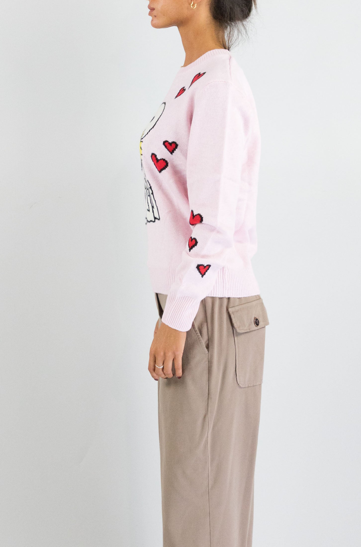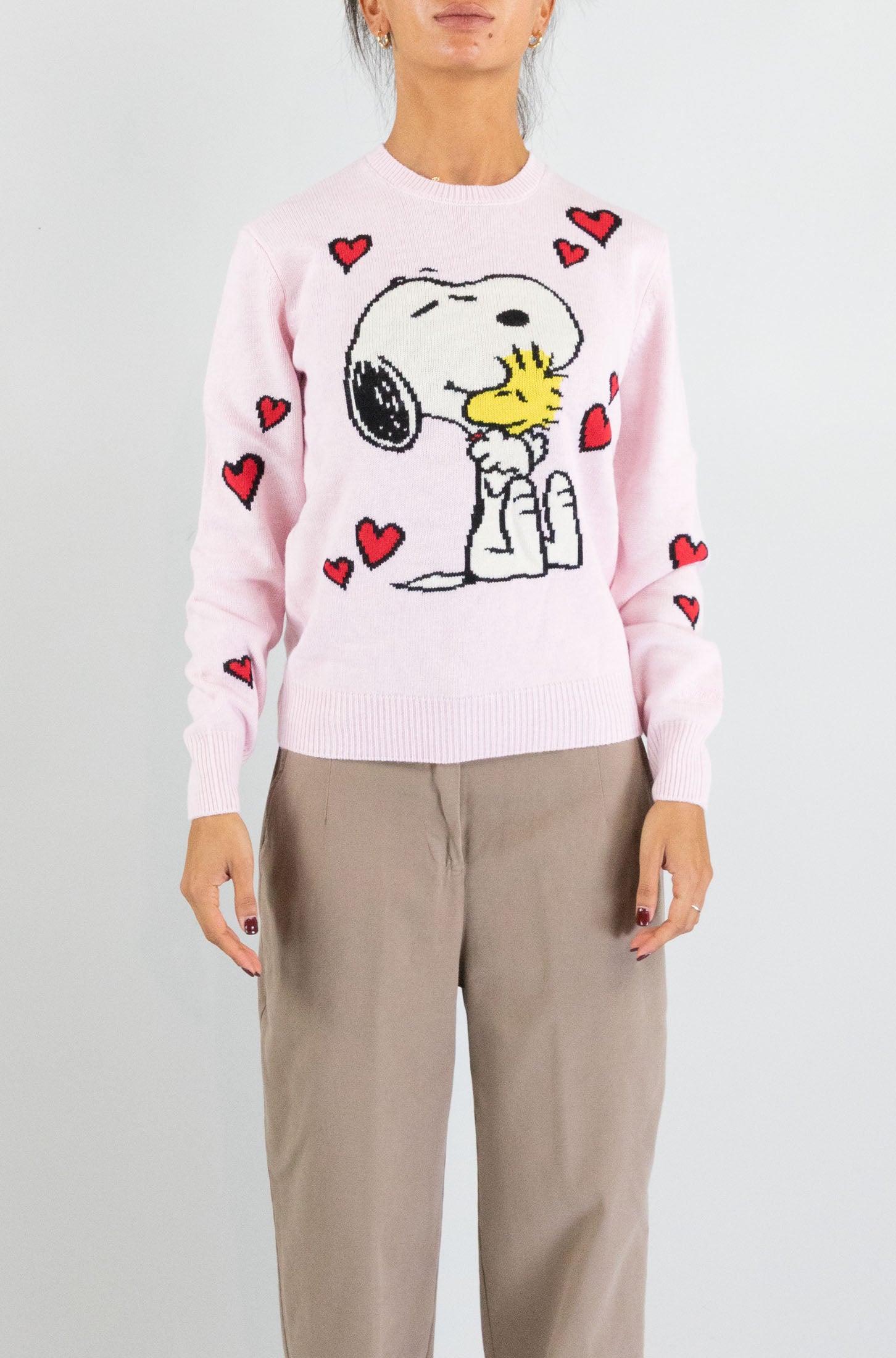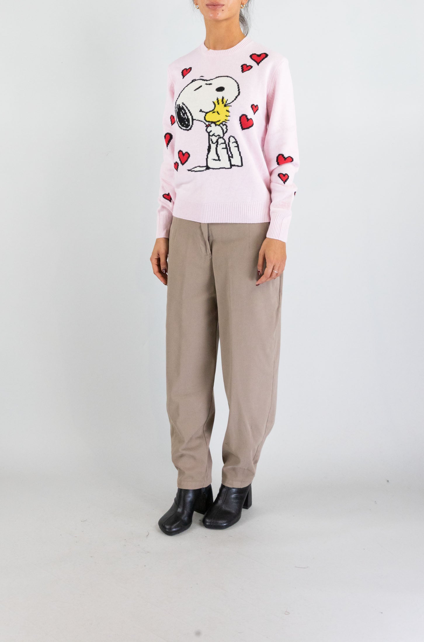 Dolcezza a maglia. La grafica Snoopy sulla maglia rosa è un tocco playful che si unisce a un filato morbido e caldo, perfetto per coccolarsi nei giorni più freddi.