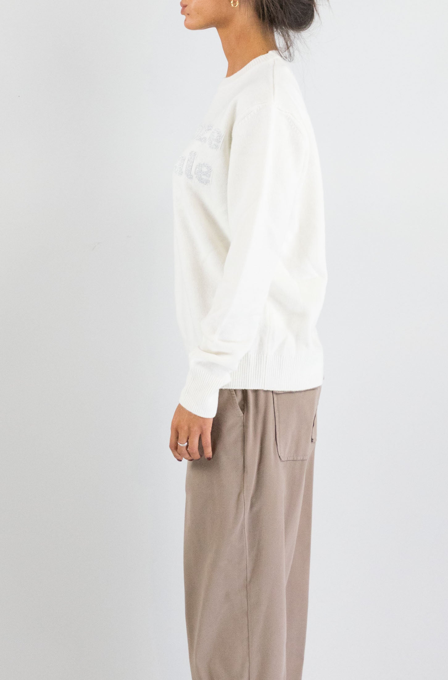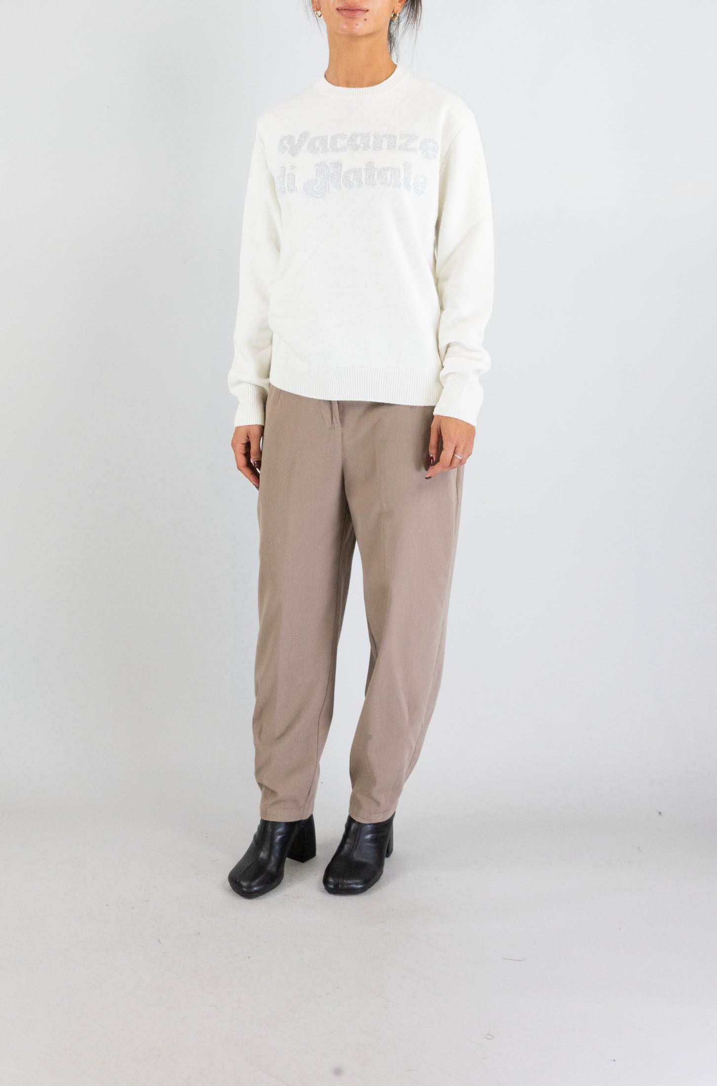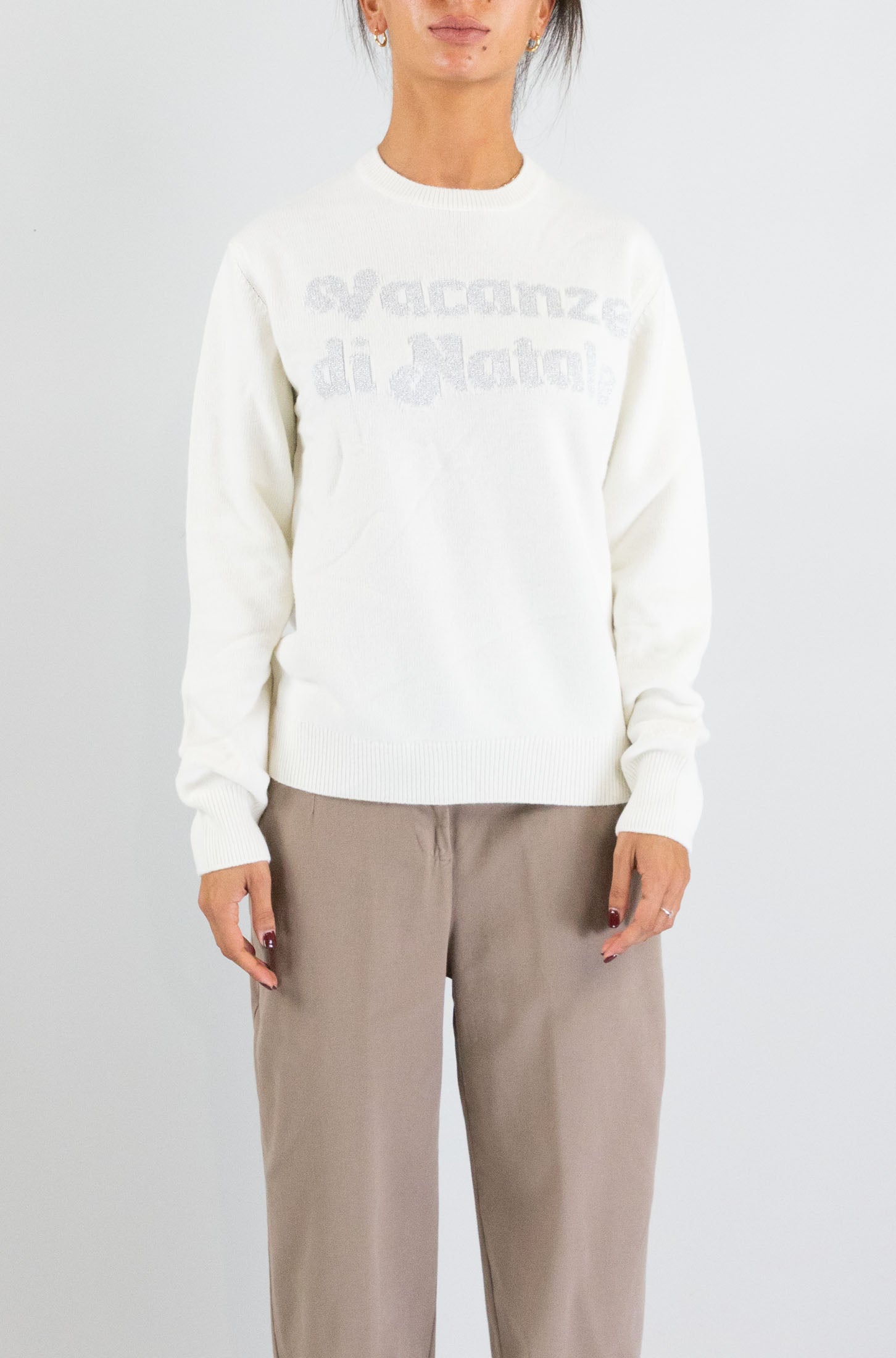La versione più chiara e luminosa della classica maglia natalizia. Con scritta rossa in evidenza e taglio rilassato, è perfetta per un mood festivo ma sofisticato.