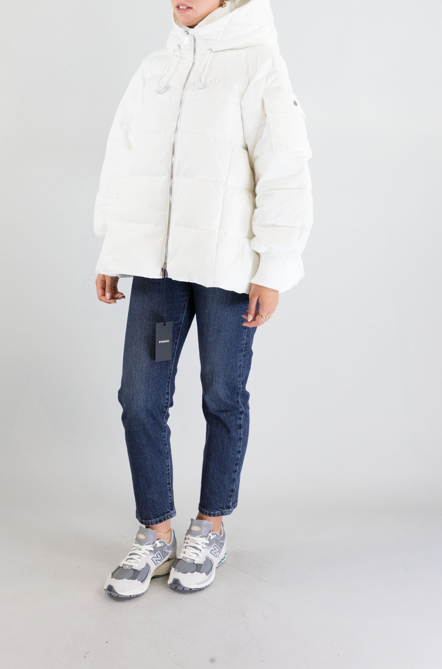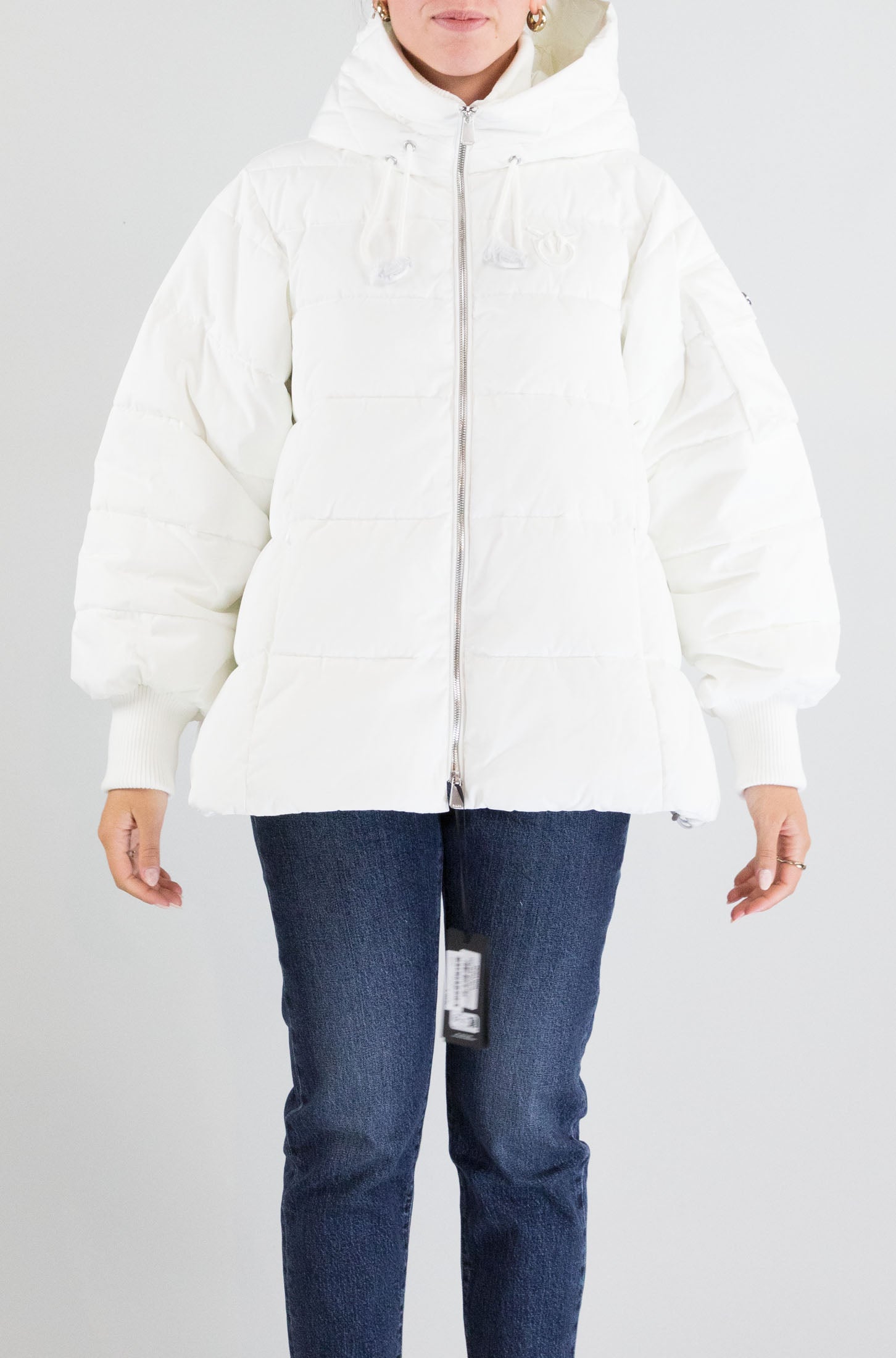 Il piumino bianco Pinko è un capo ampio e confortevole, perfetto per affrontare l'inverno con stile. Con maniche lunghe e cappuccio, la chiusura a zip e le tasche laterali lo rendono estremamente pratico. Il tessuto 100% poliestere garantisce leggerezza e resistenza, mantenendo il corpo caldo anche nelle giornate più fredde. La modella indossa la taglia S.