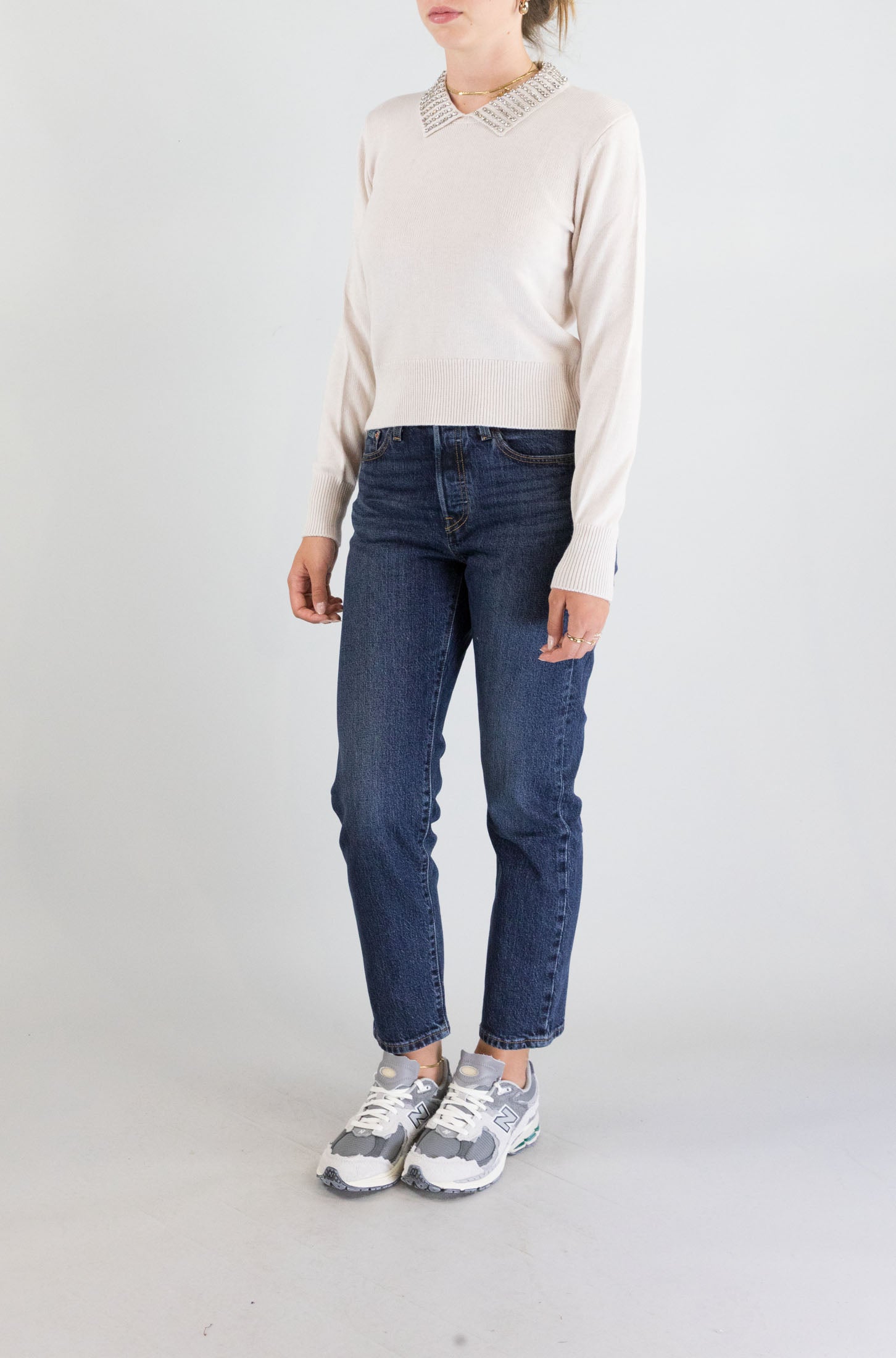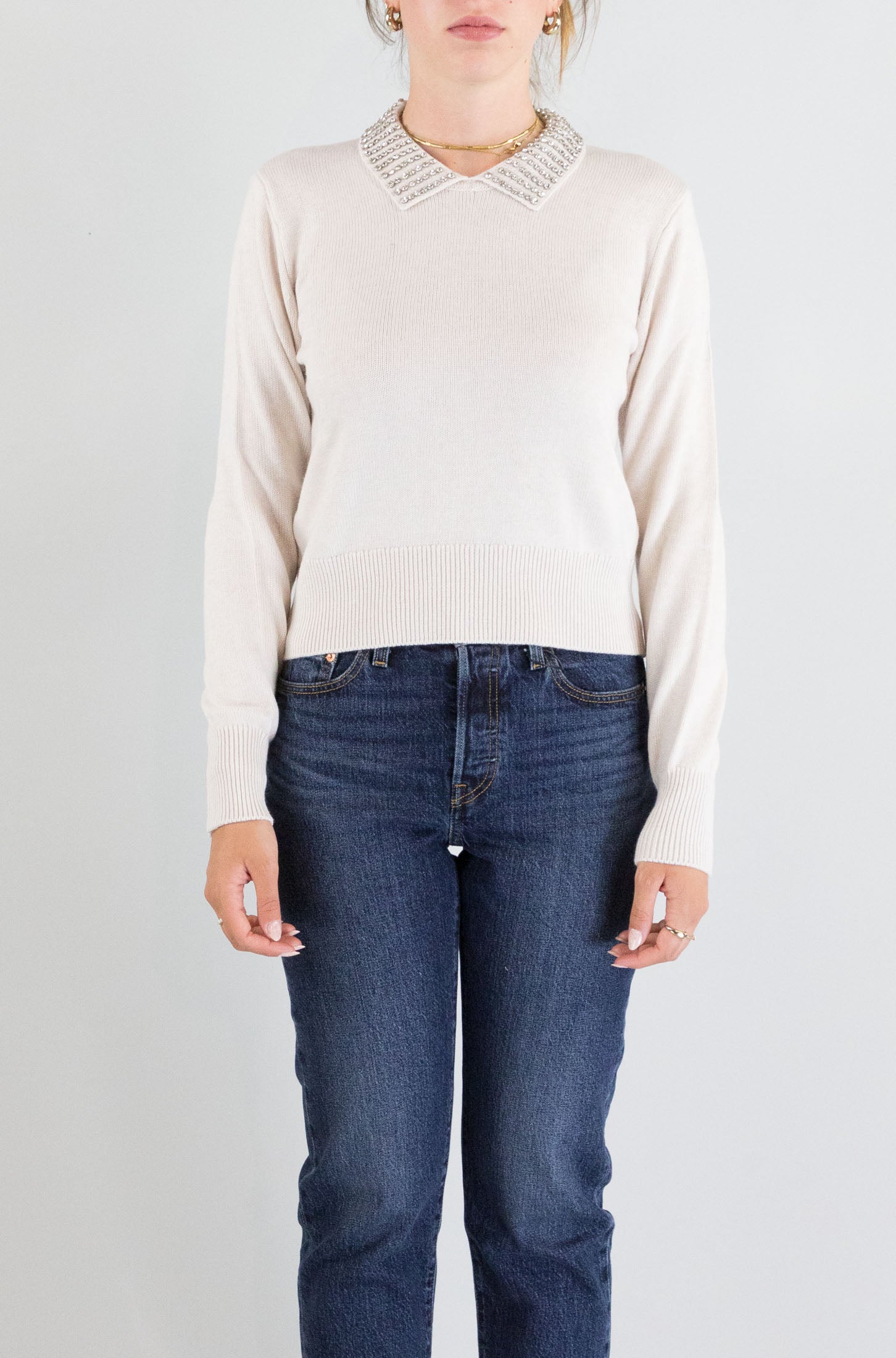 Elegante e sofisticata, la maglia bianca Pinko con maniche lunghe e colletto con mini borchie è un capo versatile e chic. Realizzata in 100% lana vergine, offre una vestibilità comoda e raffinata, perfetta per ogni occasione. Il colletto con le borchie dona un tocco di carattere, mentre il tessuto in lana assicura calore e comfort. La modella indossa la taglia S.