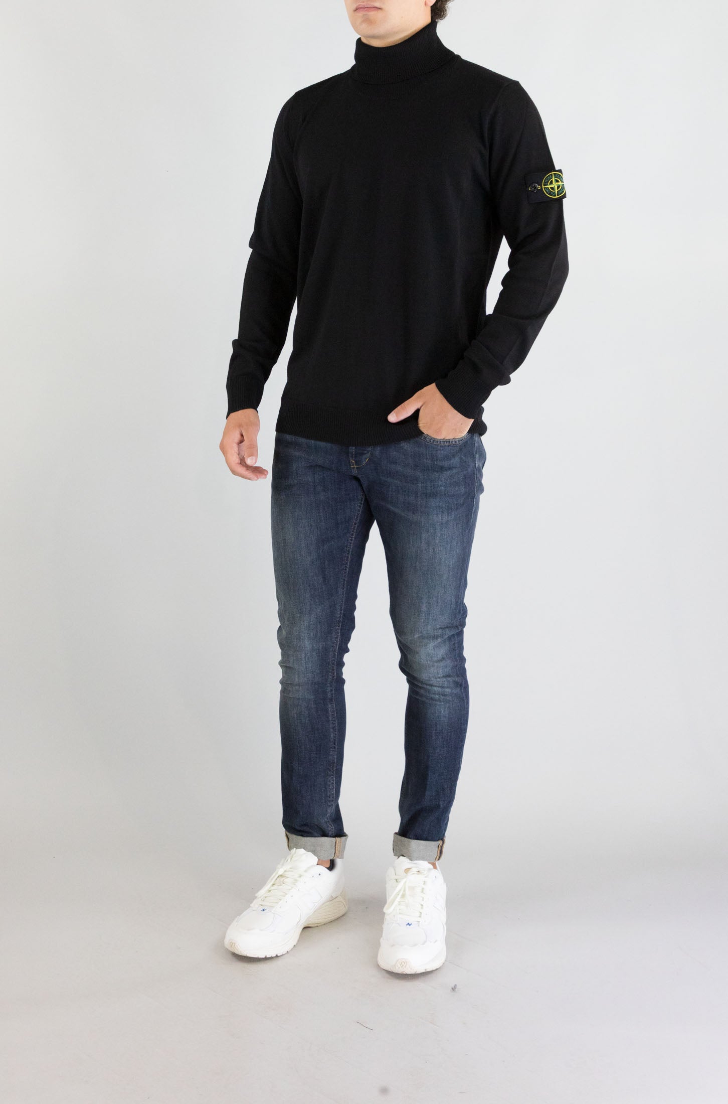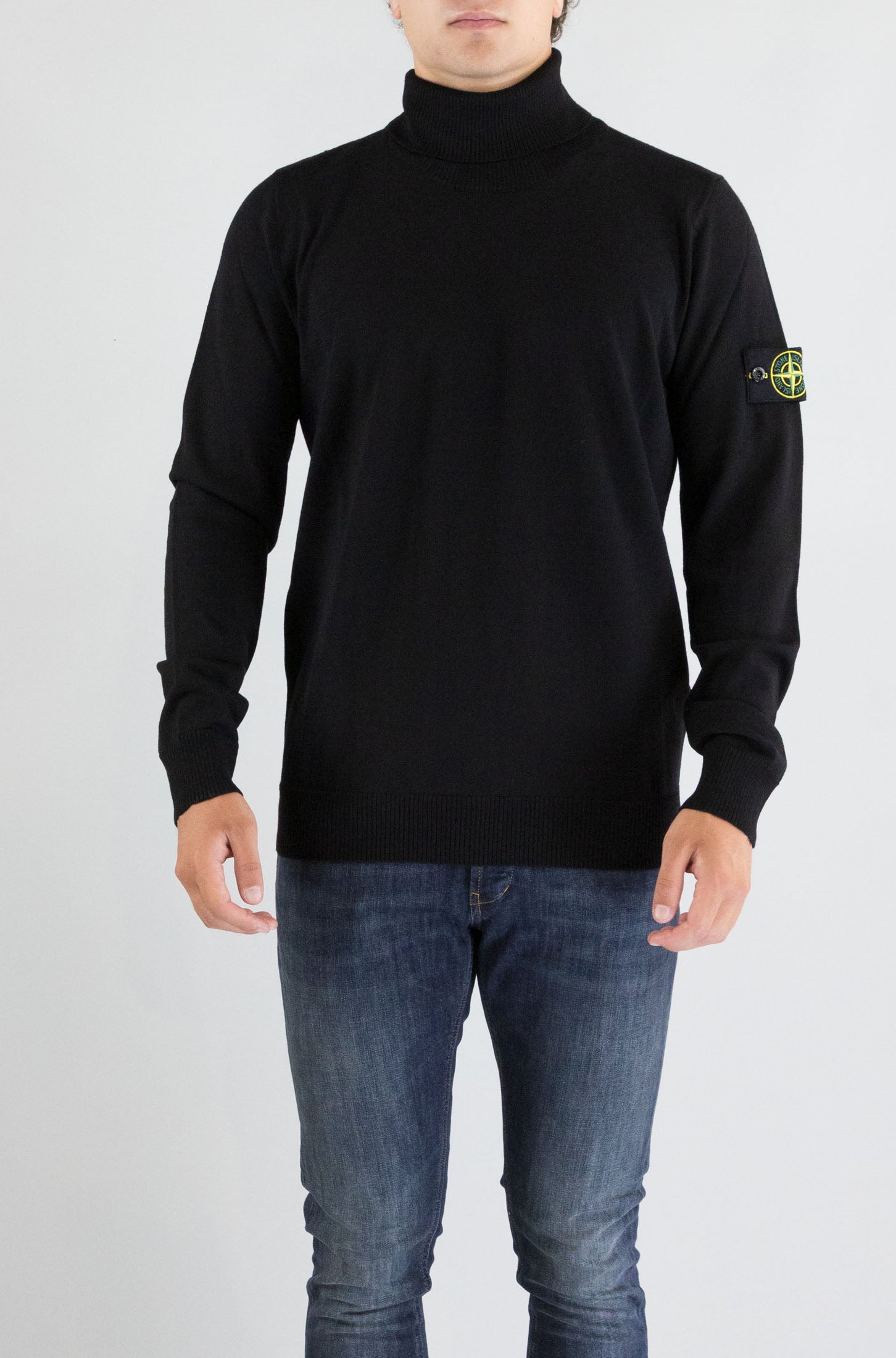 La maglia nera di Stone Island con manica lunga e colletto alto è perfetta per chi cerca un look elegante ma funzionale. Il logo badge sul braccio sinistro sottolinea il design distintivo, mentre il tessuto in 100% lana vergine garantisce comfort e calore. Il modello indossa la taglia L.