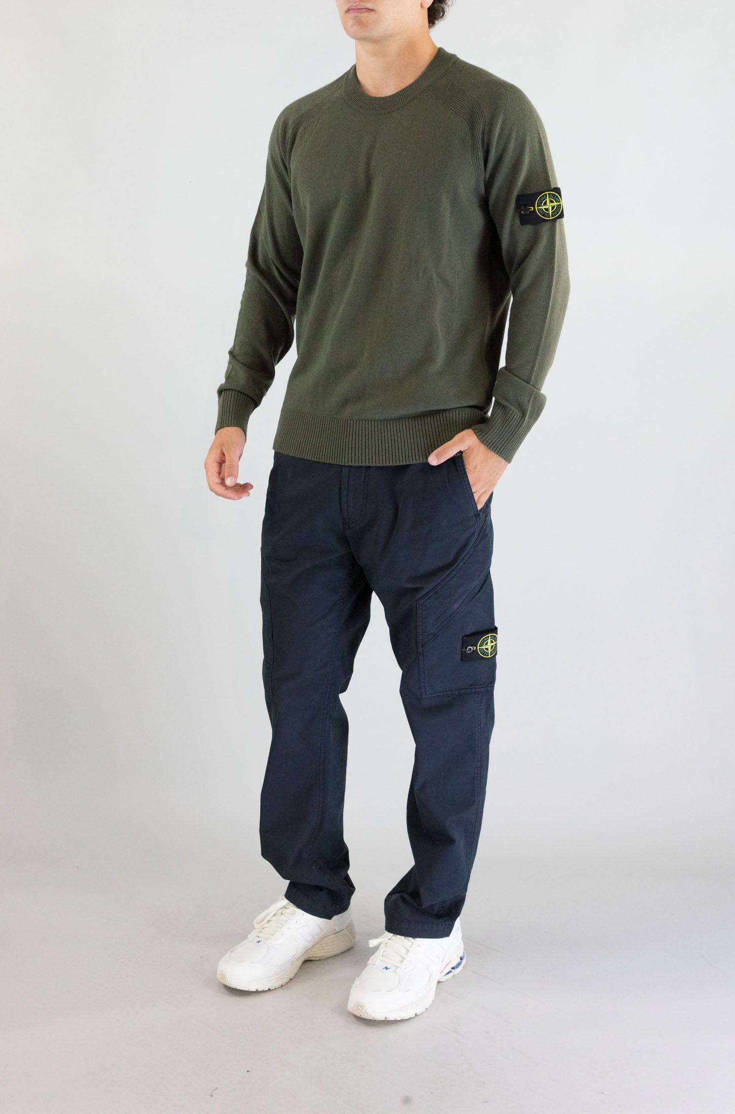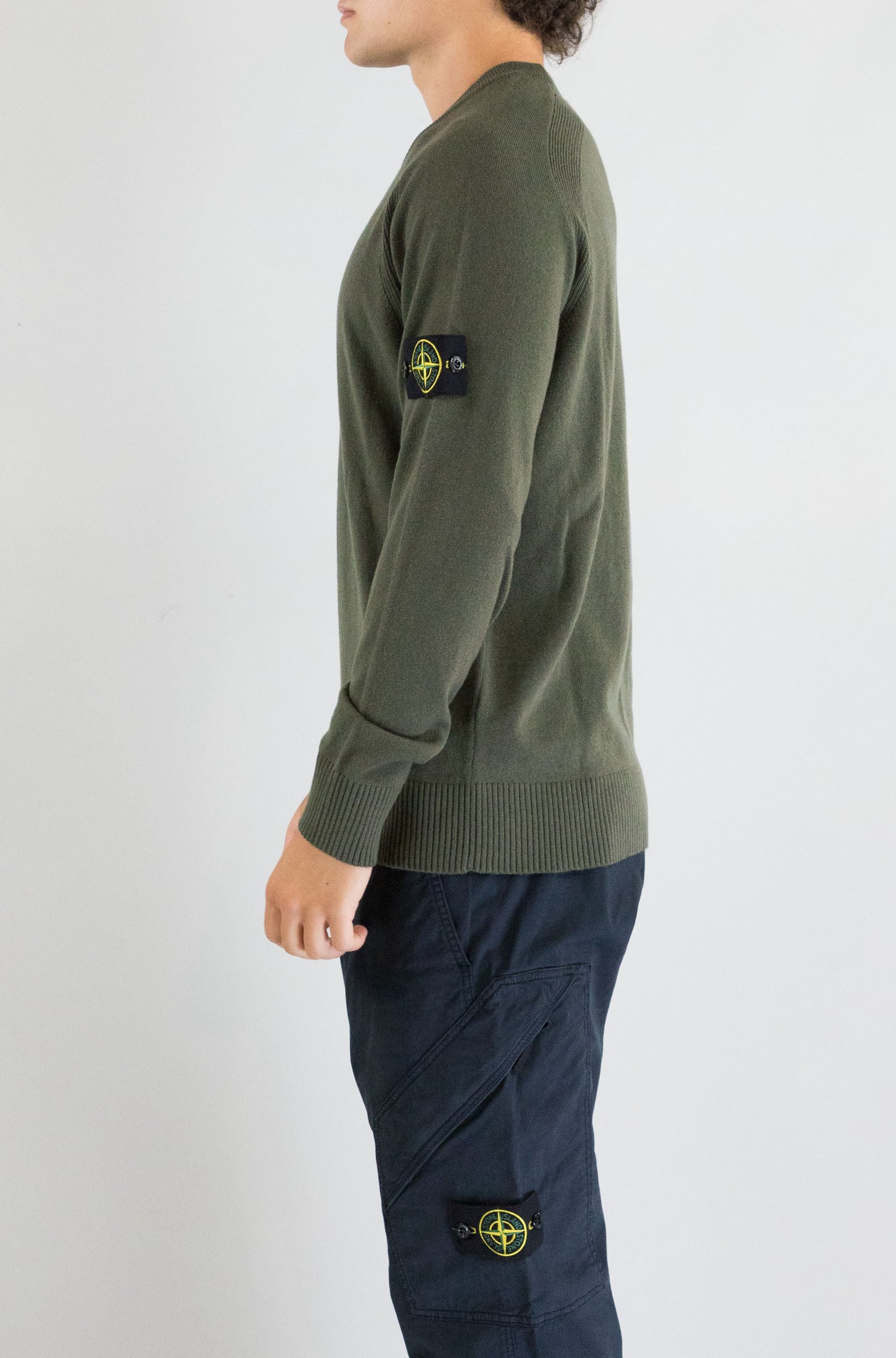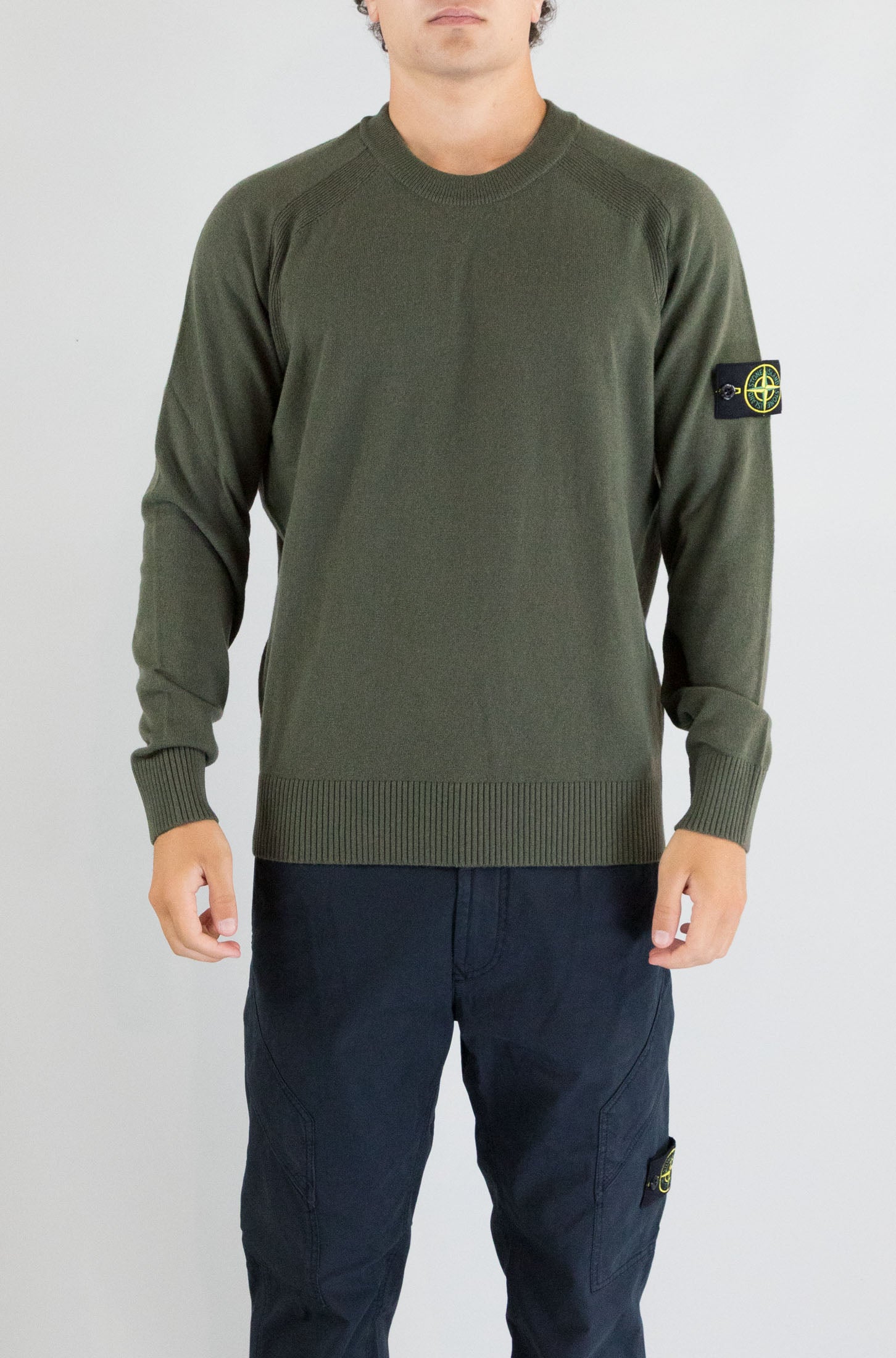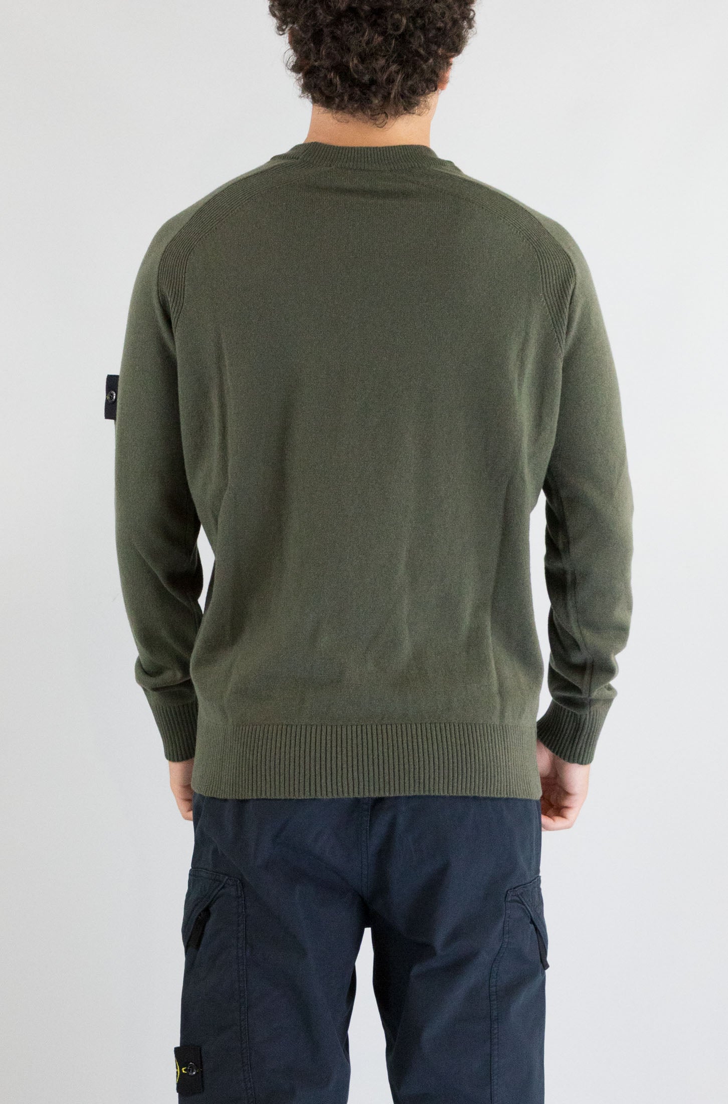 Questa maglia verde Stone Island con manica lunga e collo tondo è perfetta per aggiungere un tocco di colore e comfort al tuo look. Il logo badge sul braccio sinistro rappresenta l'alta qualità del marchio. Realizzata in 100% lana vergine, offre una vestibilità morbida e calda, ideale per ogni stagione. Il modello indossa la taglia L.