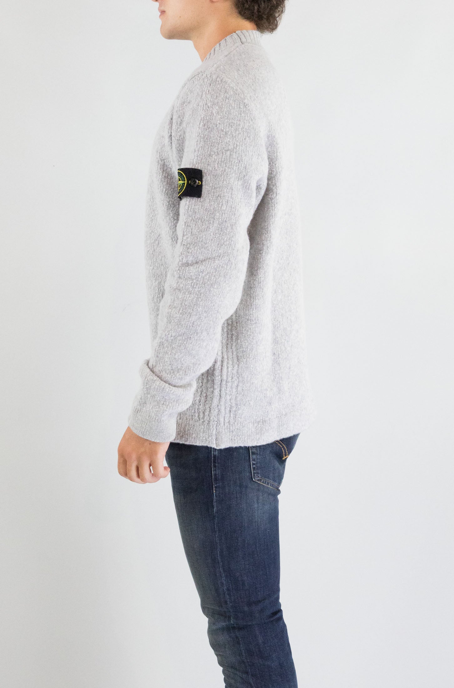 Questa maglia grigia di Stone Island è un must-have per un look casual ma raffinato. Con maniche lunghe e collo tondo, il logo badge sul braccio sinistro aggiunge un tocco di autenticità. Realizzata in un mix di 58% lana e 42% poliammide, è calda e confortevole. Il modello indossa la taglia L.