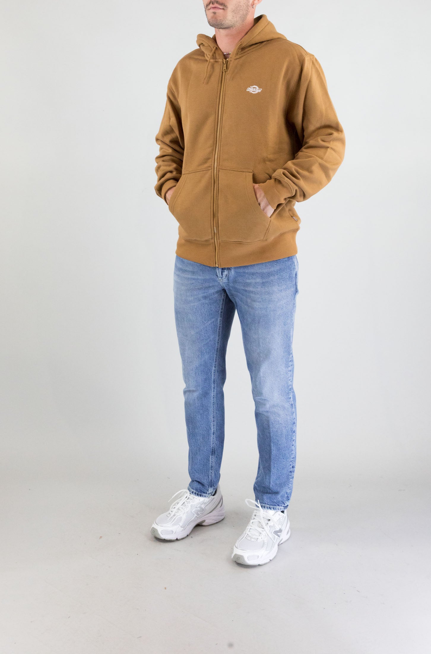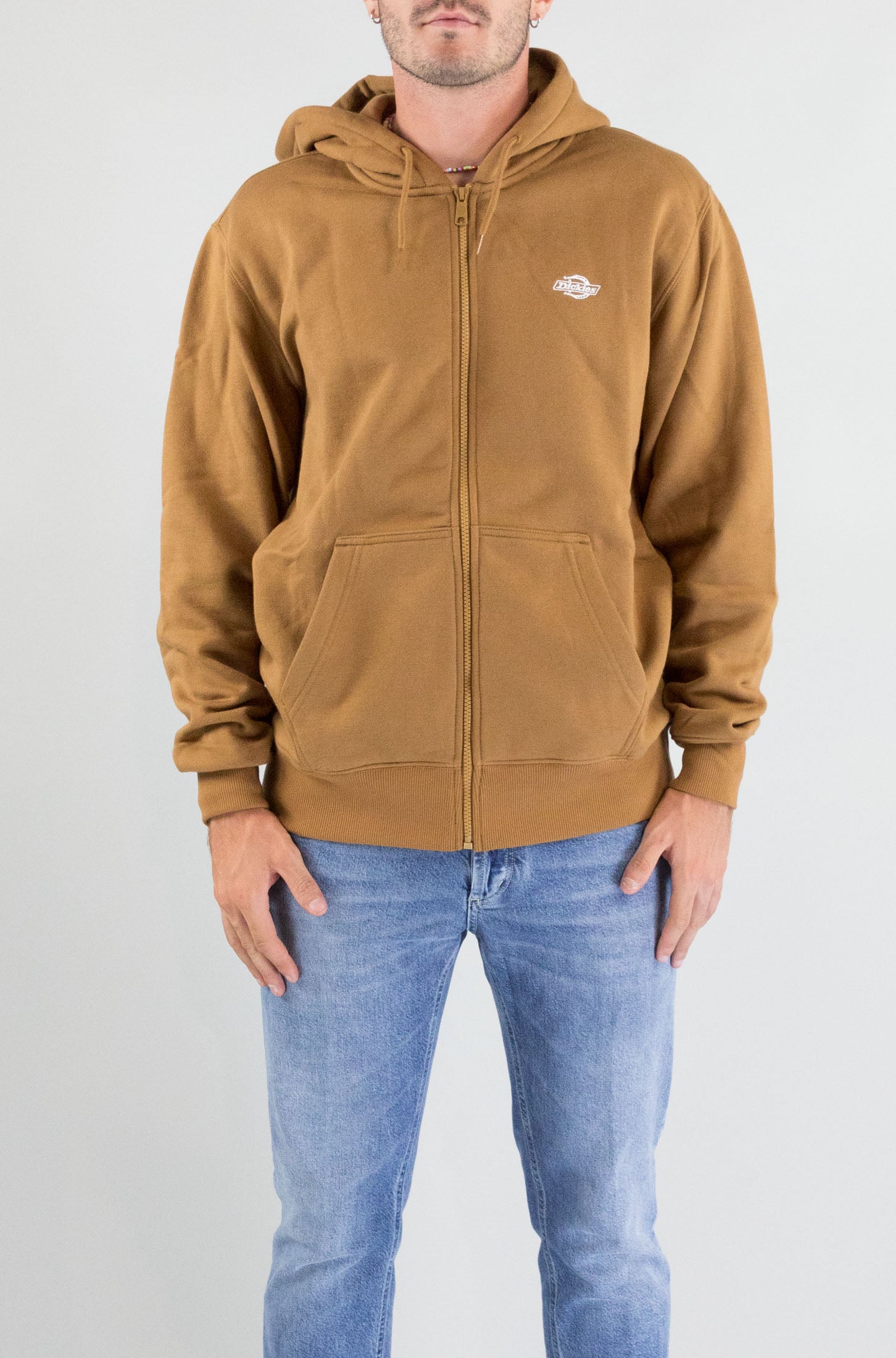 Un’icona di comfort in versione zip. Felpa beige Dickies con maniche lunghe, cappuccio regolabile e chiusura frontale a zip. Tasche laterali e mini logo sul petto. Realizzata in puro cotone per uno stile casual e autentico.