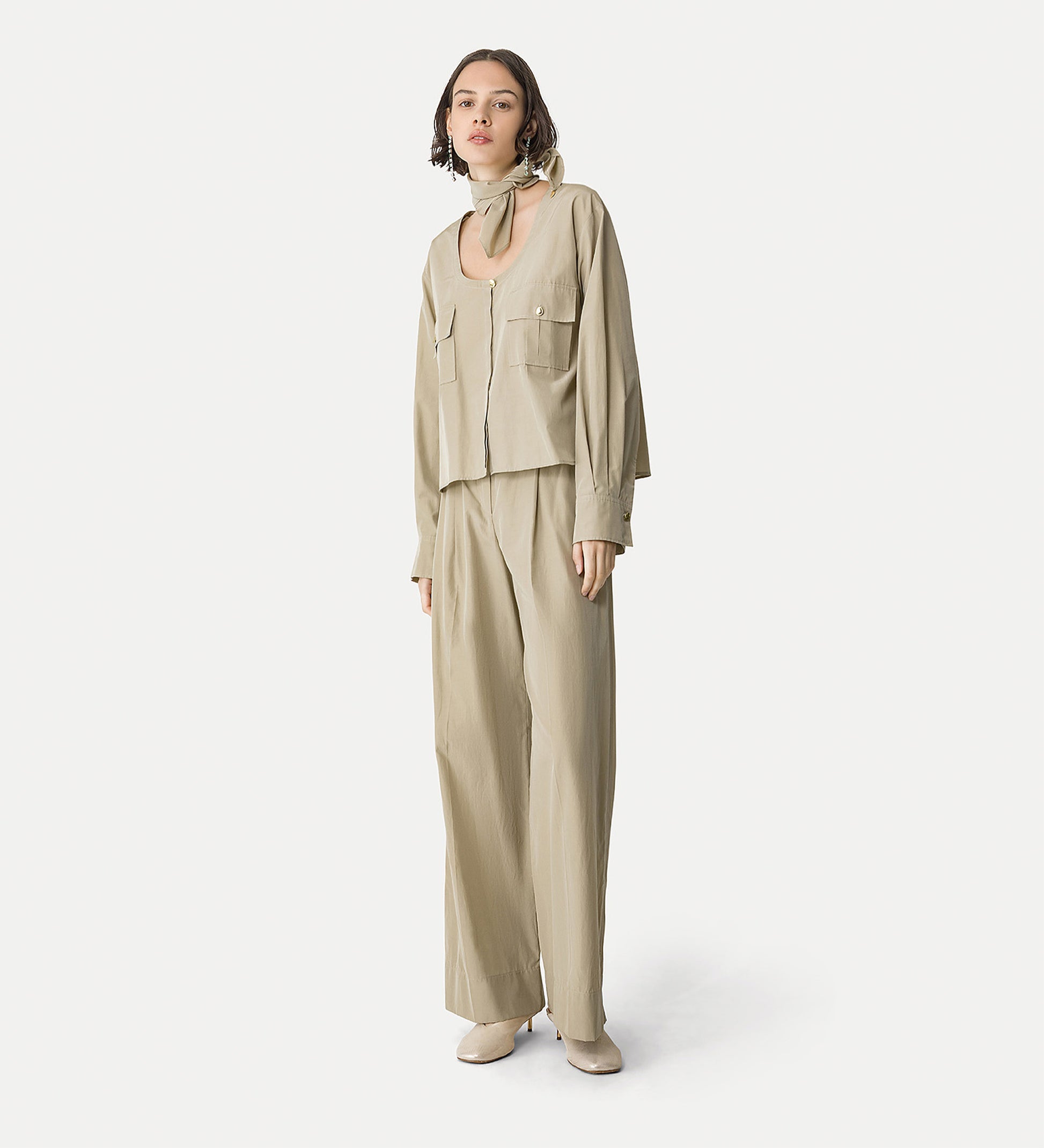pantalone a vita alta in taffetà chic, con linee ampie e dritte sulla gamba che compongono una nuova silhouette metropolitana. facile da abbinare alle camicie e ai top leggeri di primavera, il pantalone in taffetà si chiude con doppio gancio a uomo in vita e con elastico sul retro, per un comfort e un look da scegliere giorno dopo giorno.