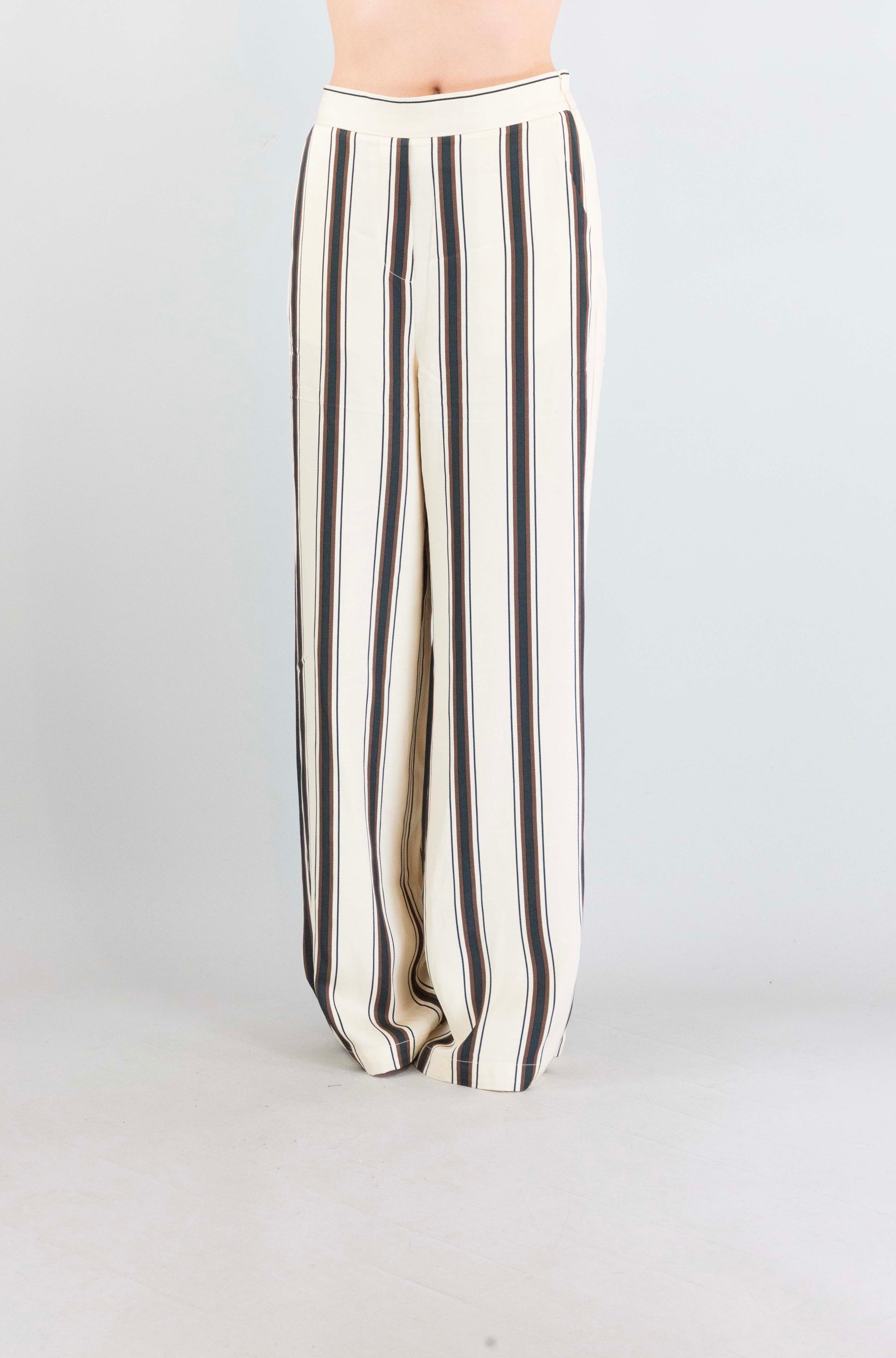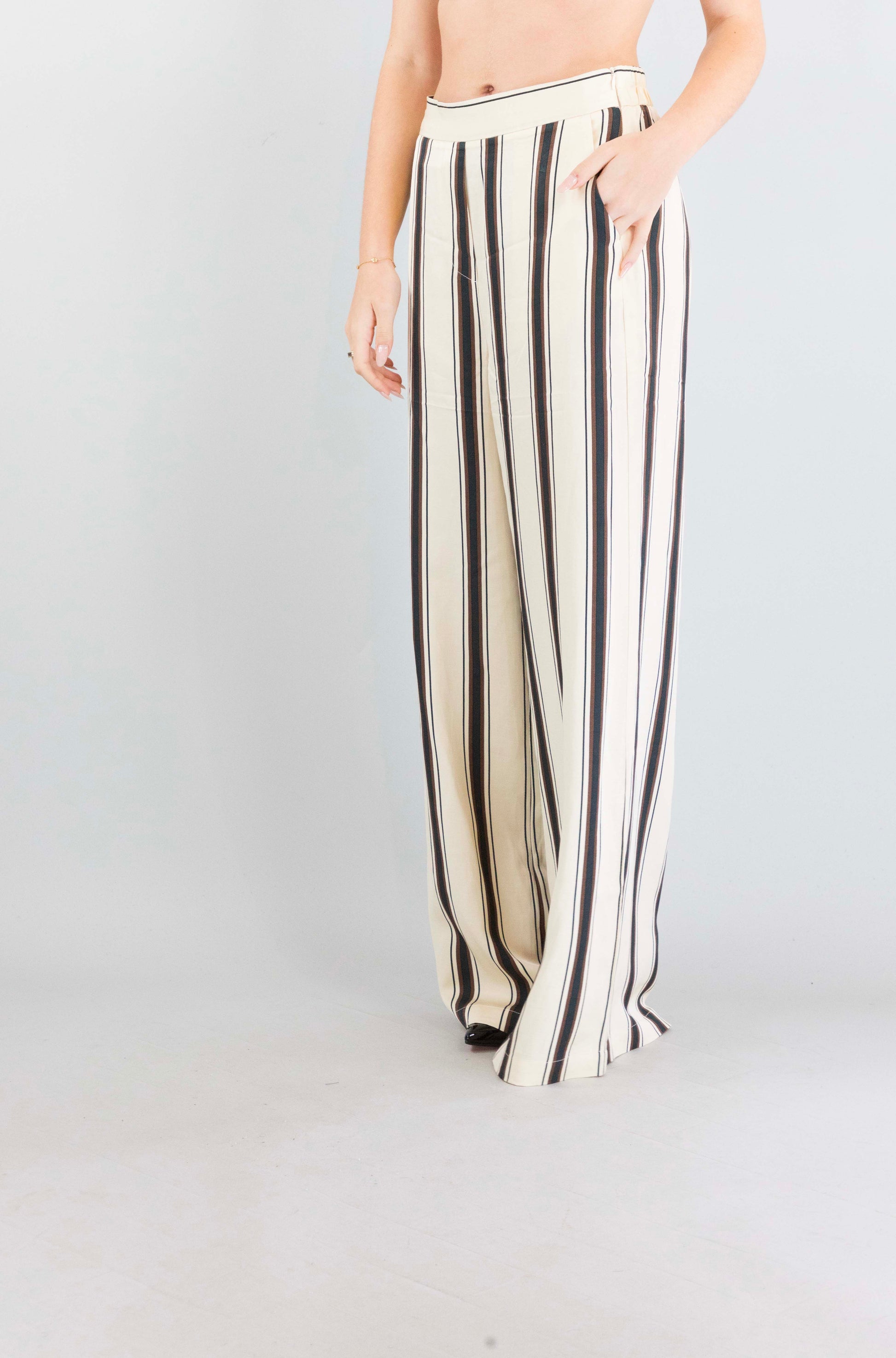Ricercato e sofisticato. La vita alta e la linea fluida slanciano la figura, mentre le righe nere donano carattere e dinamismo al look.