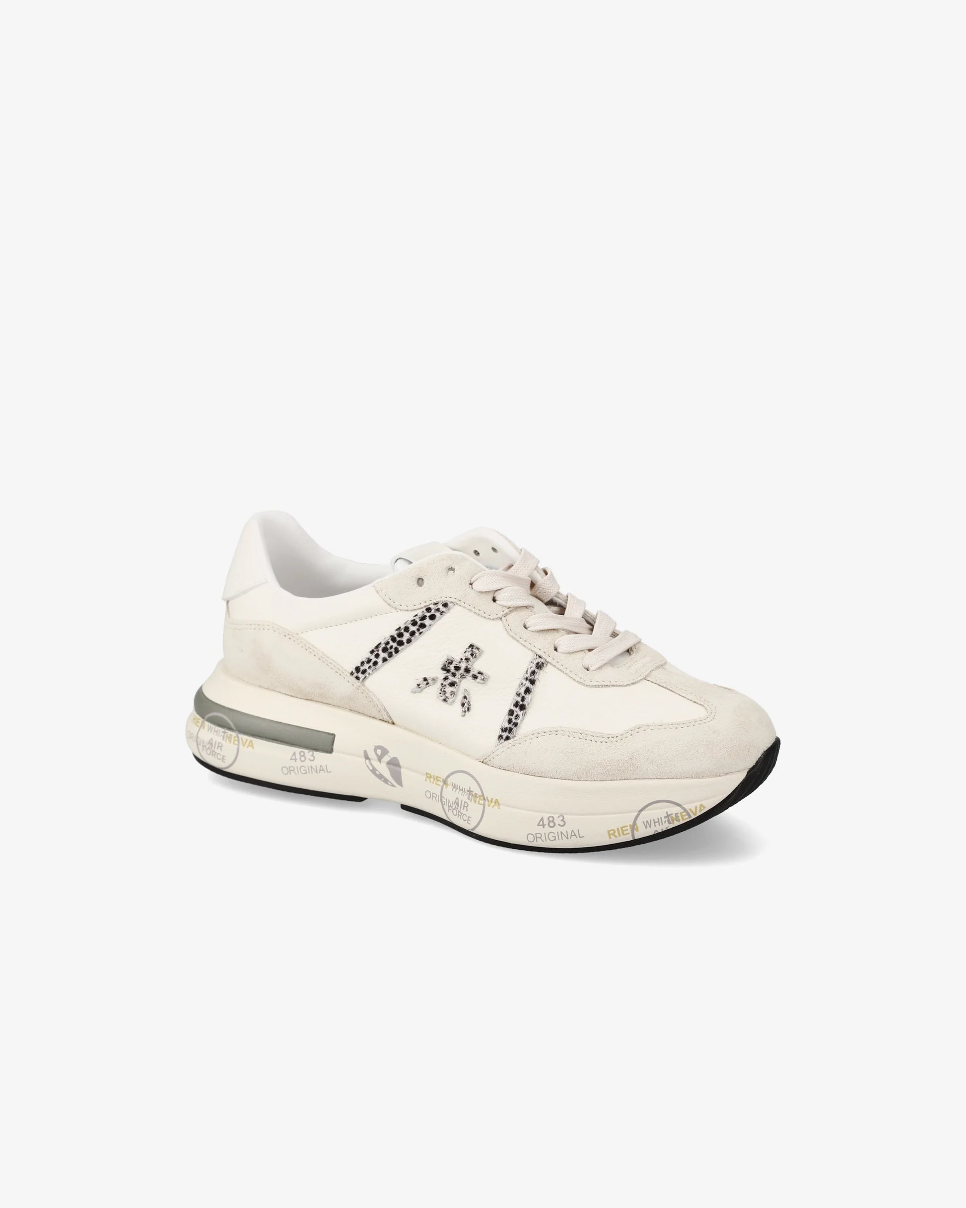 Sneaker Premiata in tonalità beige e off-white con tomaia in pelle scamosciata e tessuto. Logo laterale e suola con timbri distintivi del brand. Design pulito e versatile, ideale per un look casual raffinato.