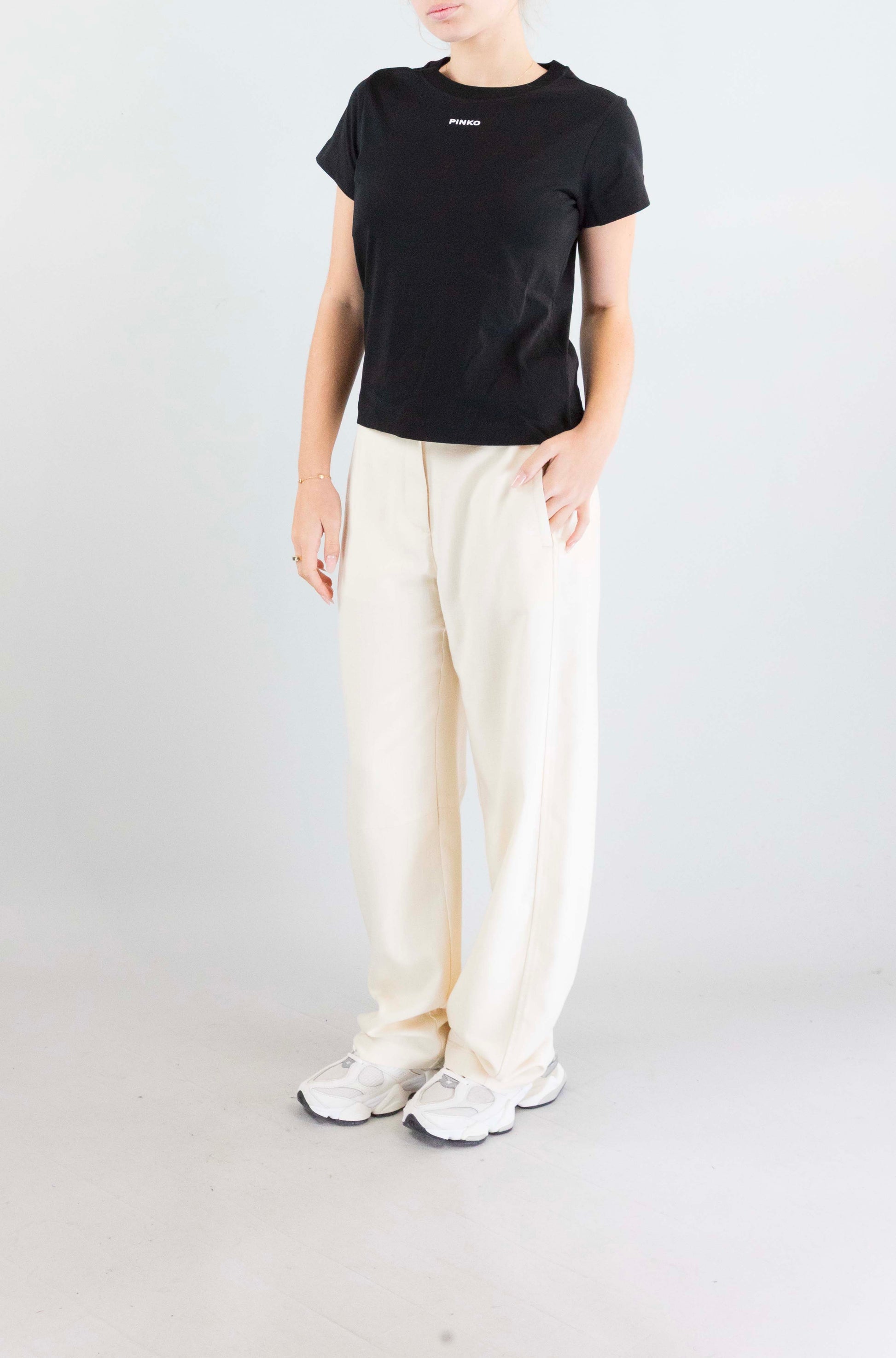Minimal ma d’impatto. La t-shirt nera Pinko con logo sul petto è un capo versatile che unisce semplicità e personalità, ideale da abbinare a denim o pantaloni sartoriali.