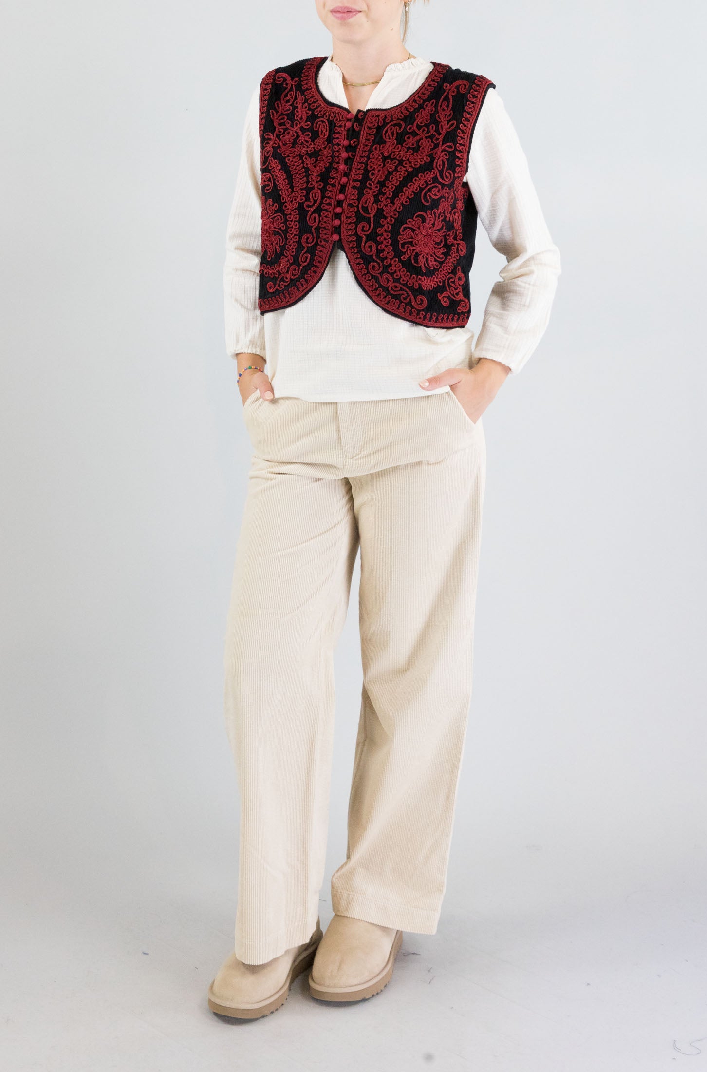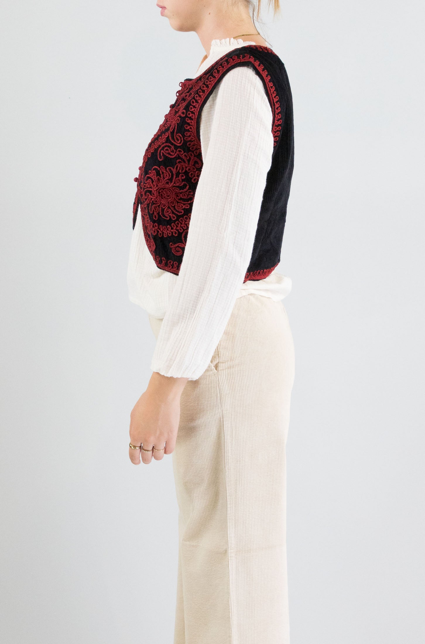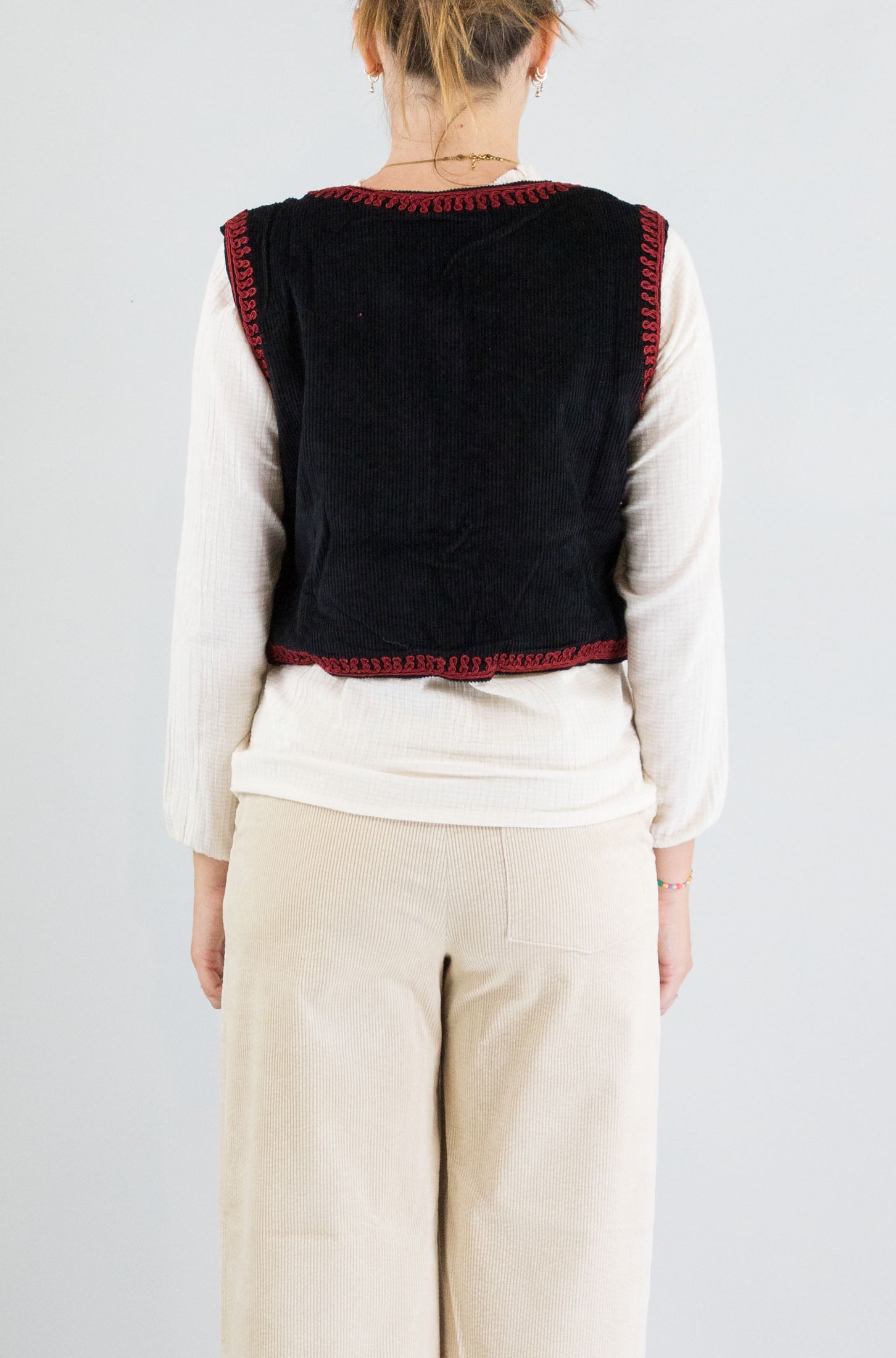 Dettaglio artigianale, spirito bohémien. Gilet smanicato nero Maison Hotel con ricami rossi allover, collo pari e chiusura a bottoni. Un capo che racconta una storia in ogni punto.
